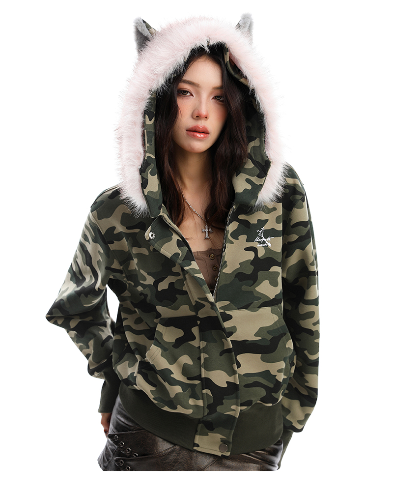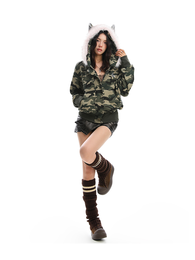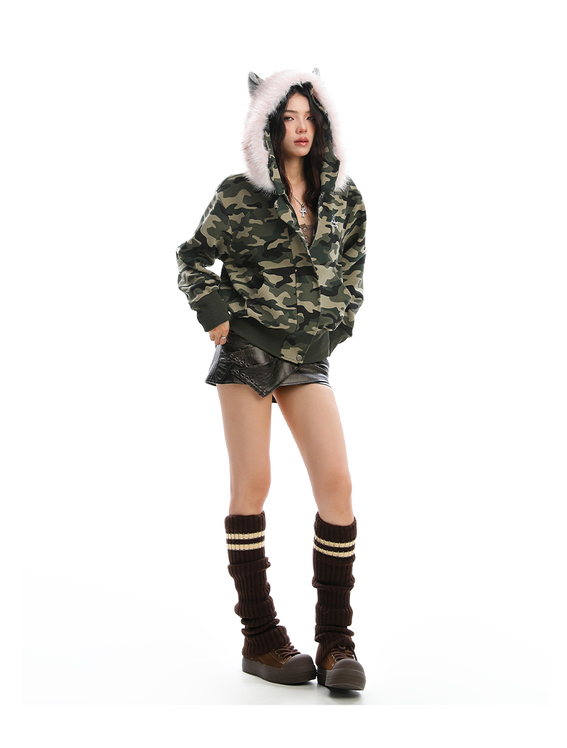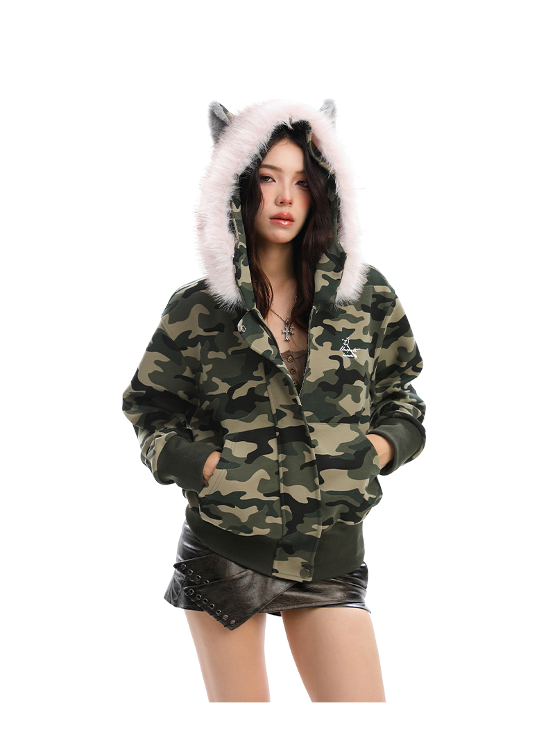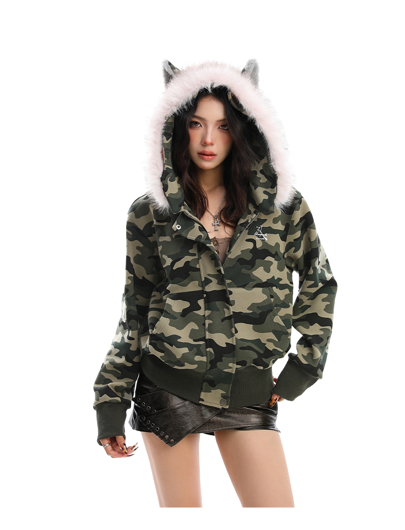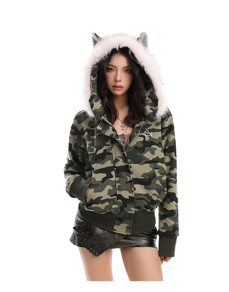 Camouflage Detachable Plush Collar Hooded Sweater Women's Cardigan Short Coat