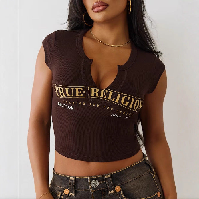 Cropped Slim-fit Letter-print Midriff-baring T-shirt For Women
