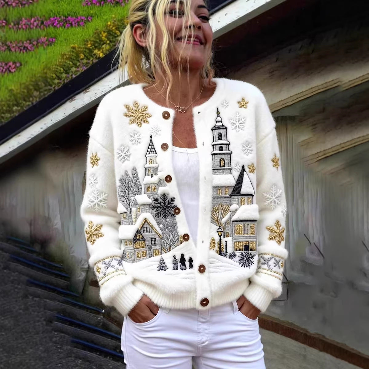 Knitted Cardigan Sweater Coat In A Snowman Style Short Length Single Breasted With A Crew Neck