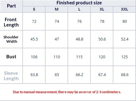 1. Asian sizes are 1 to 2 sizes smaller than European and American people. Choose the larger size if your size between two sizes. Please allow 2-3cm differences due to manual measurement. 2. Please check the size chart carefully before you buy the item, if you don't know how to choose size, please contact our customer service. 3.As you know, the different computers display colors differently, the color of the actual item may vary slightly from the following images.
