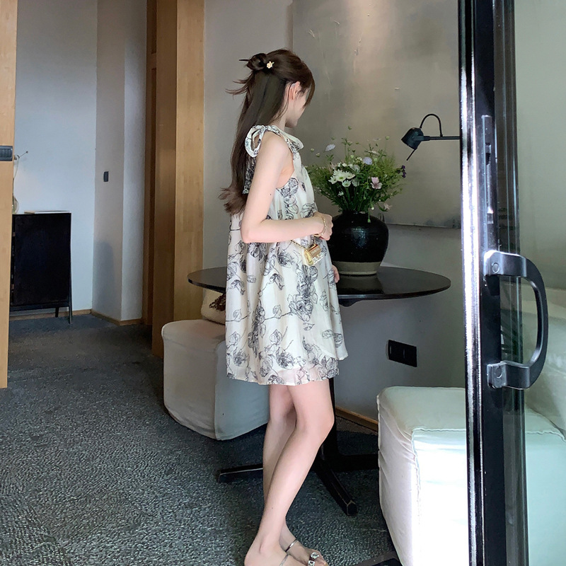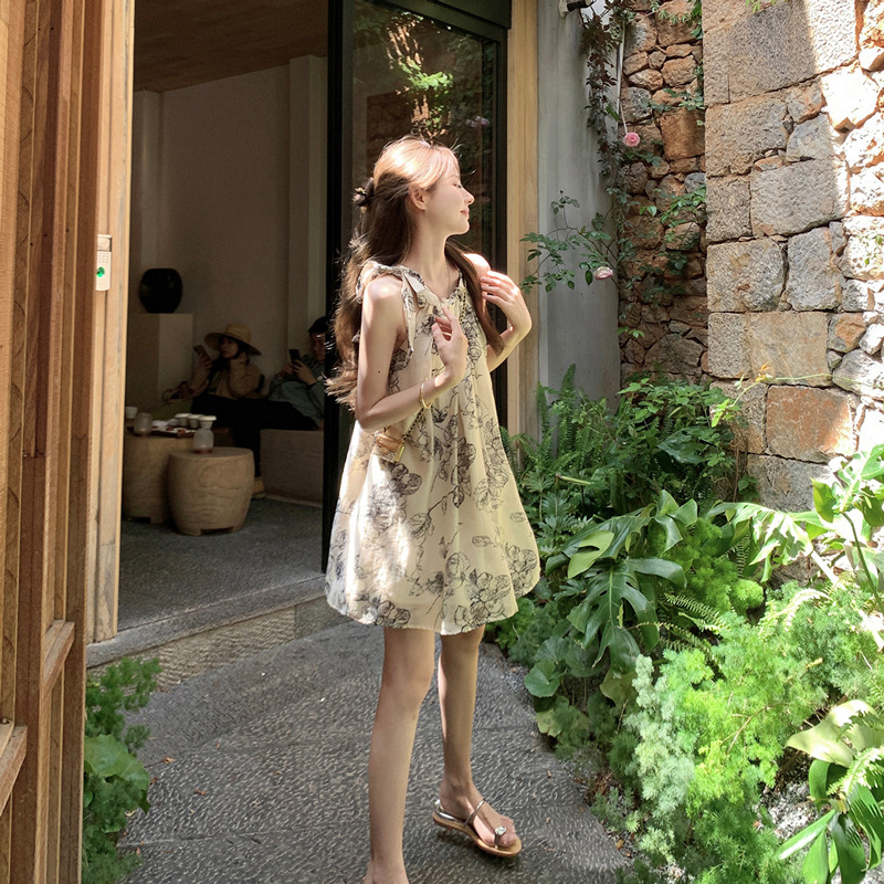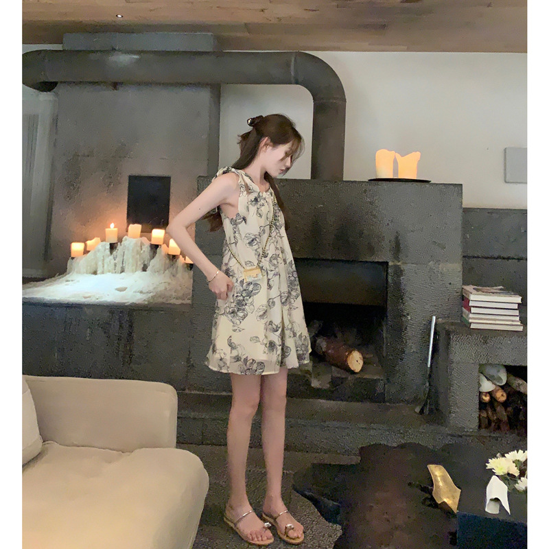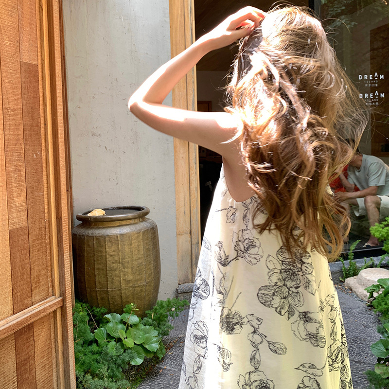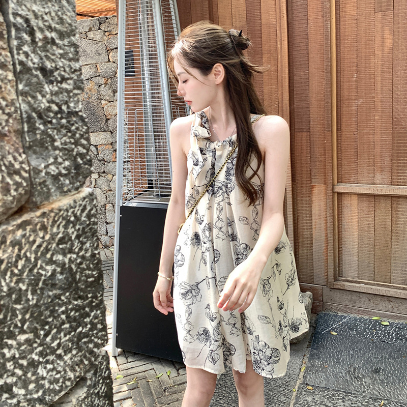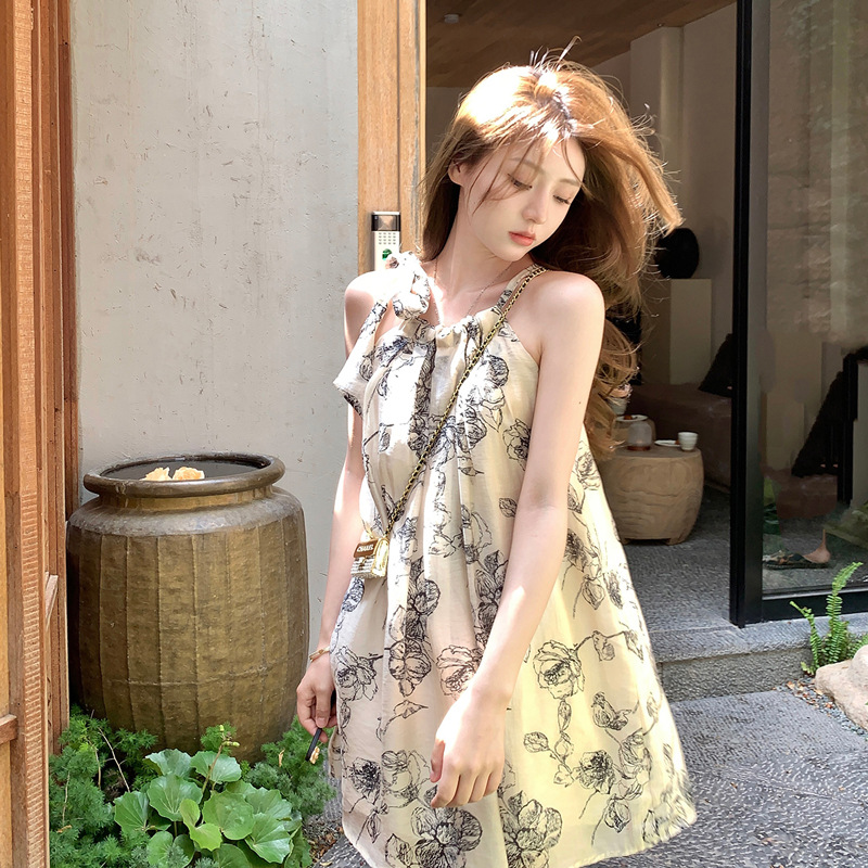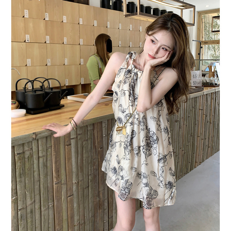 Womens Chinese-style Floral Slip Dress With Neck Strap