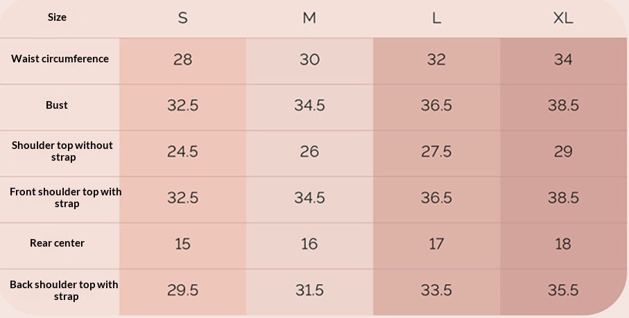 Sizes: S—160 cm (75A/B), 47.5 kg; M—162 cm (80A/B), 54 kg; L—165 cm (85B/C), 59 kg; XL—165 cm (90B/C), 65 kg