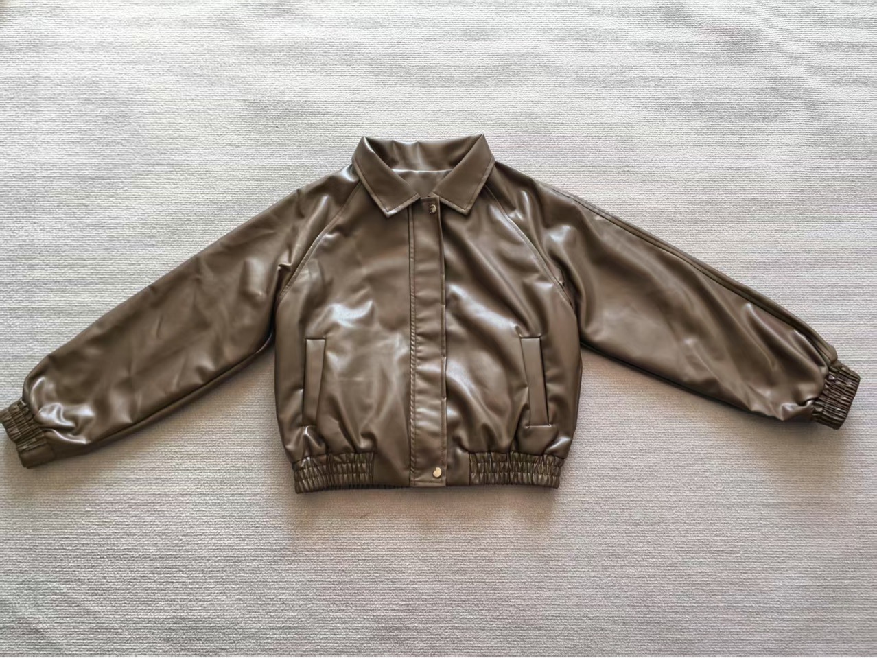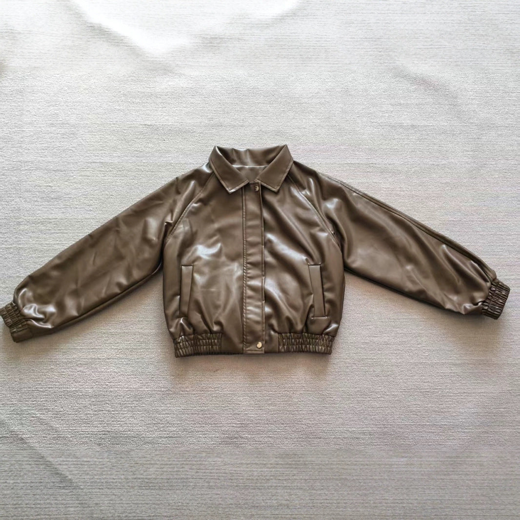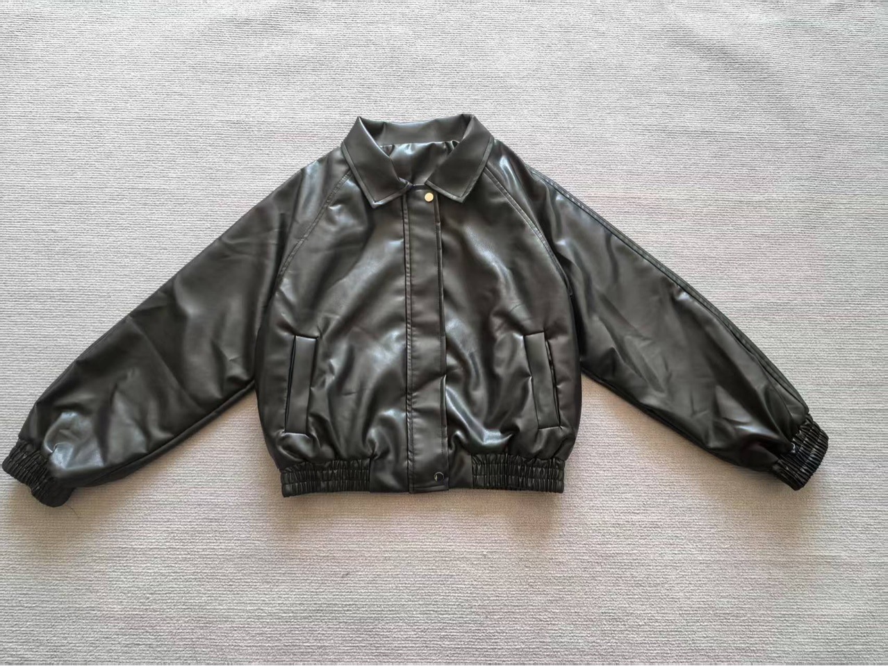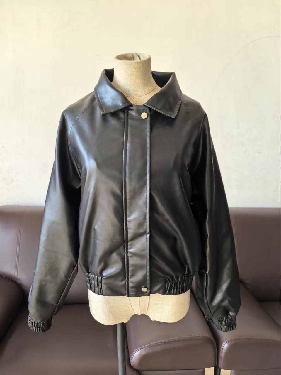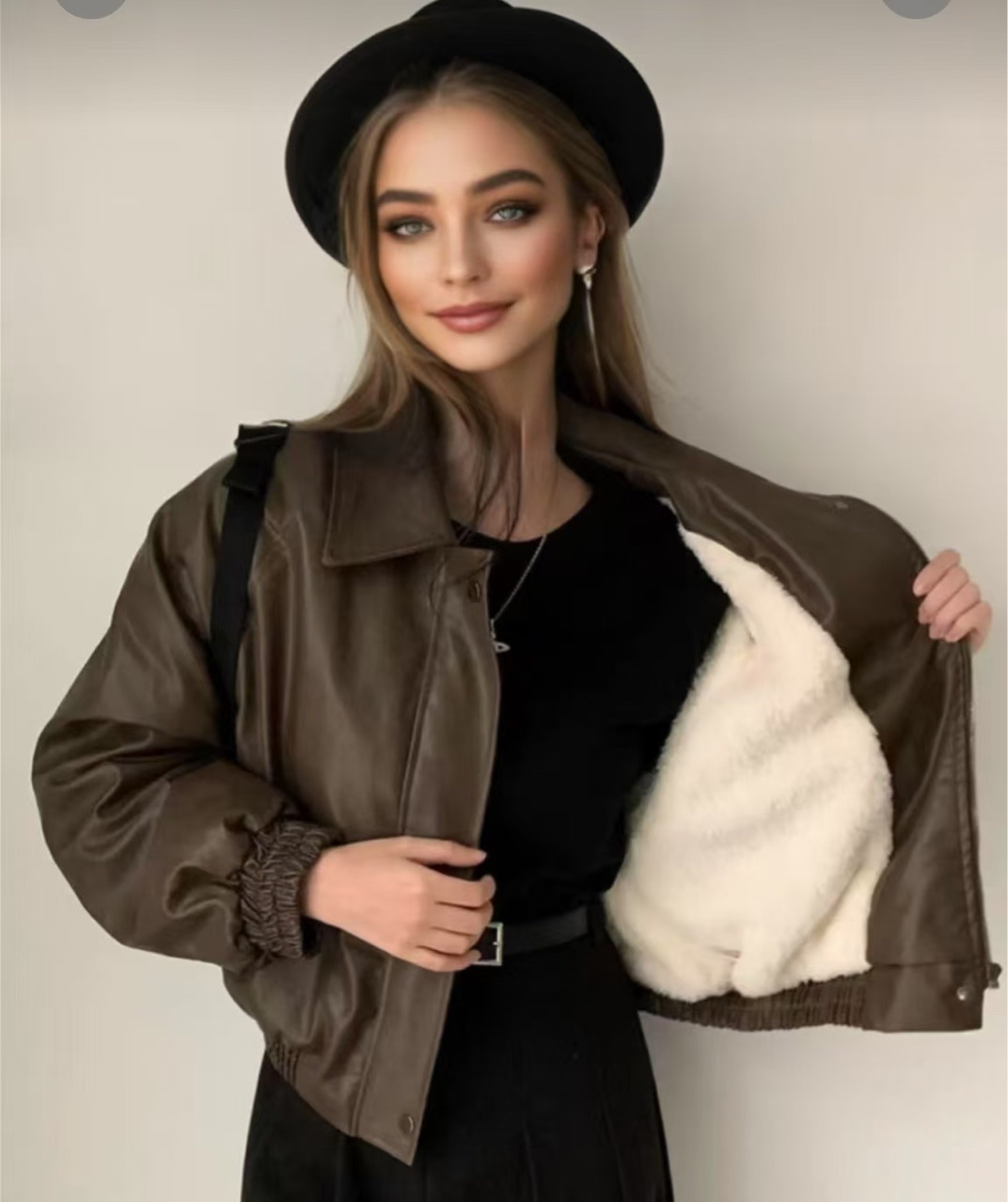 Zipper And Lapel Long Sleeve Loose All-matching Fleece-lined Cropped Leather Coat
