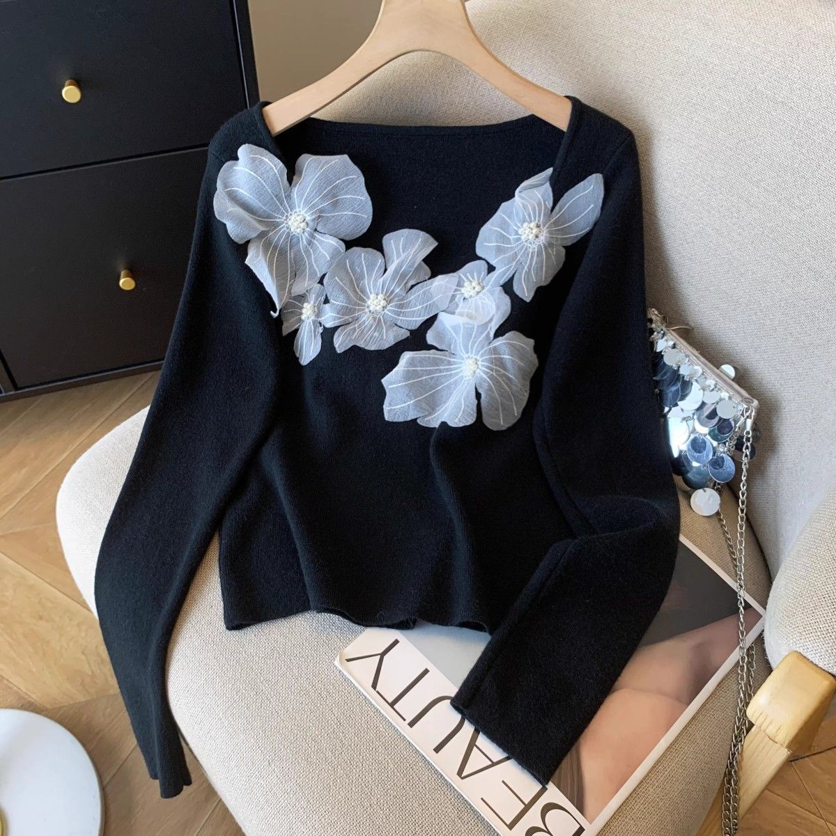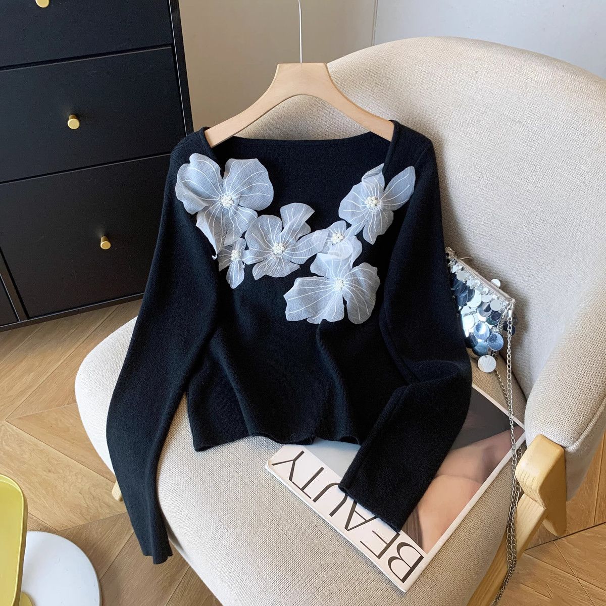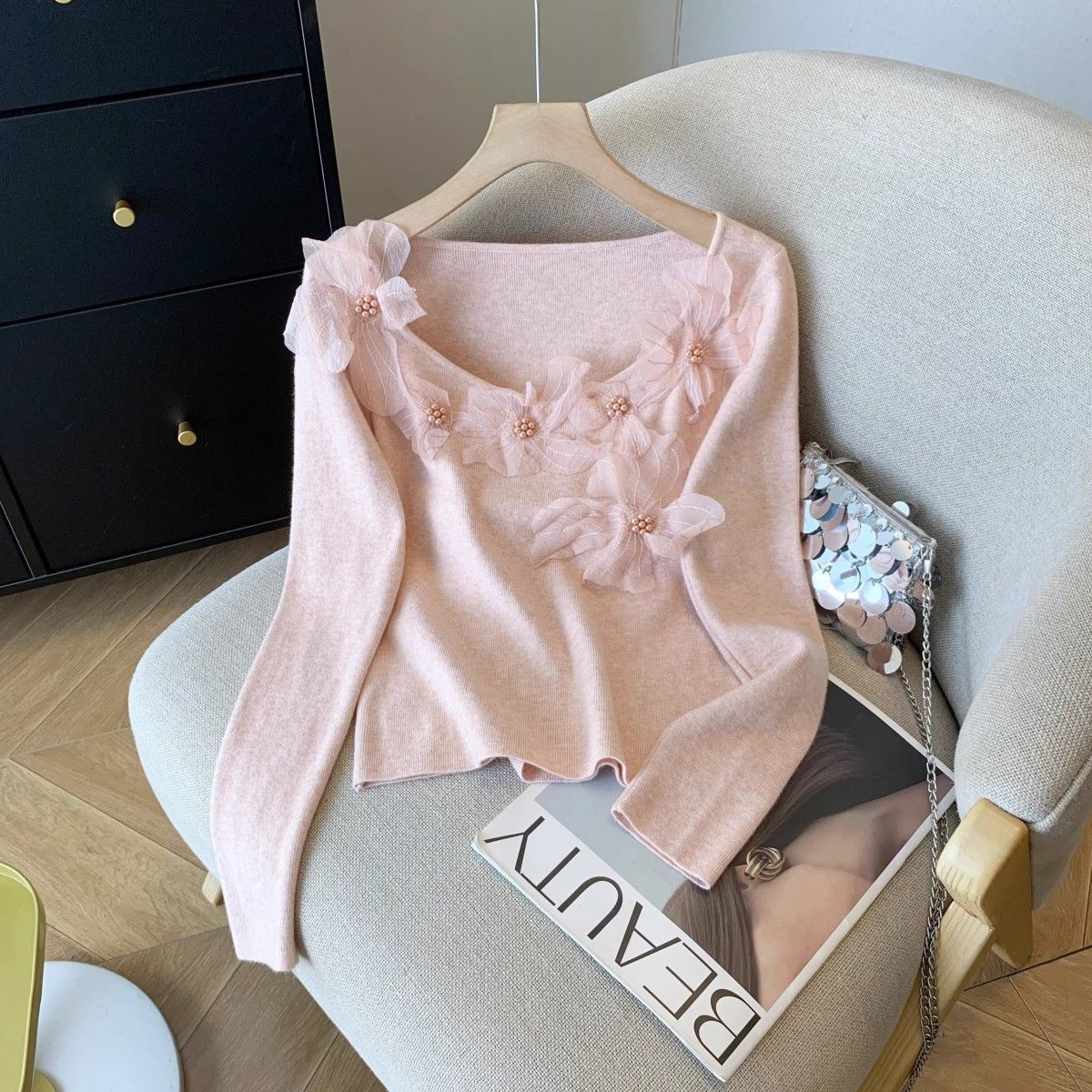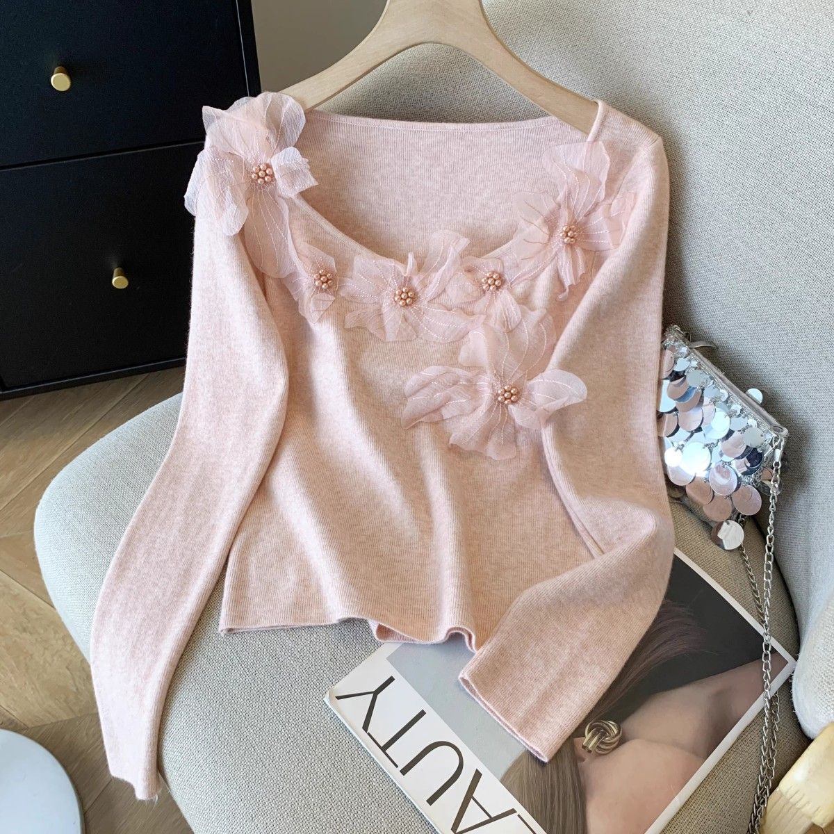 Fashion Elements: Solid color, bead embellishments, 3D details