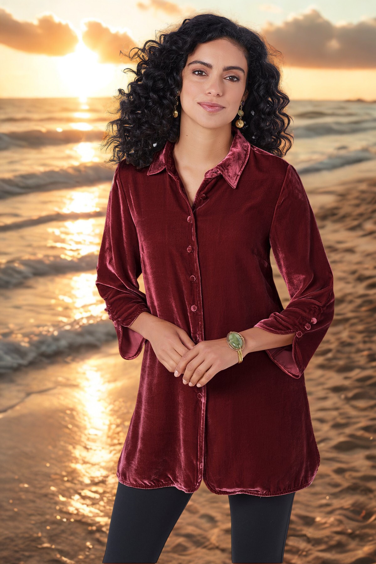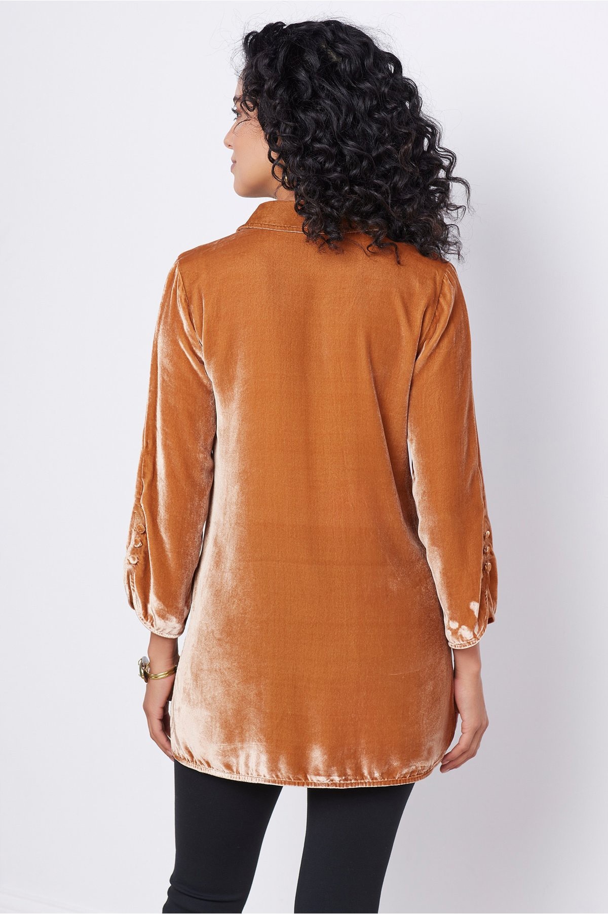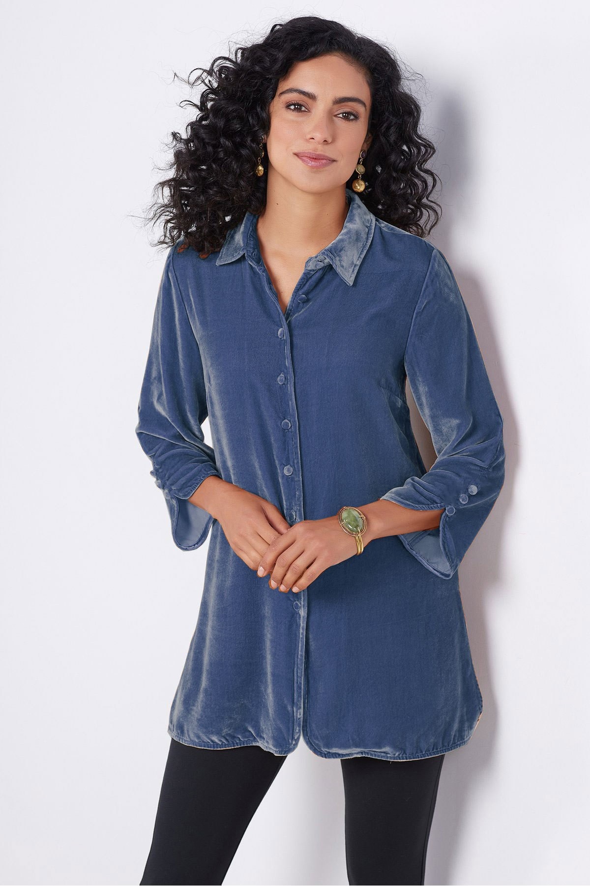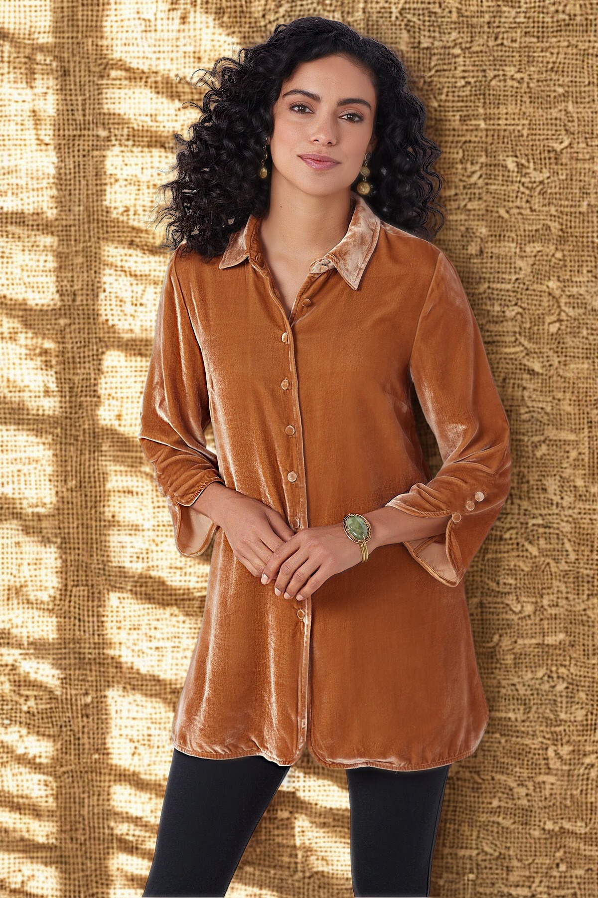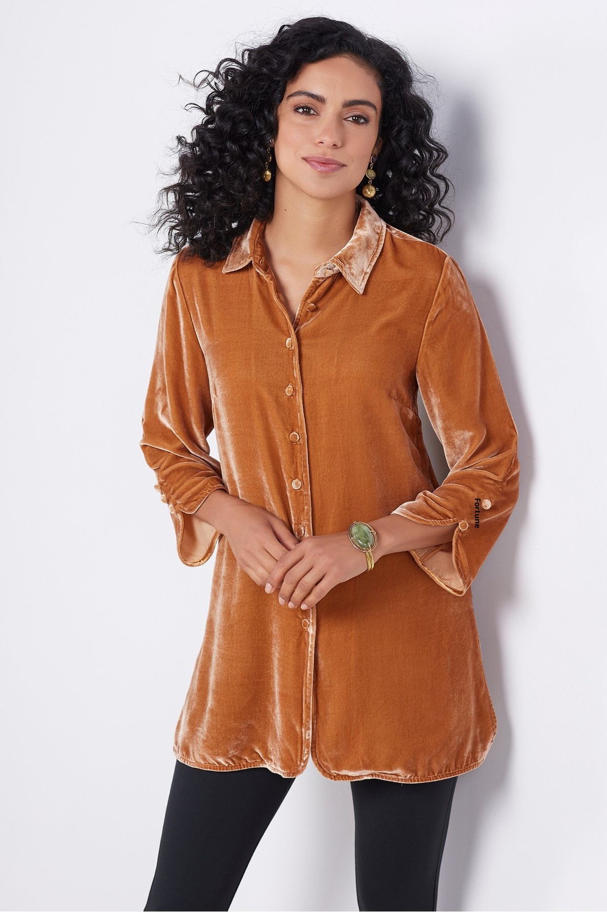 Gold Velvet Bell Sleeve Shirt With Lapel Slit Button Front Casual And Loose