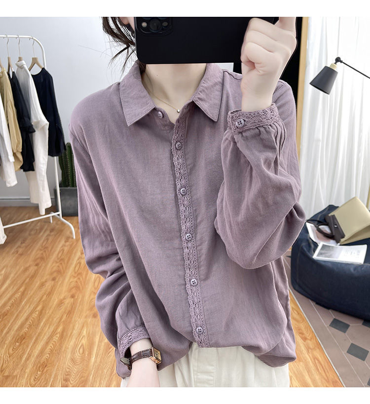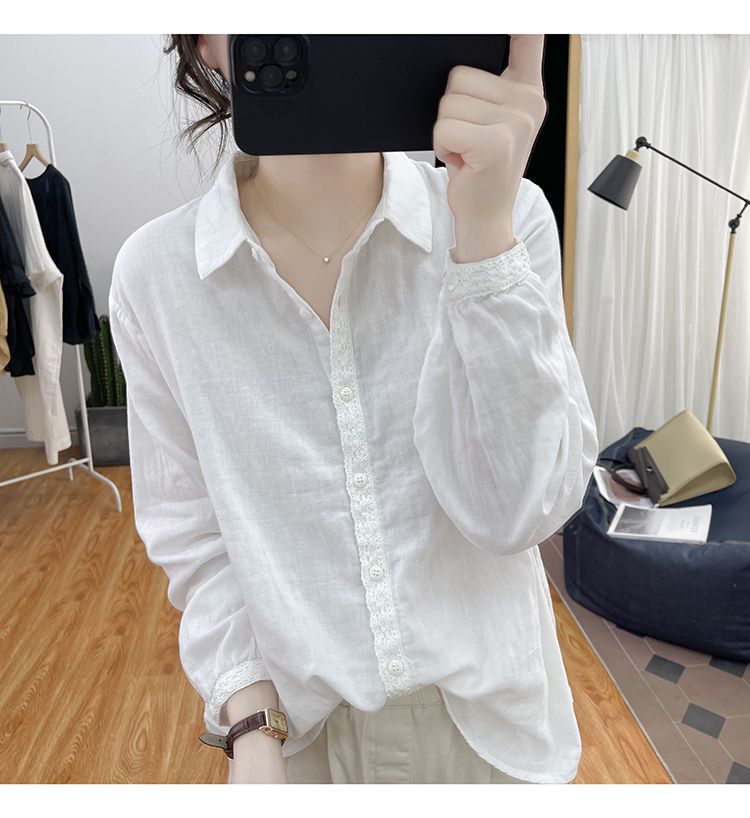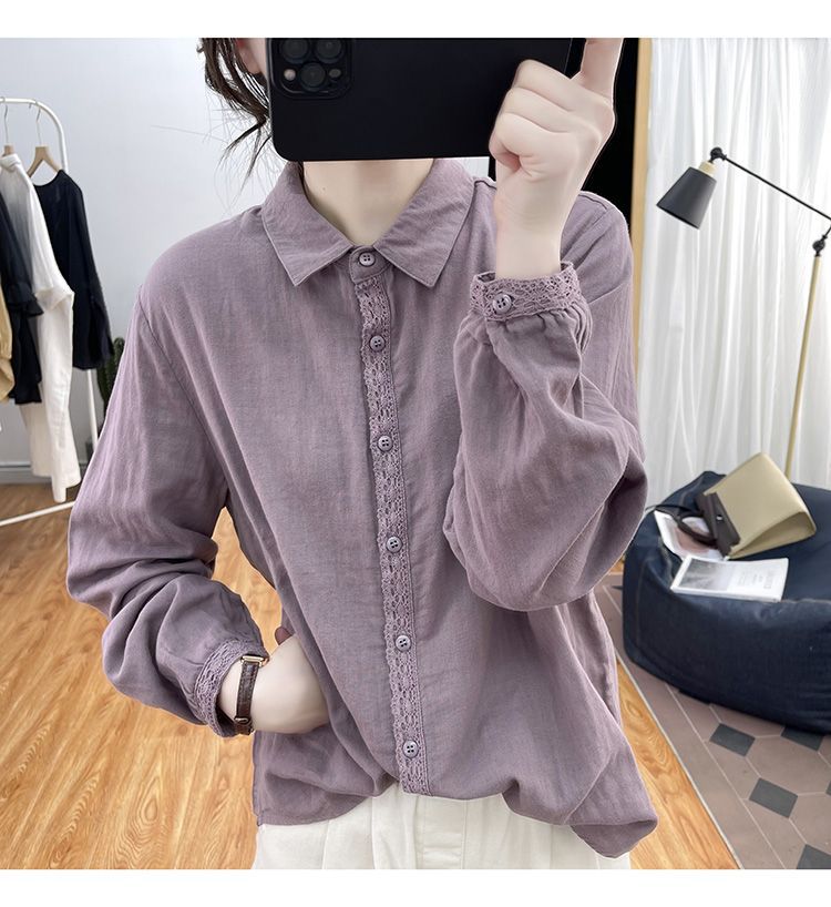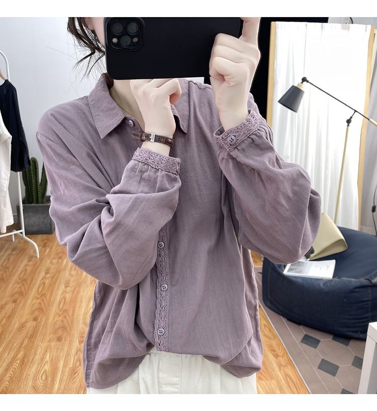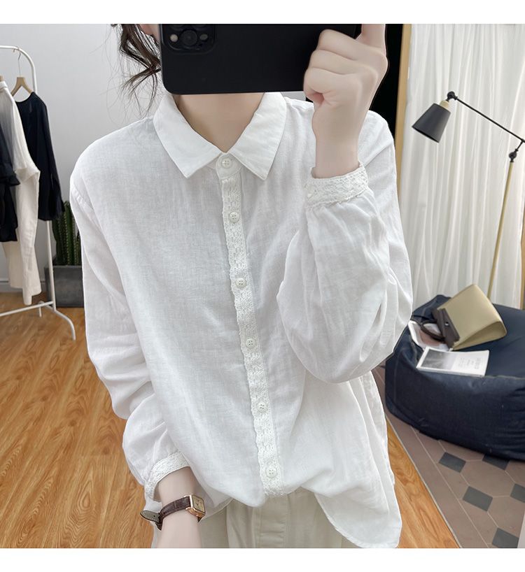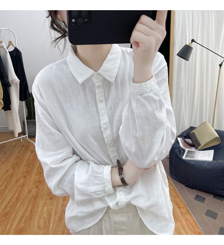 Lace-embellished Pure Cotton Long-sleeved Relaxed-fit Youth-enhancing Top