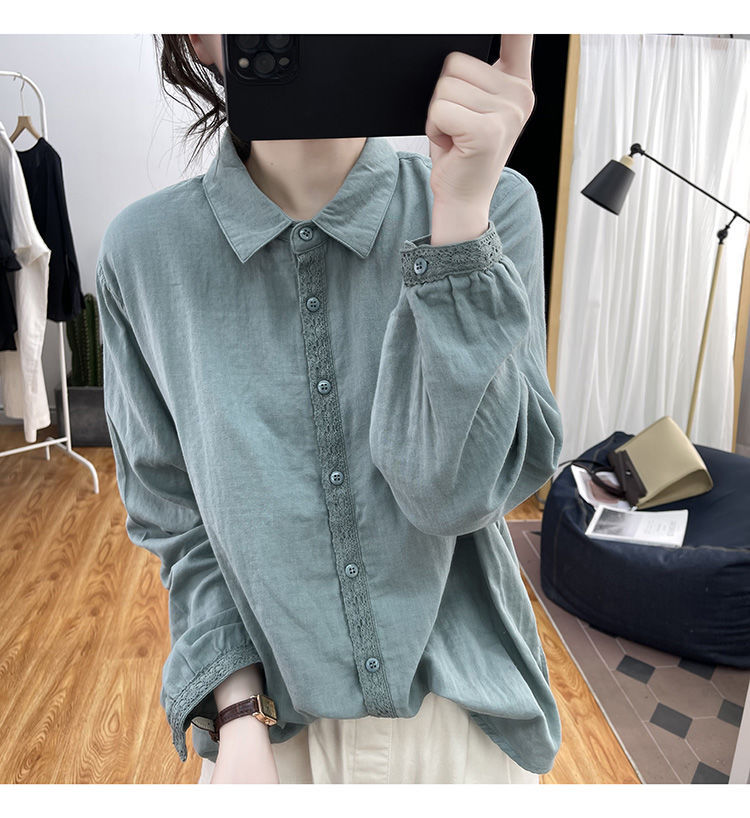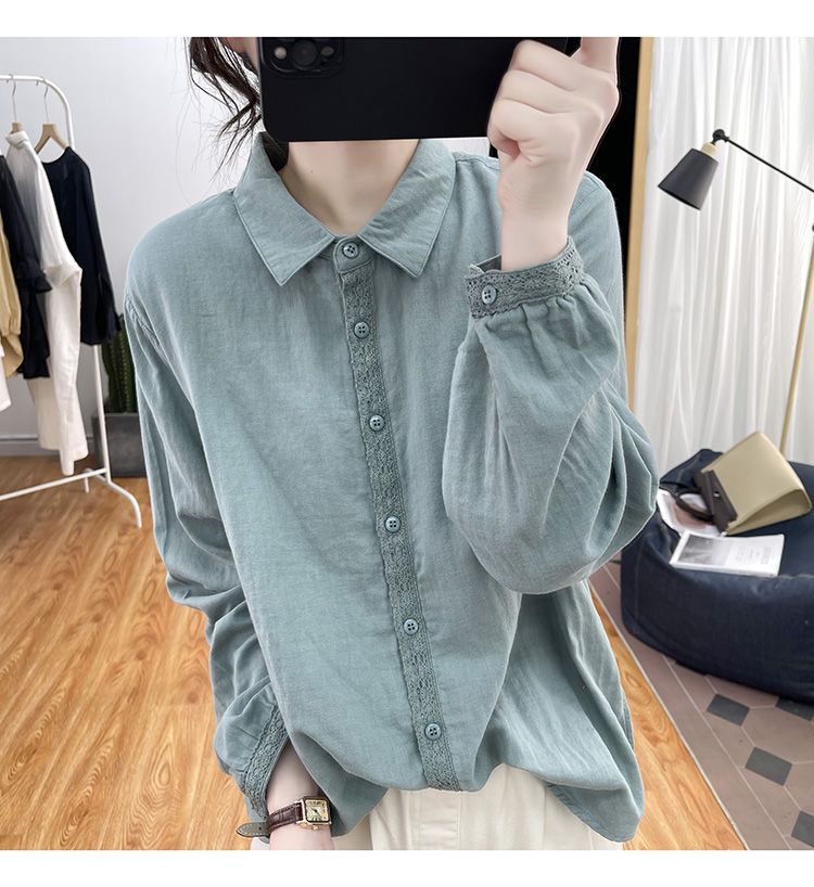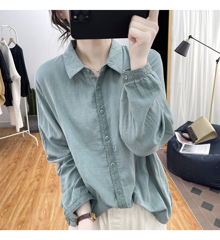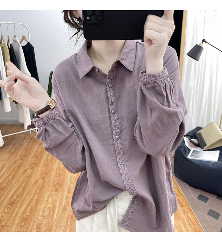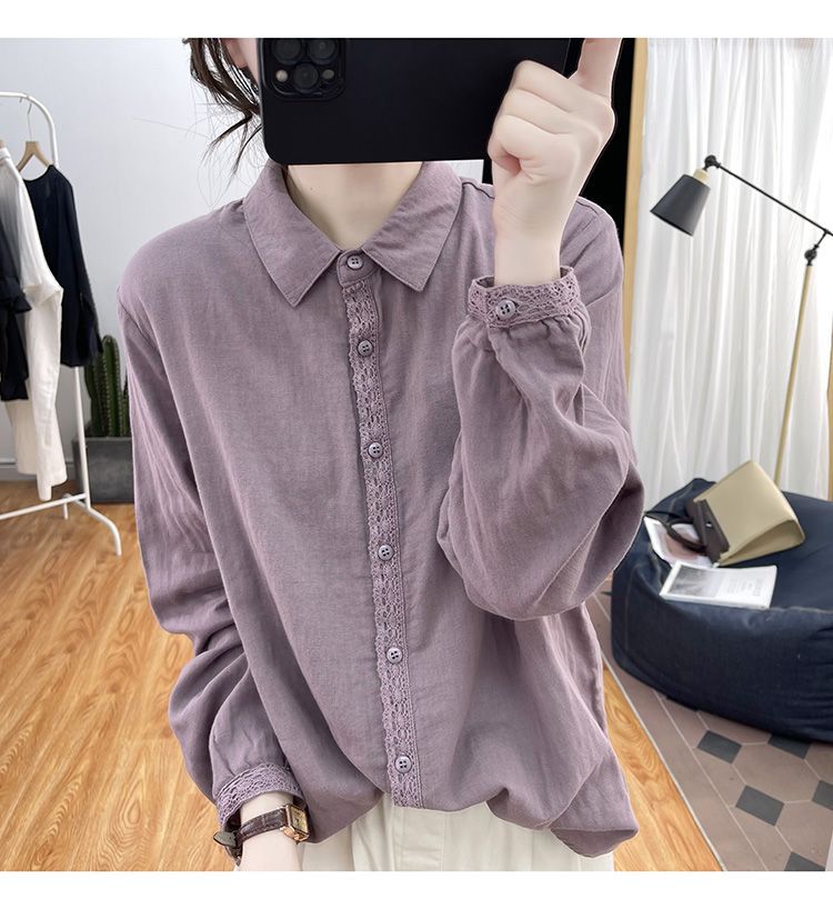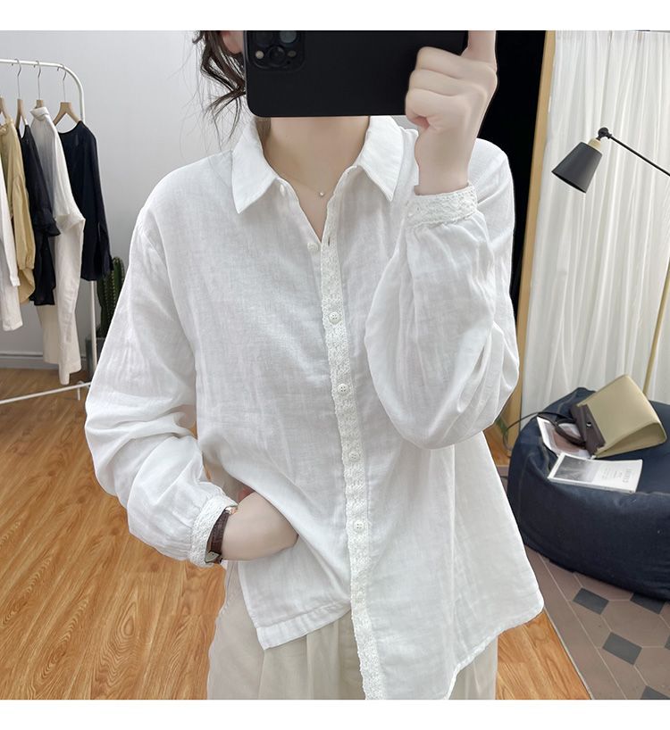 Lace-embellished Pure Cotton Long-sleeved Relaxed-fit Youth-enhancing Top