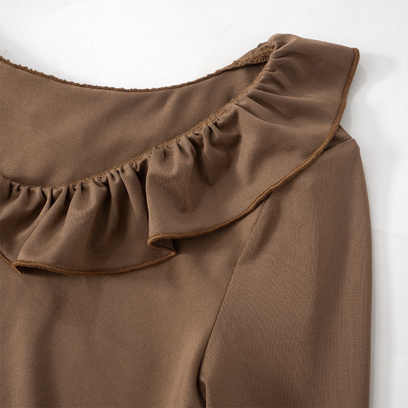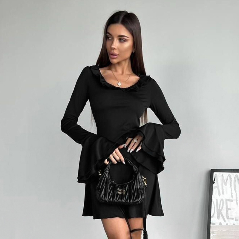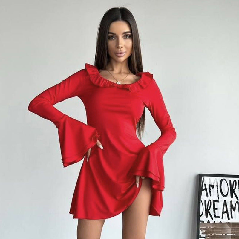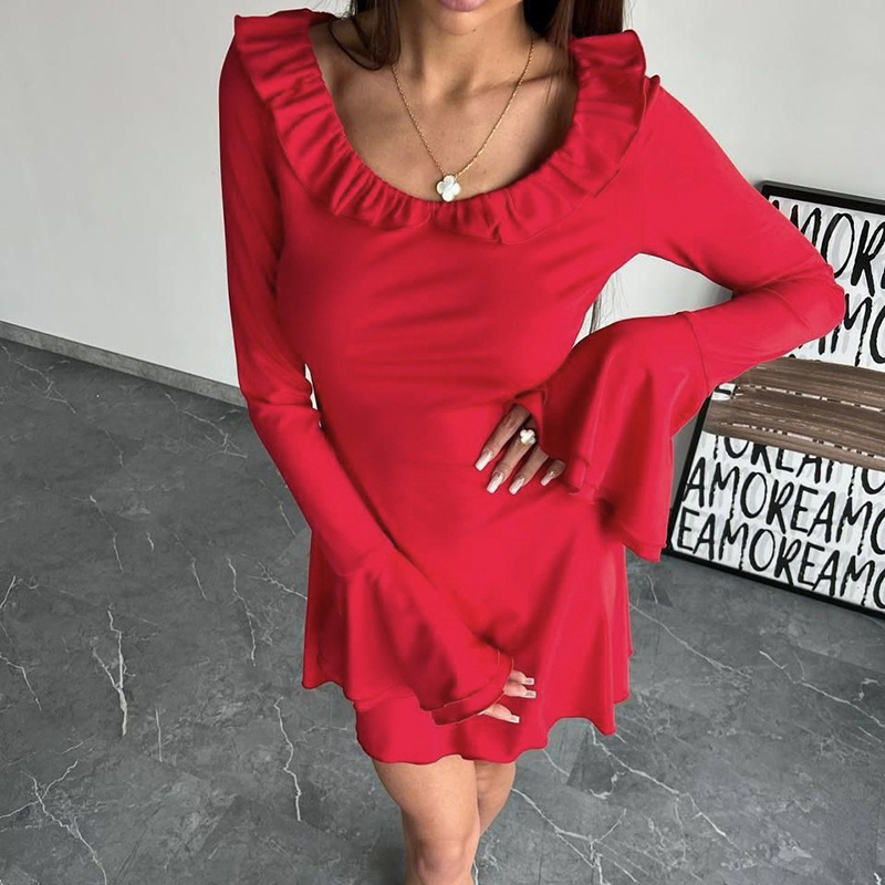New Solid-color U-neck Flared-sleeve Long-sleeve Dress Skirt
