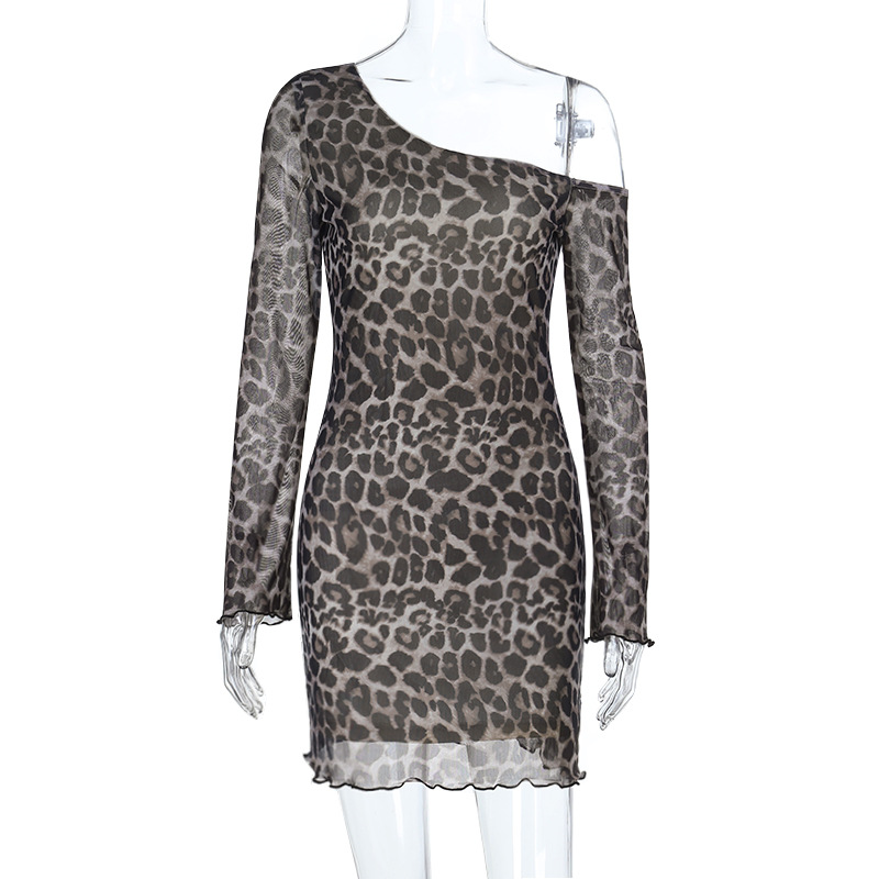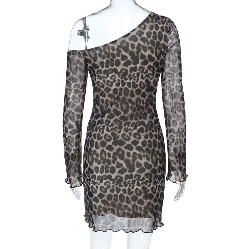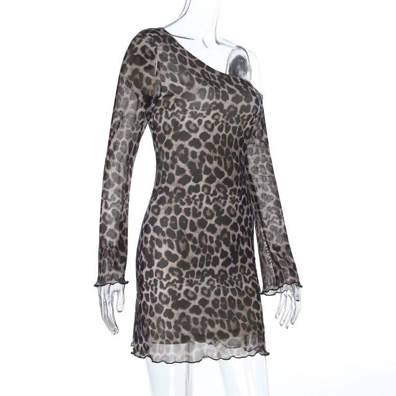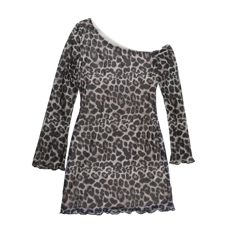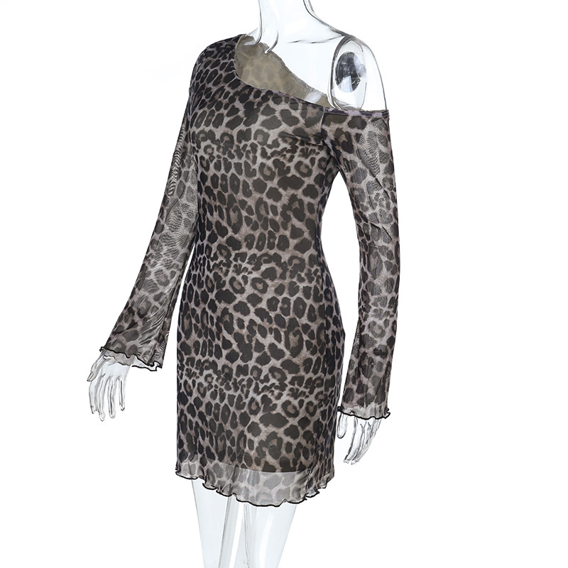Off-Shoulder Sexy Backless Leopard-Print Long-Sleeve Dress