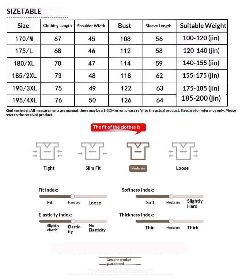 Sizes: M/170, L/175, XL/180, 2XL/185, 3XL/190, 4XL/195