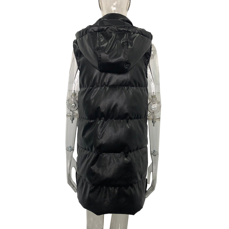Pure Color Black Hooded Vest Women's Fashion Zipper PU
