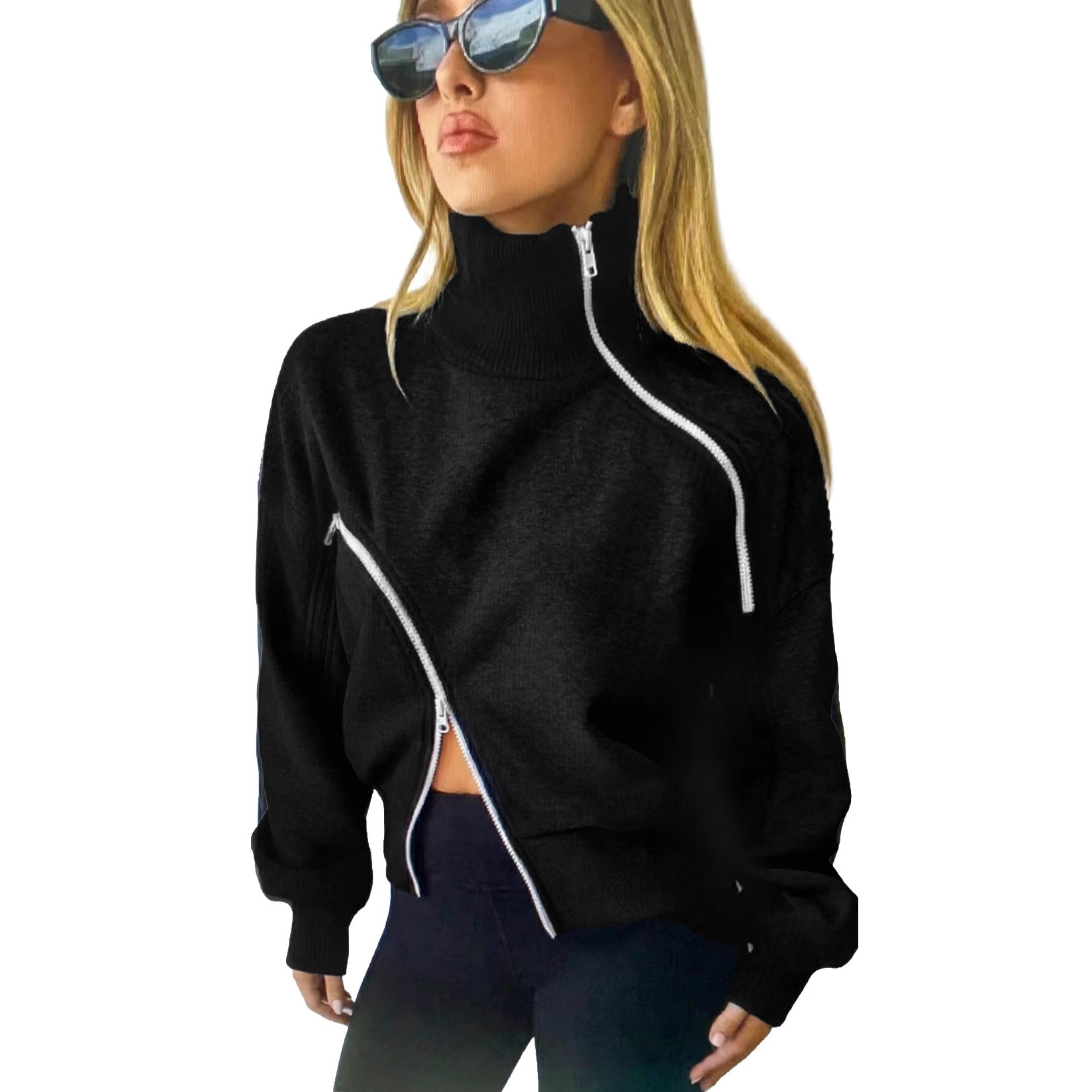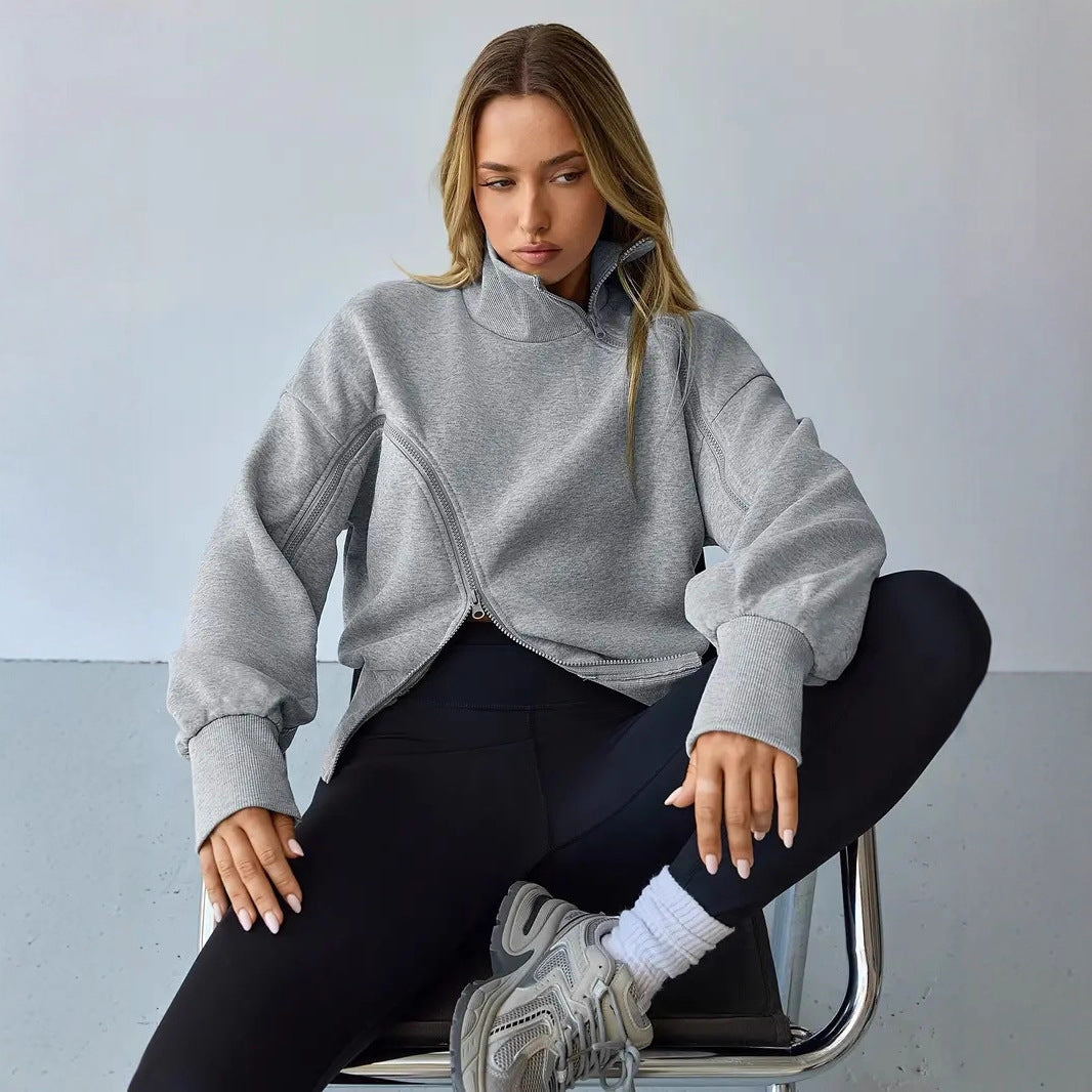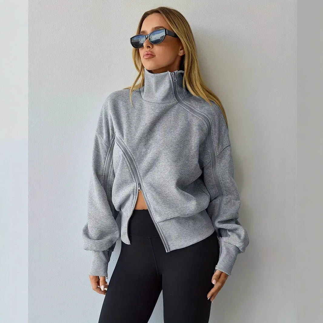 Contrast-color Zipper Short Chic Mock-neck Hoodie