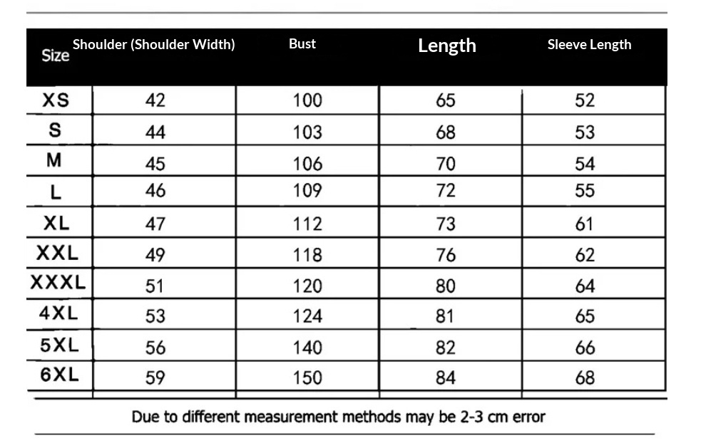 Sizes: XS, S, M, L, XL, XXL, XXXL, 4XL, 5XL, 6XL