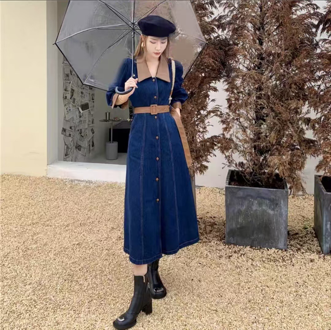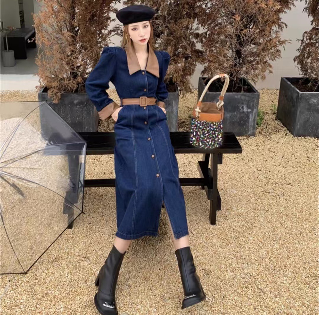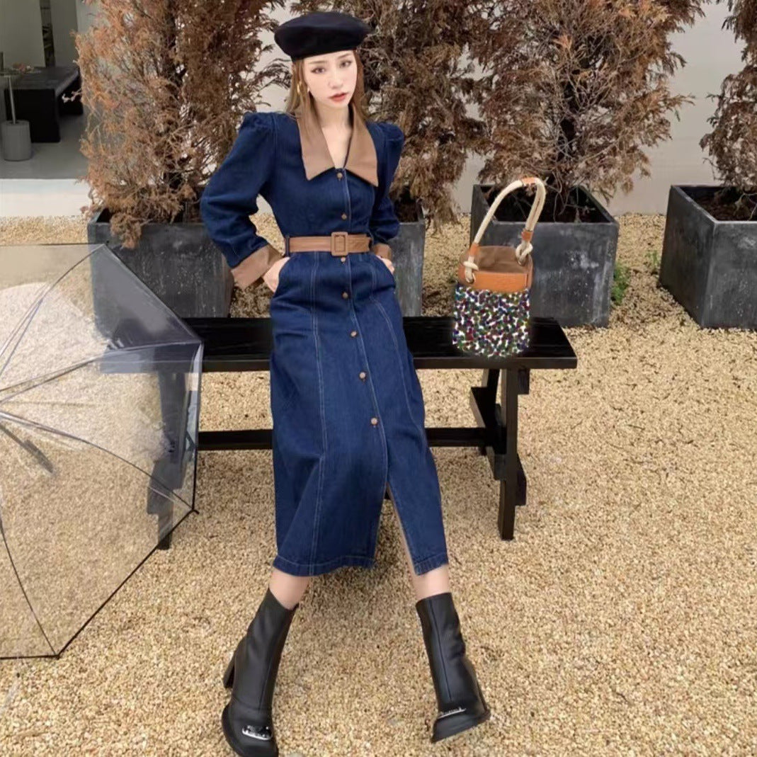 Retro Notch-Collar Patchwork Defined-Waist Long Dress For Women Elegant Style