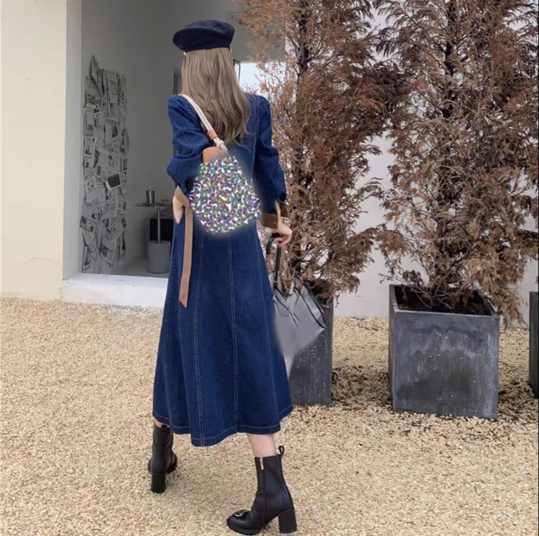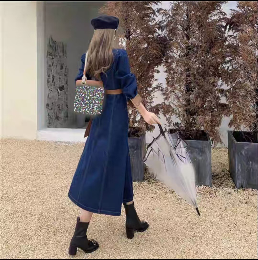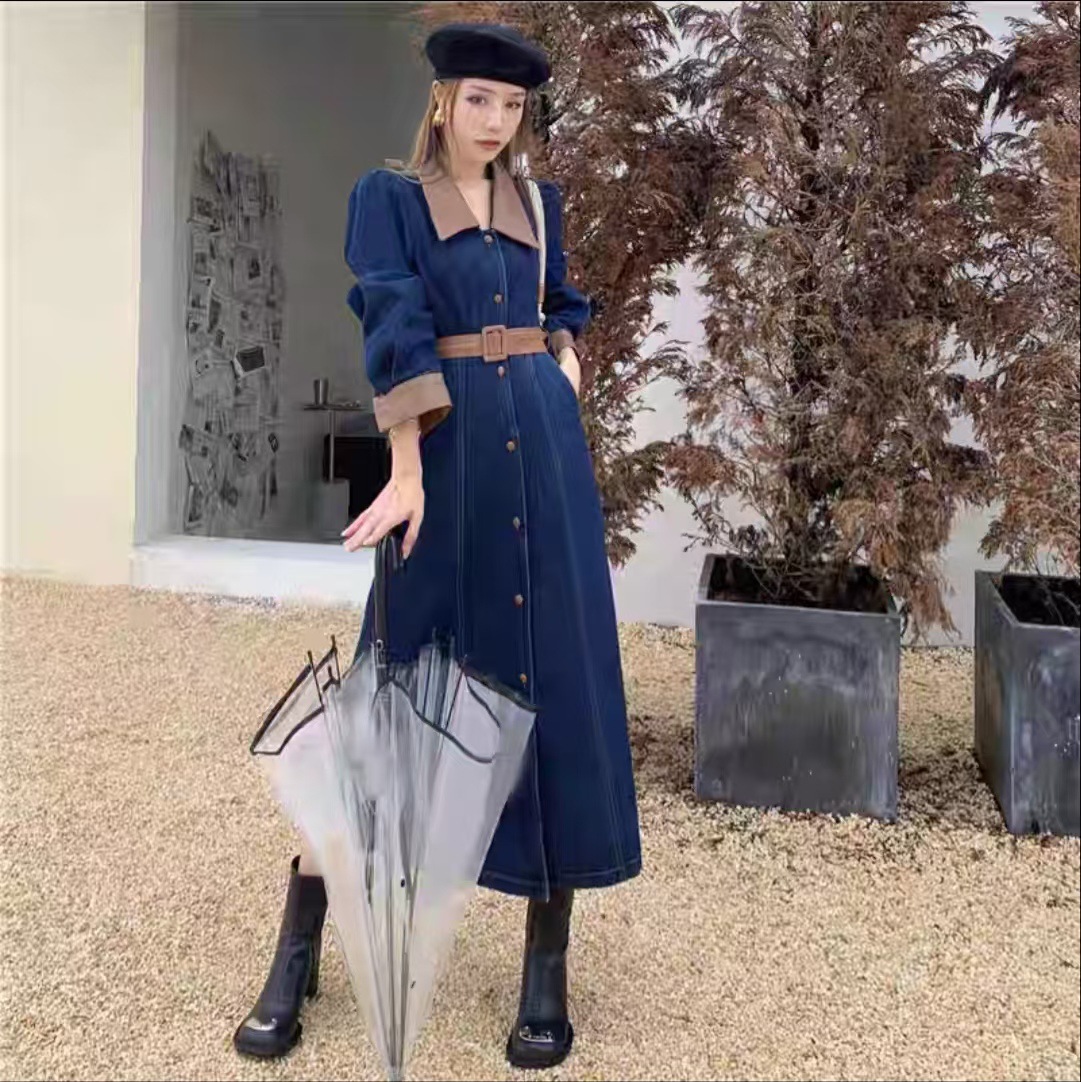 Retro Notch-Collar Patchwork Defined-Waist Long Dress For Women Elegant Style