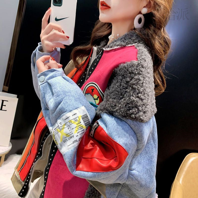 Women's Winter Loose Plus Size Lamb Wool Stitching Denim Coat