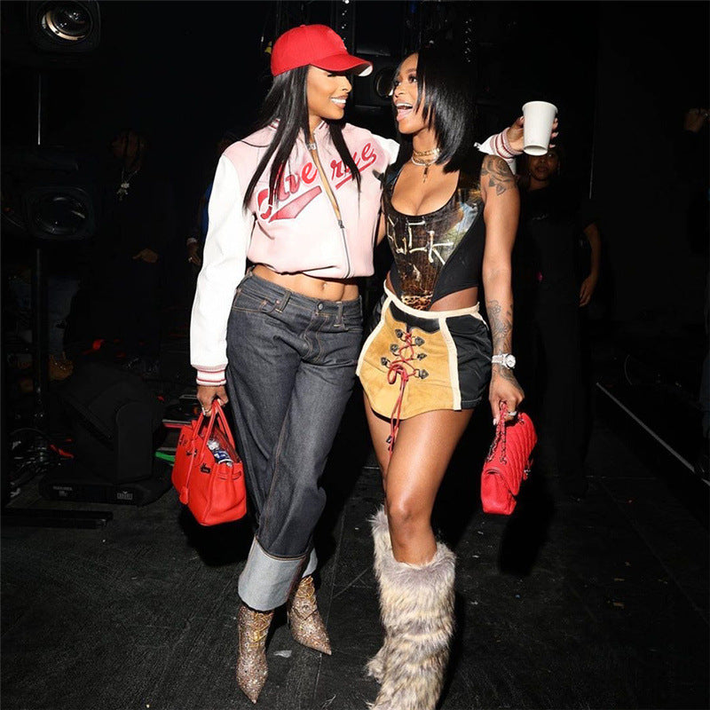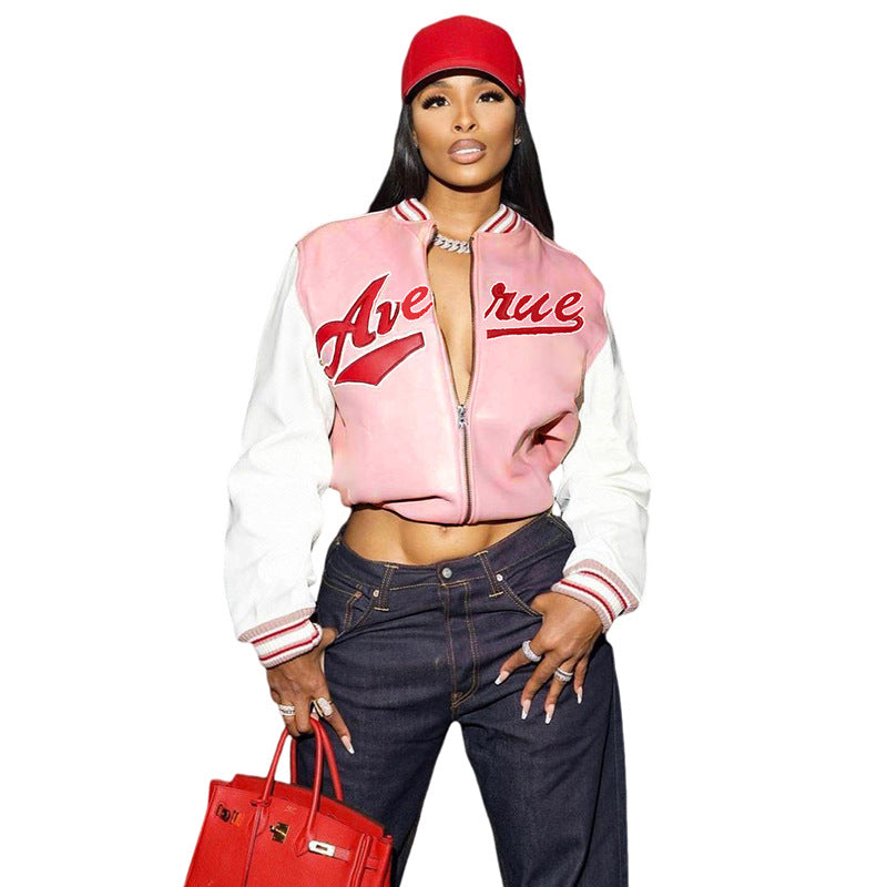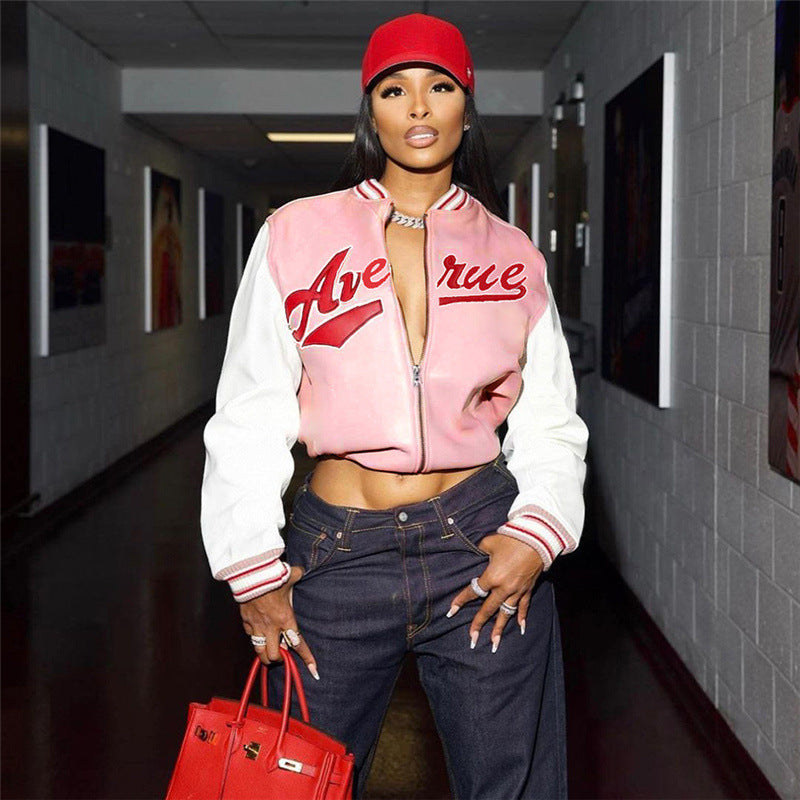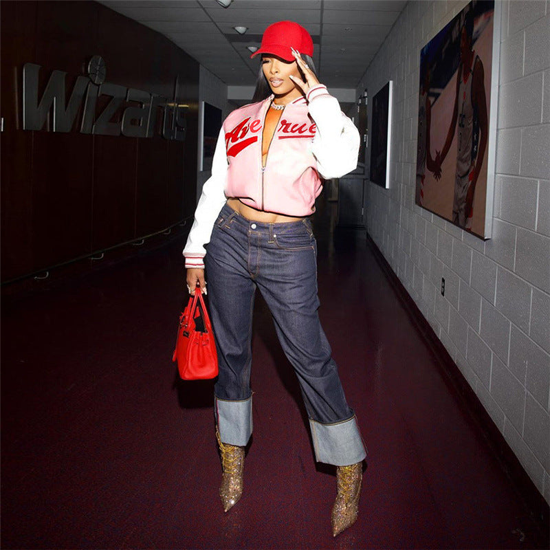 Embroidery Contrast Color Slim Fit Patchwork Jacket Baseball Uniform Jacket