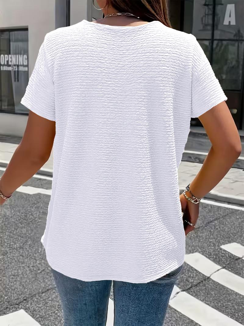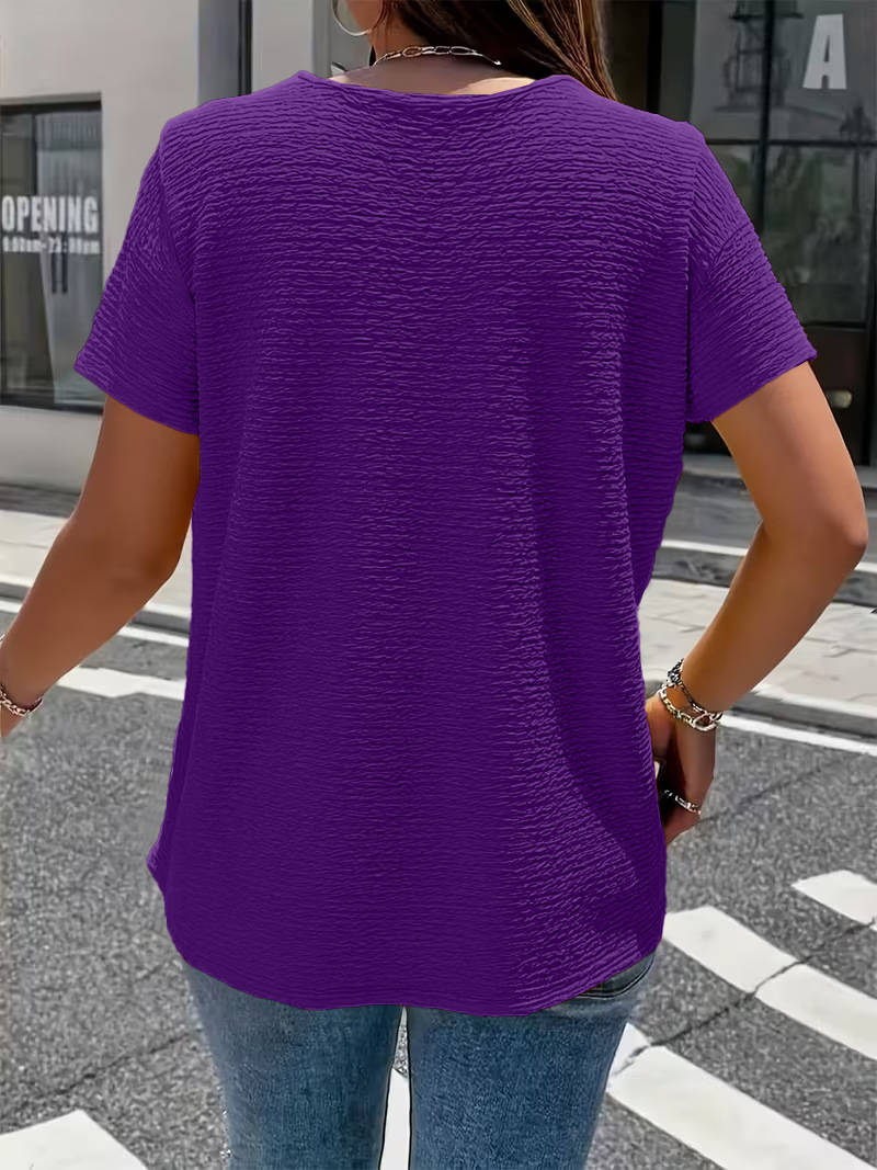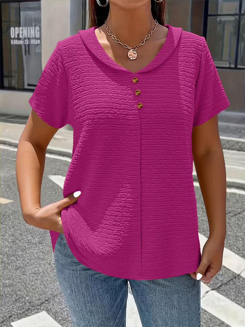 Pleated Fabric Solid-color Faux-button Doll-collar Top T-shirt