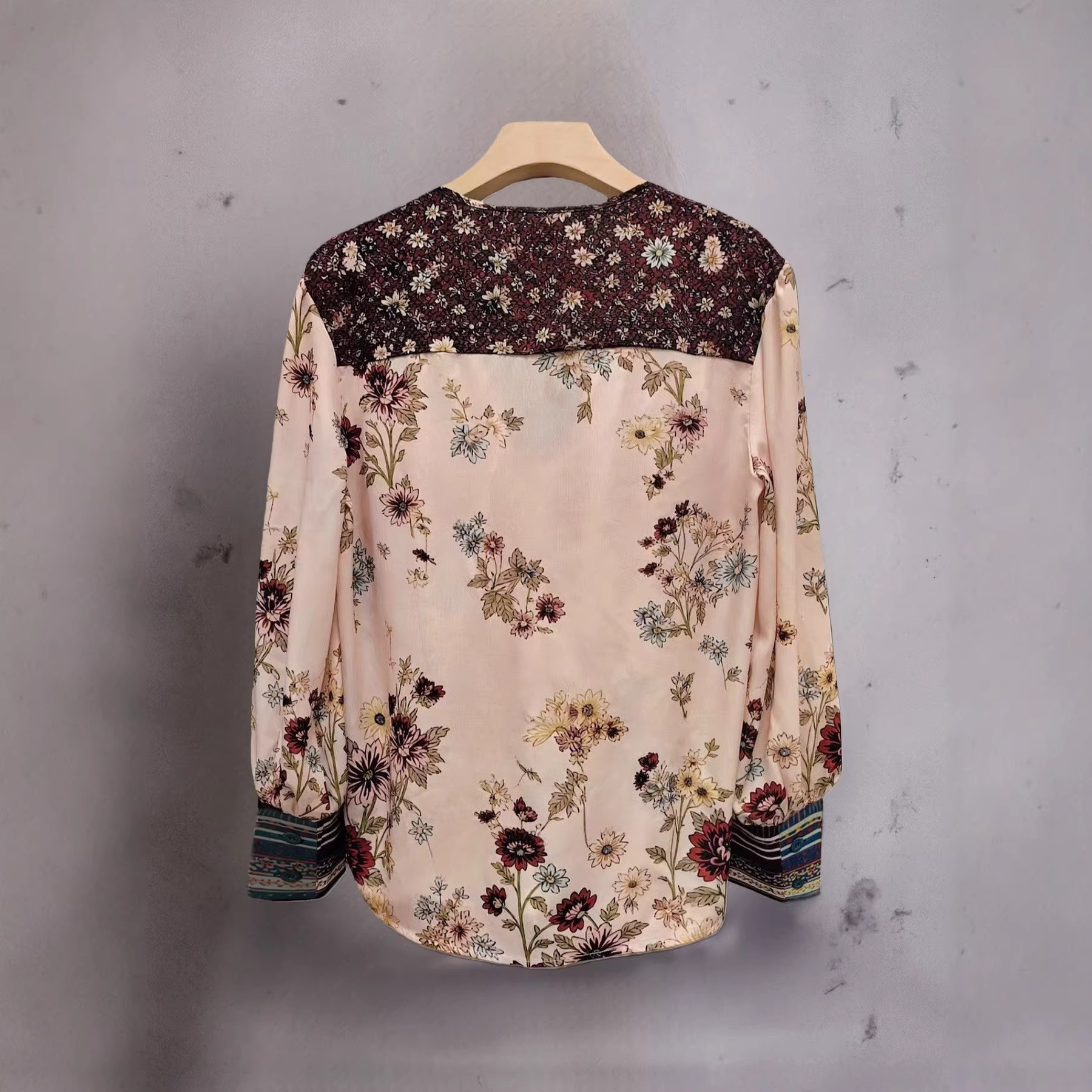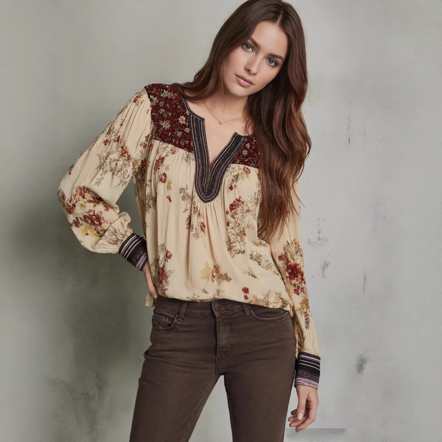 V-Neck Lace-Patchwork Long-Sleeve Floral Print Womens T-Shirt