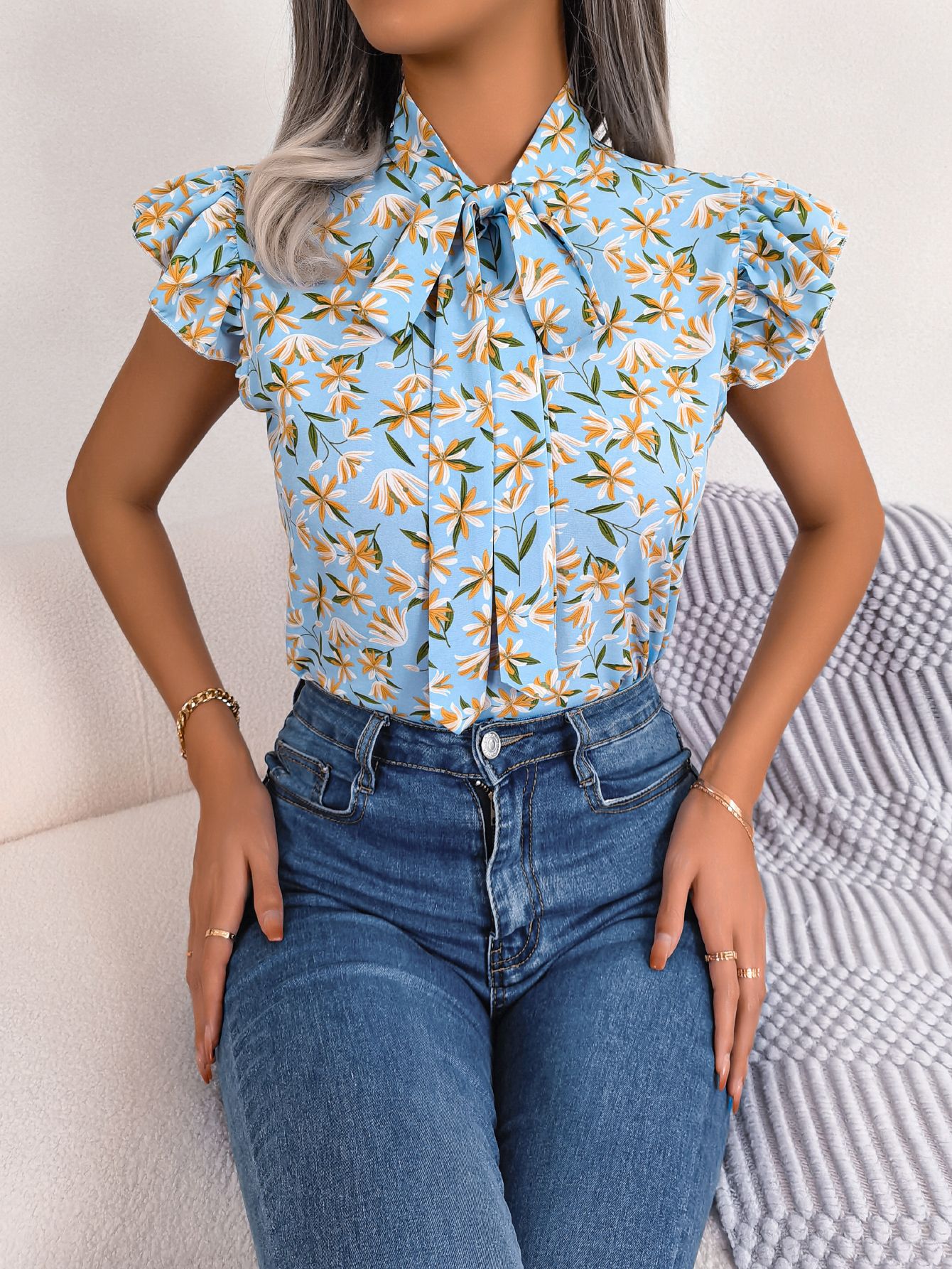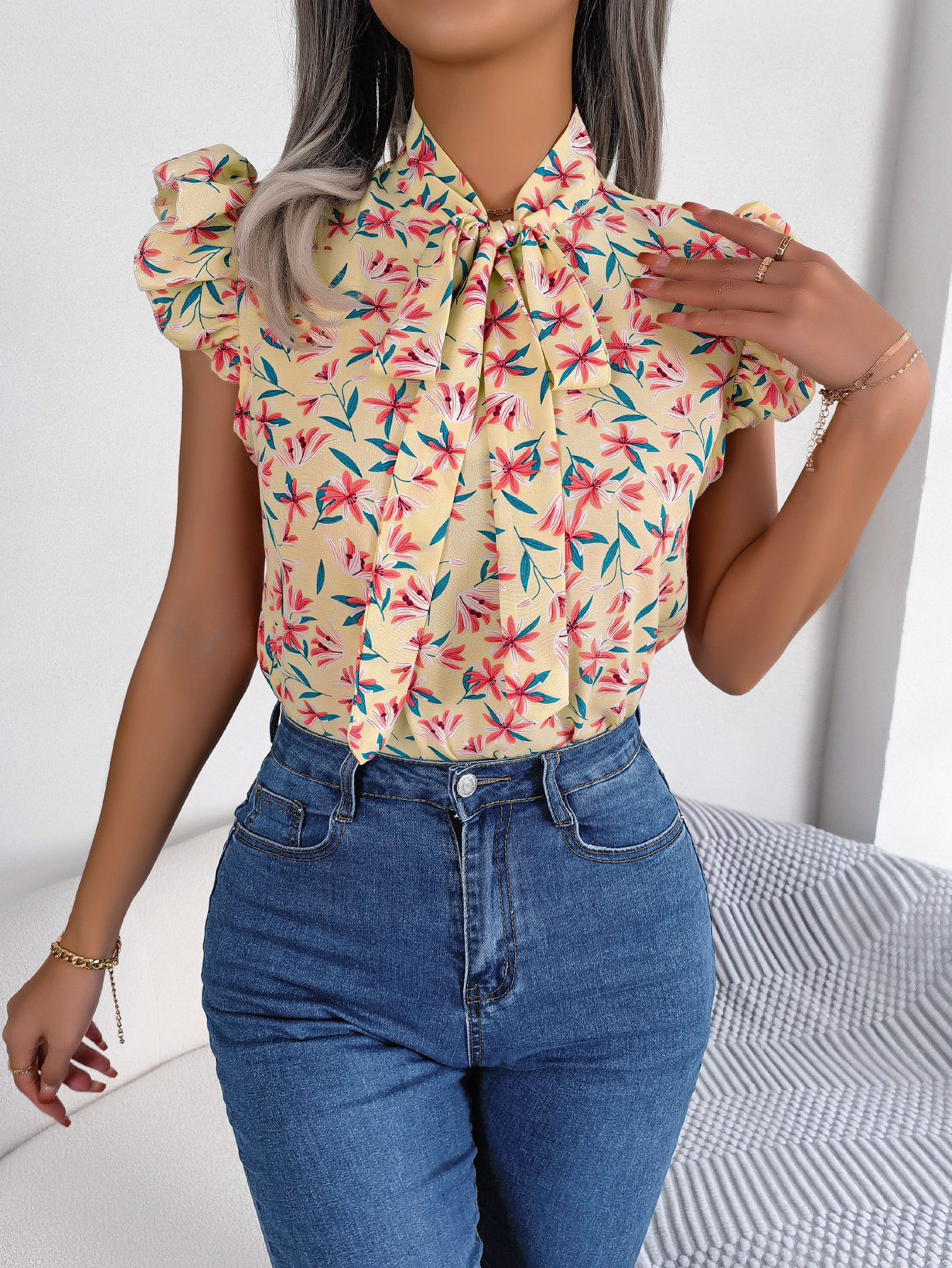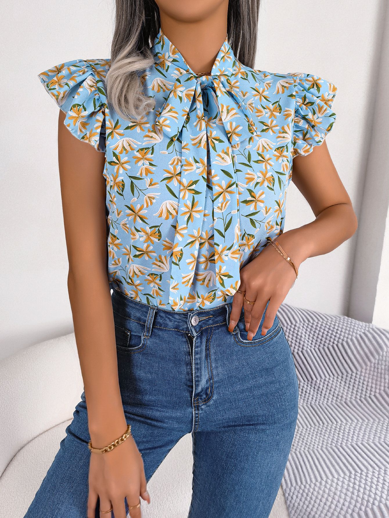 Women's Casual Floral Print Ruffle Trim Tie Bow Chiffon Blouse