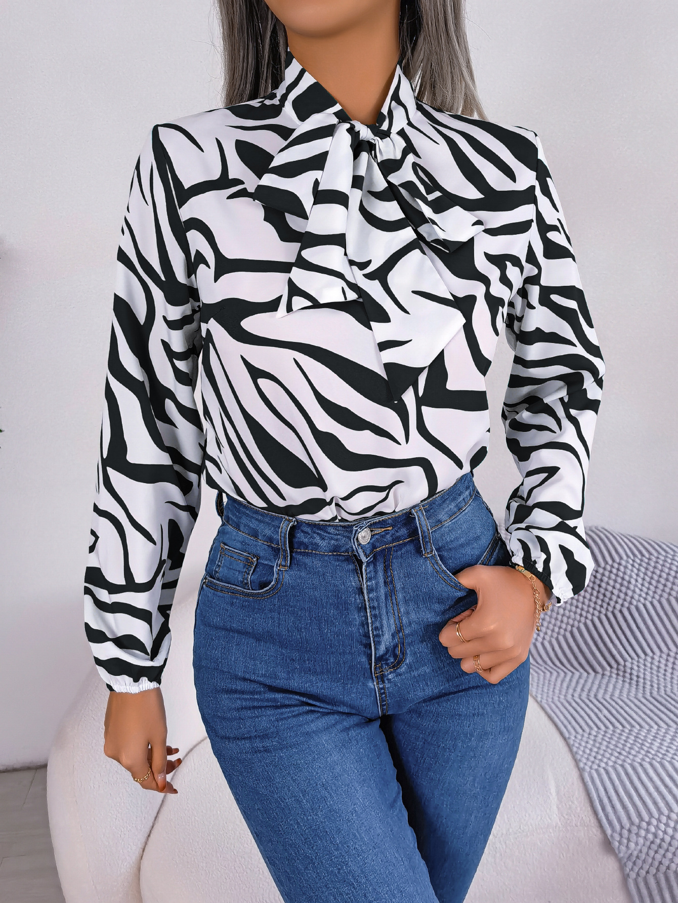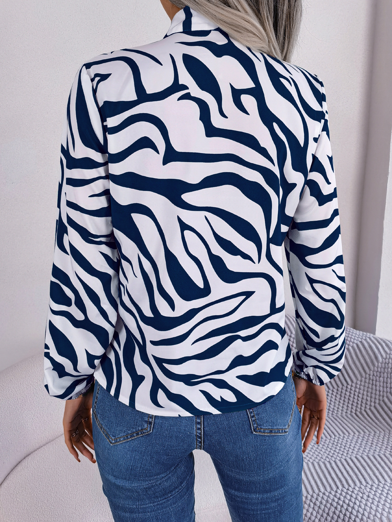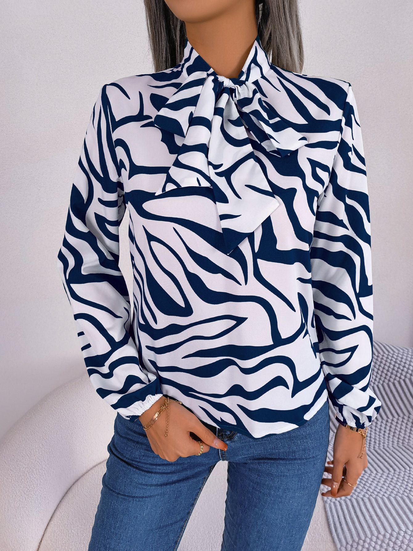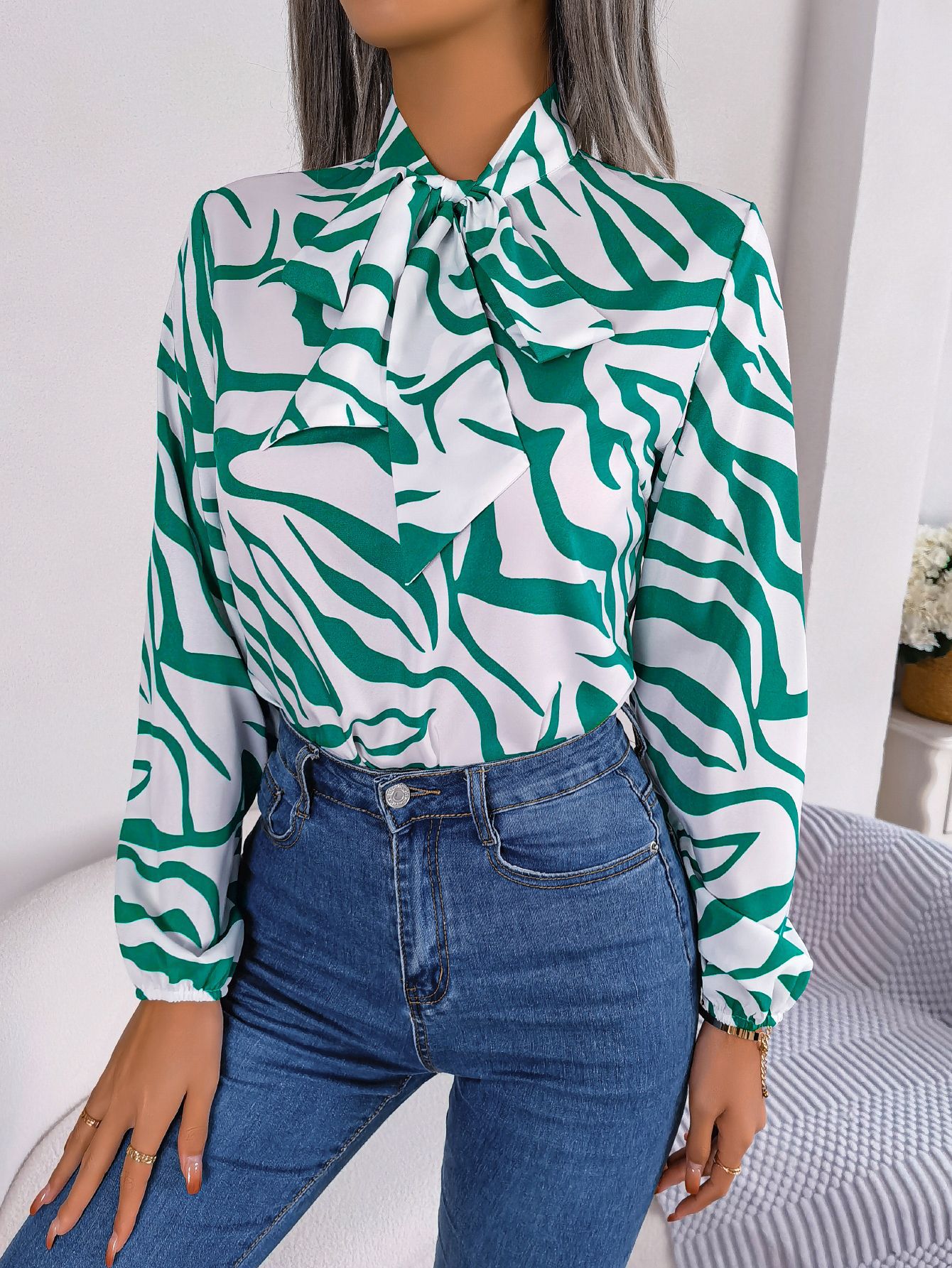 Women's Elegant Color Block Stripe Tie Waist Lantern Sleeve Chiffon Top