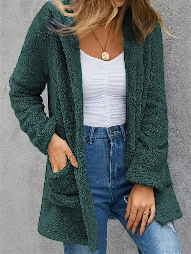 New Women's Cardigan Double Pocket Hooded Solid Color Fleece Cardigan Jacket