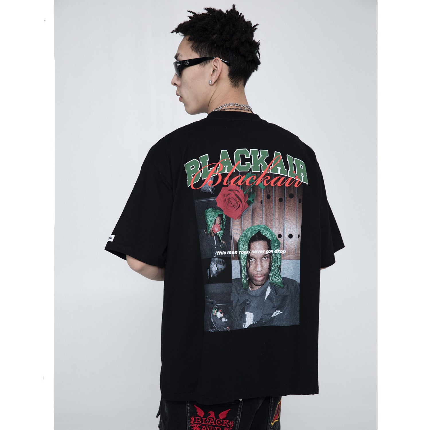 Retro Street Print Rose Rap Hiphop Loose National Tide Round Neck Short-sleeved Mens Tshirt