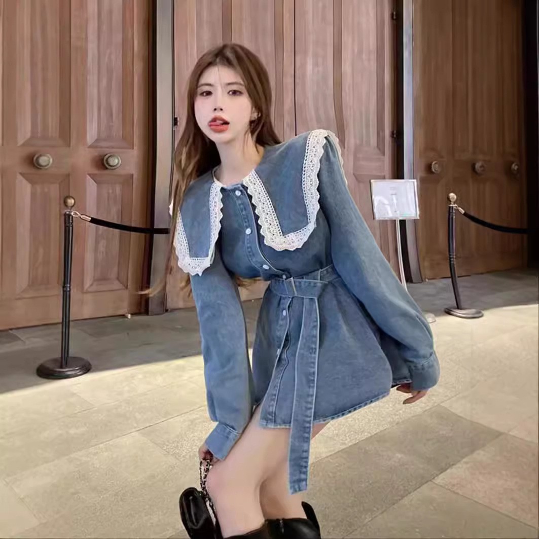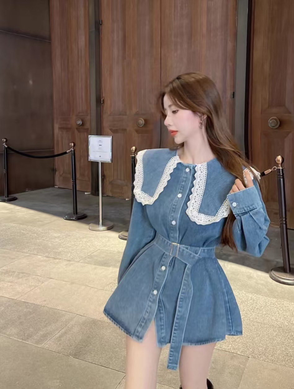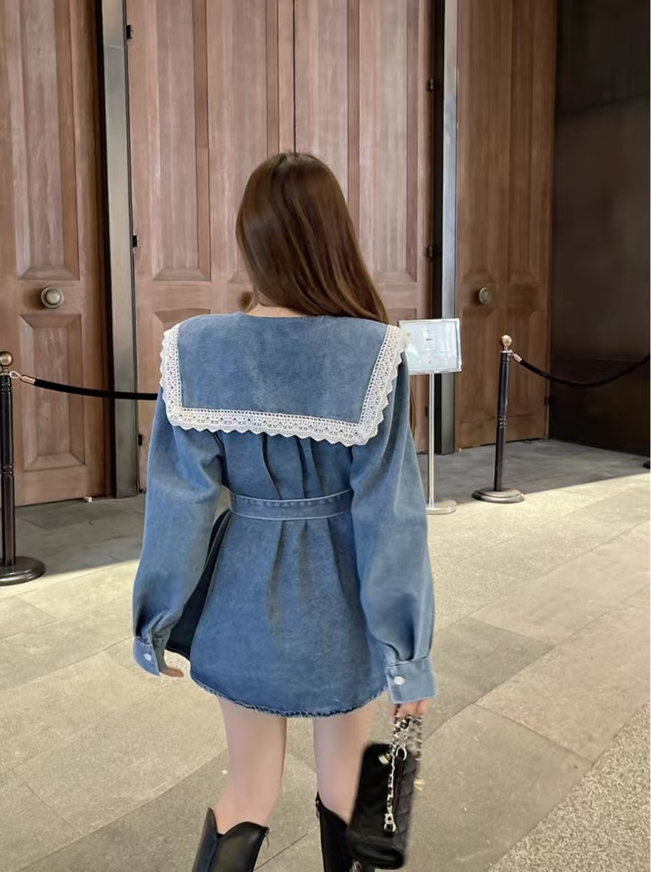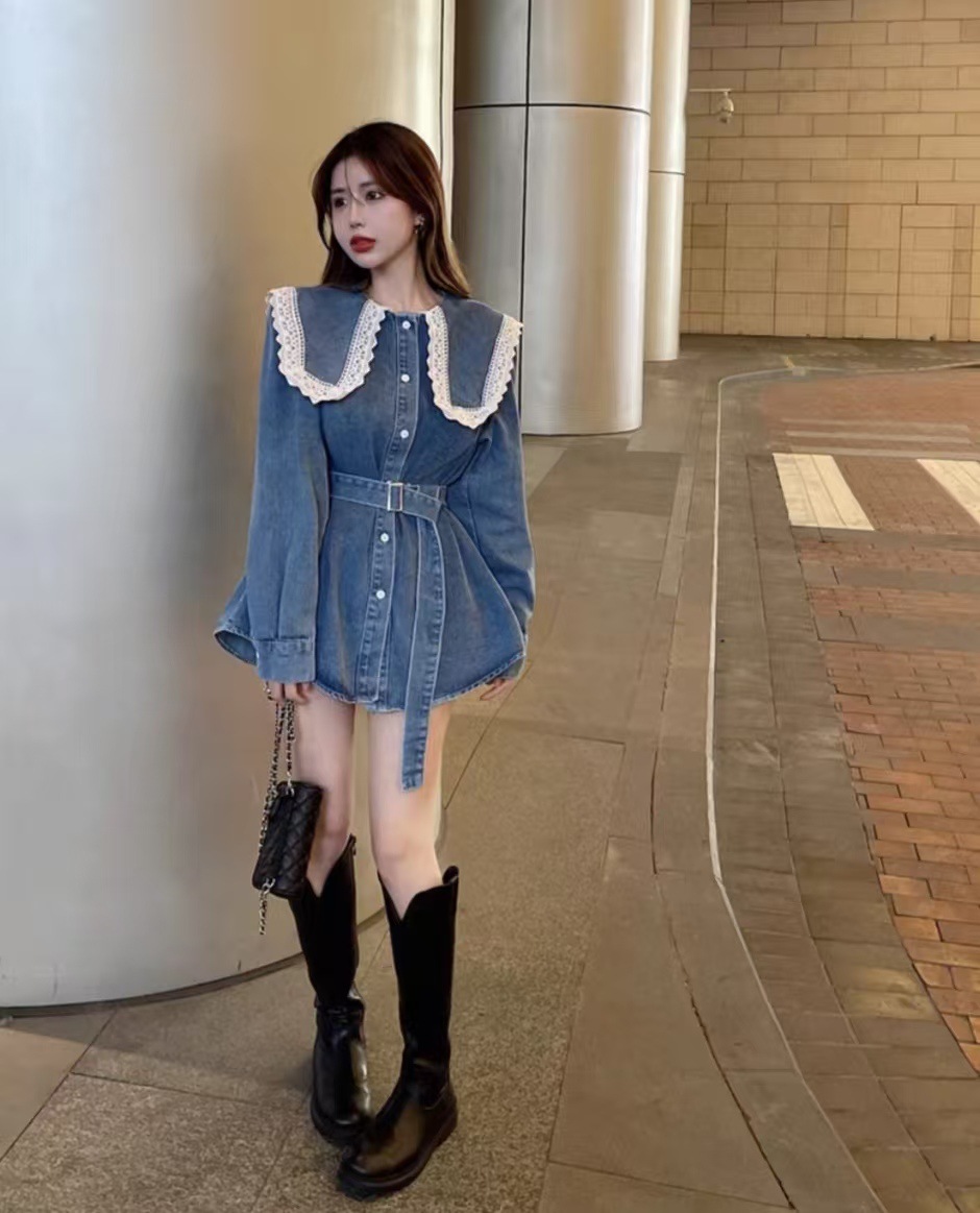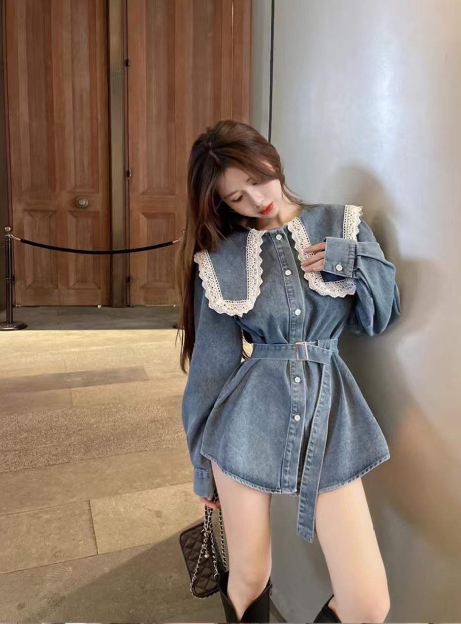 Womens Mid-length Denim Skirt With Long Sleeves And A Fitted Waist