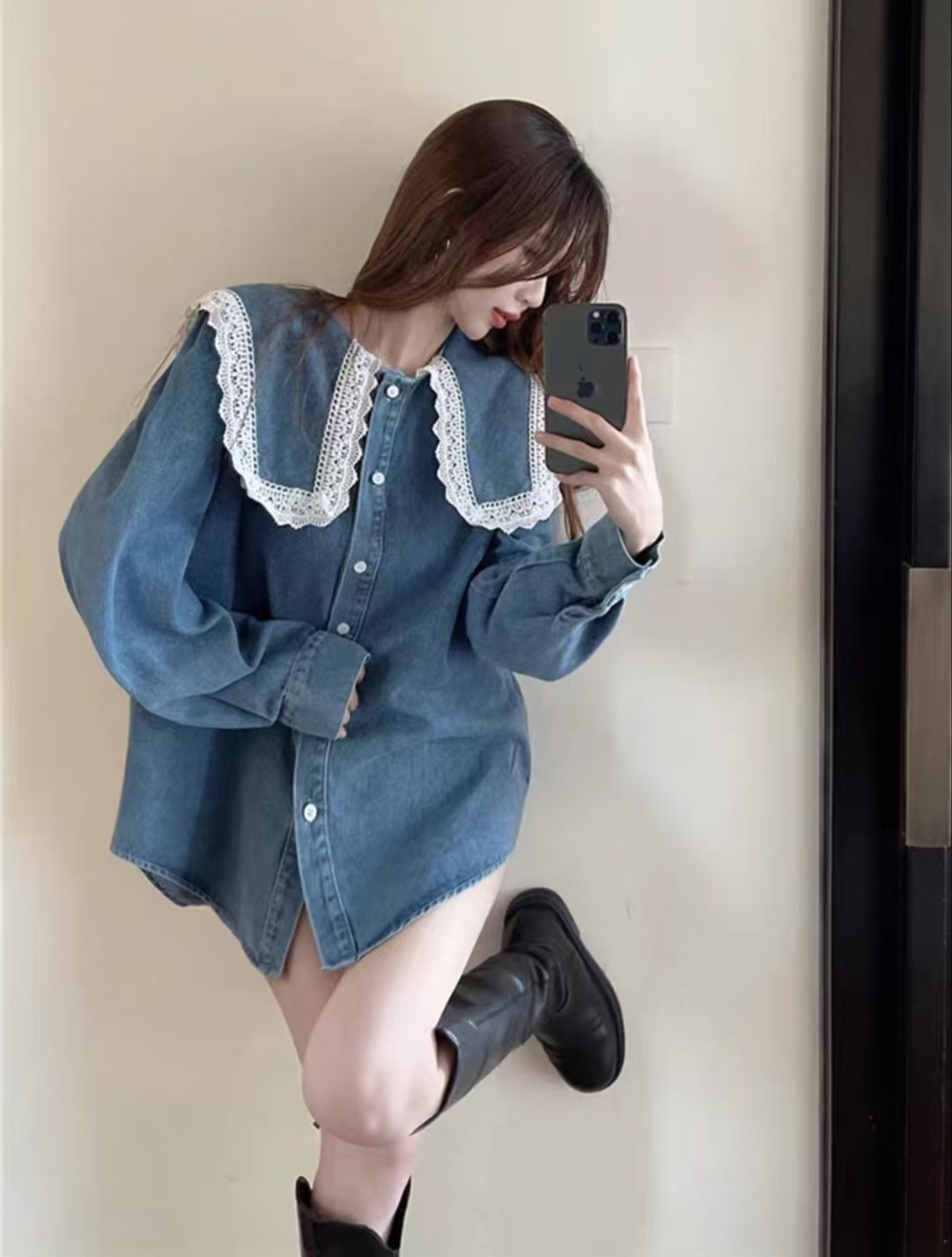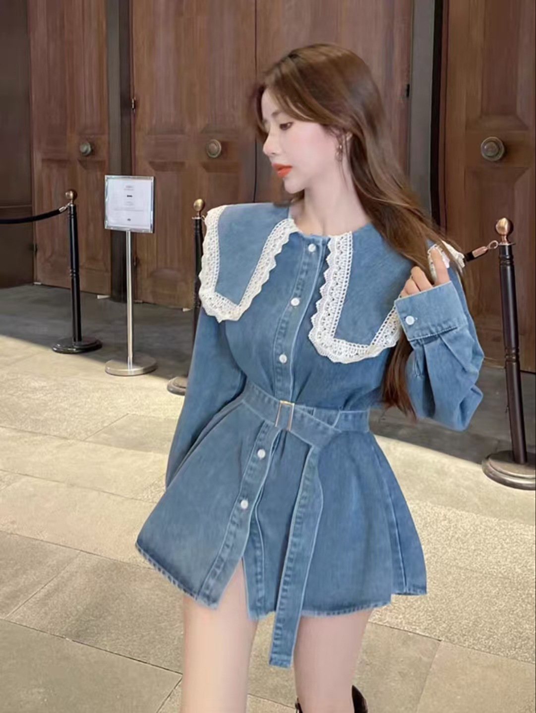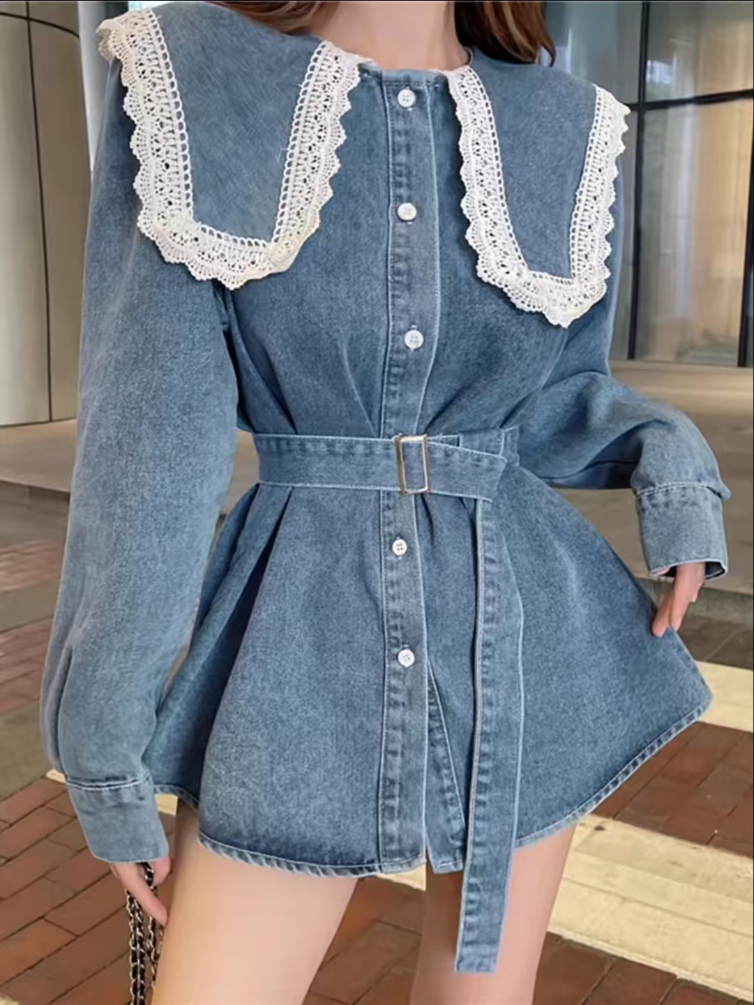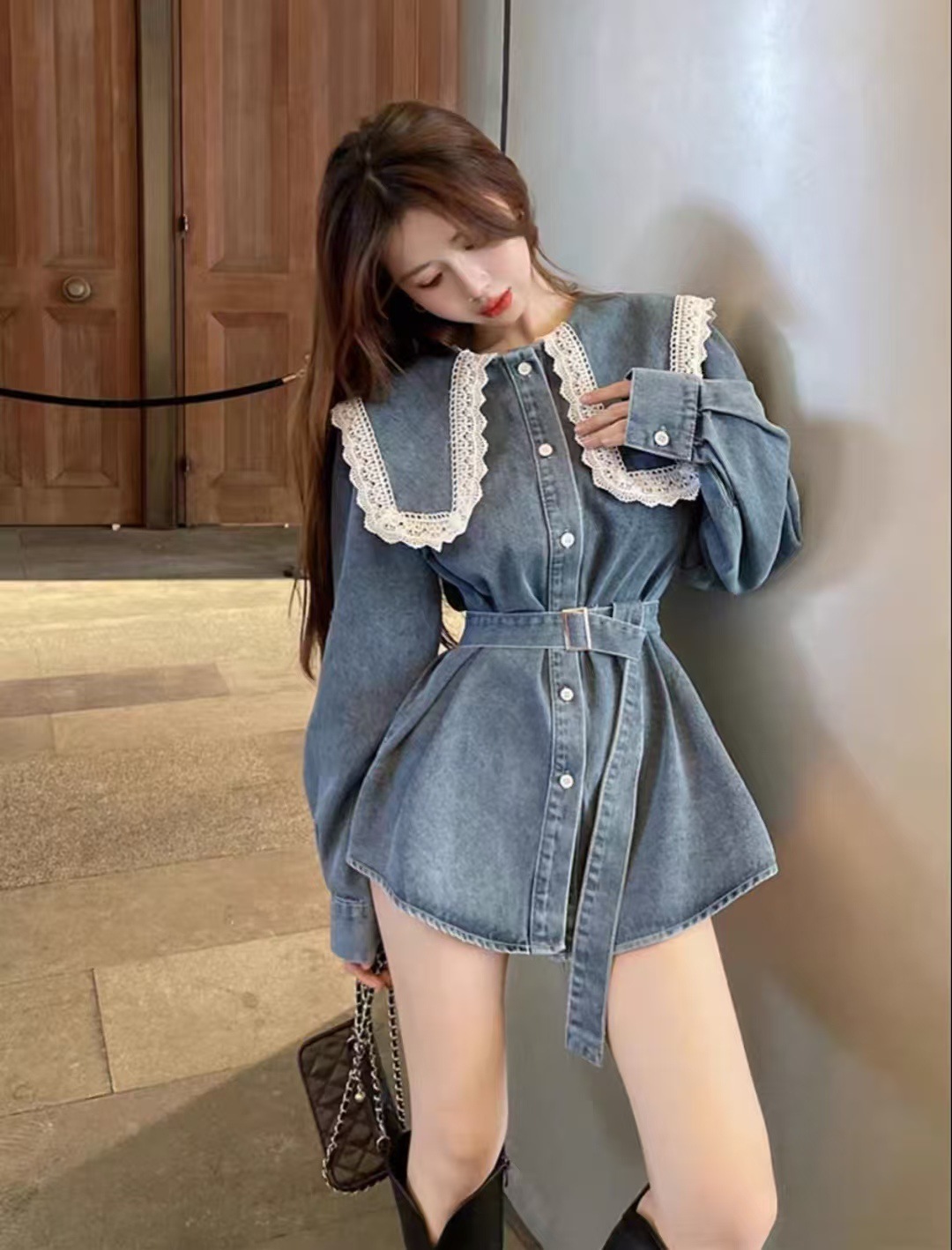 Womens Mid-length Denim Skirt With Long Sleeves And A Fitted Waist