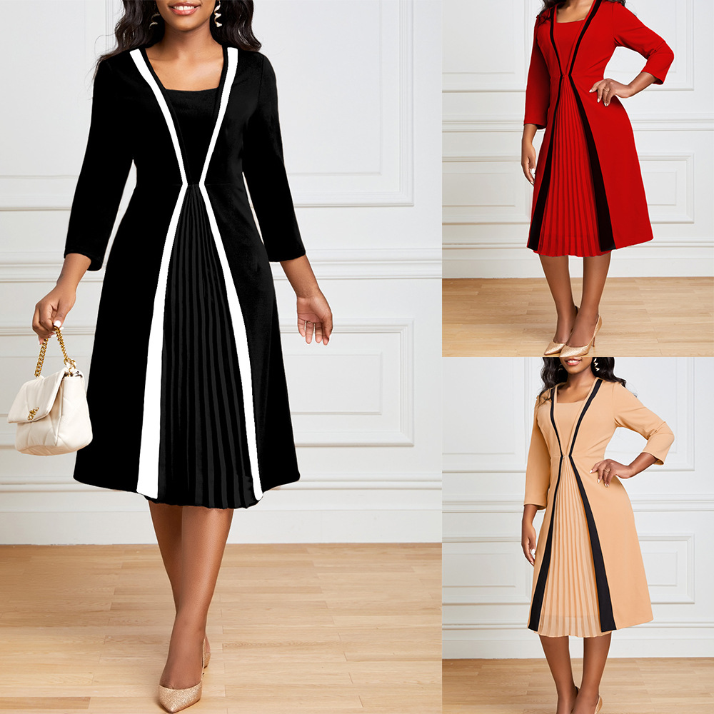 Elegant Faux Two-piece Pleated Dress With Three-quarter Sleeves For Women
