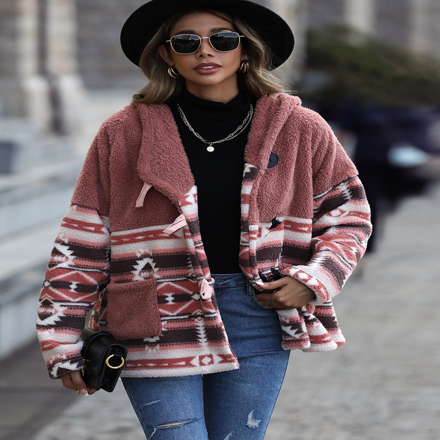New Casual Women's Hooded Long-sleeve Geometric Horn Button Jacket