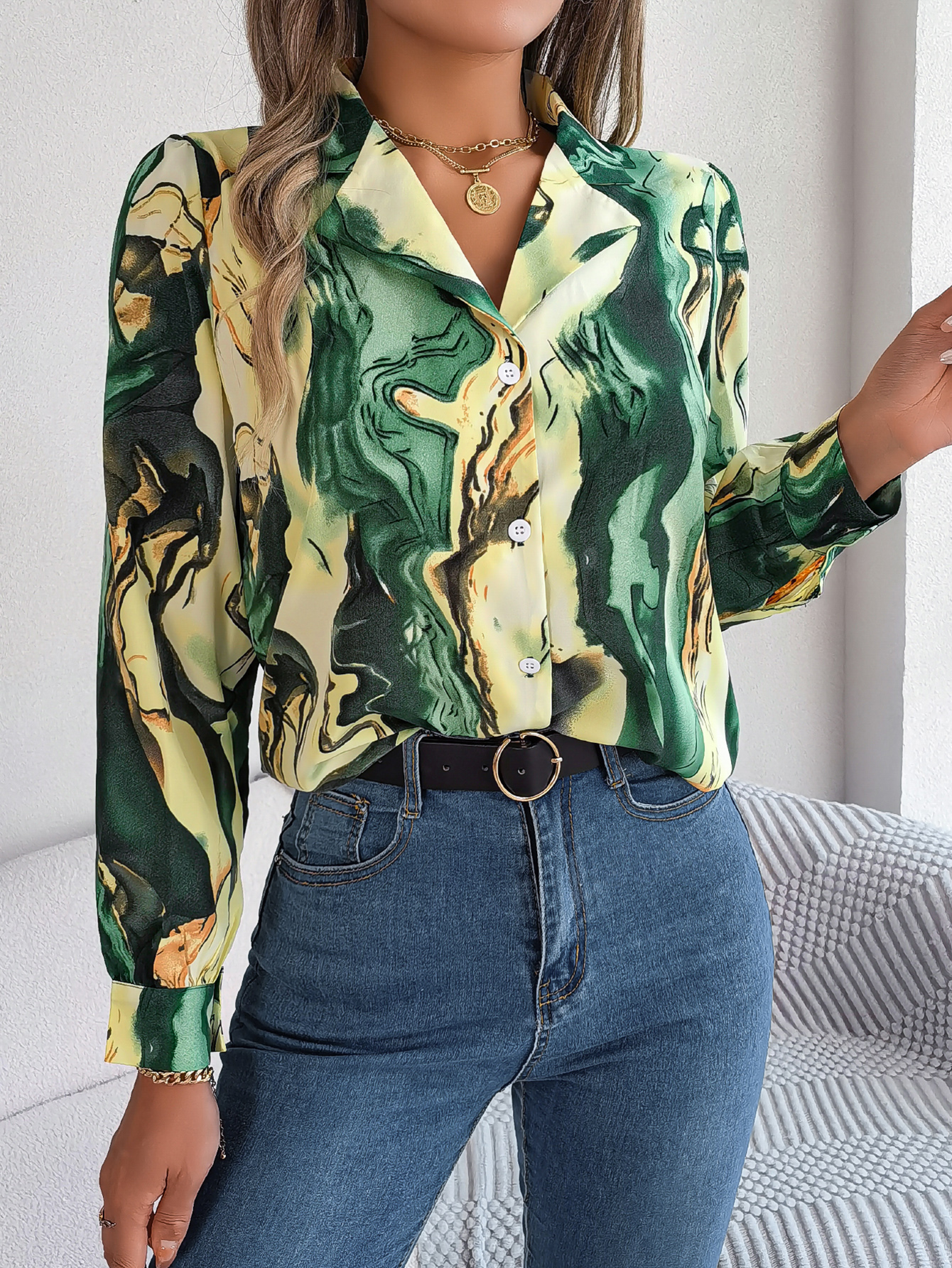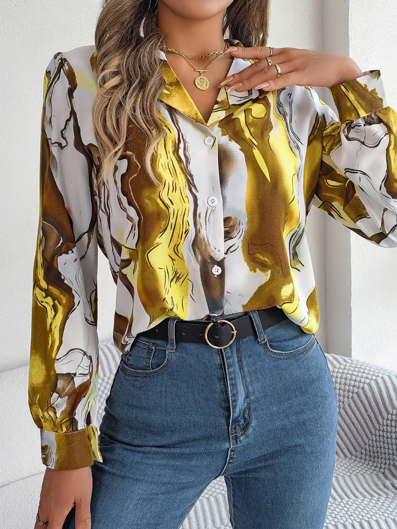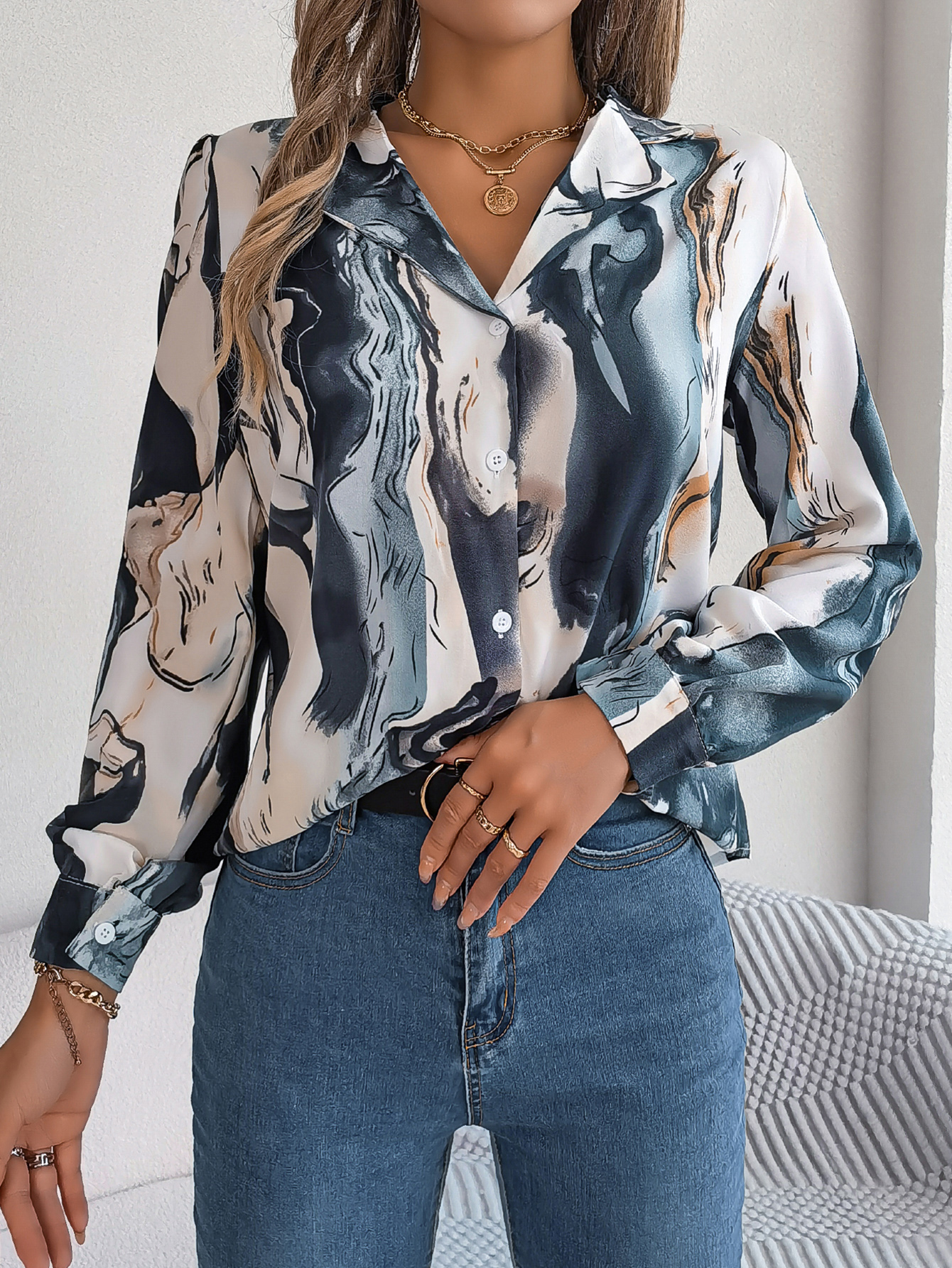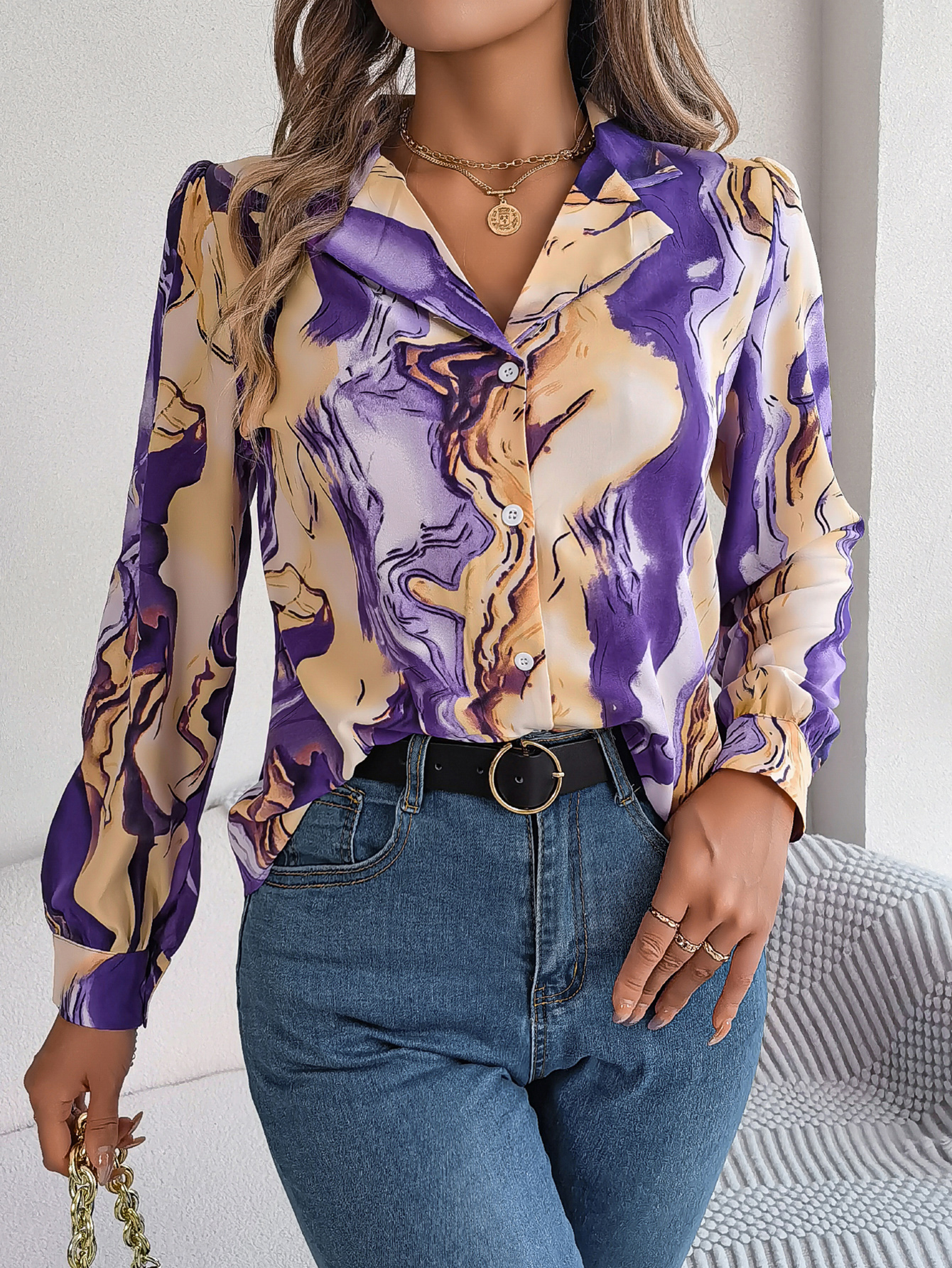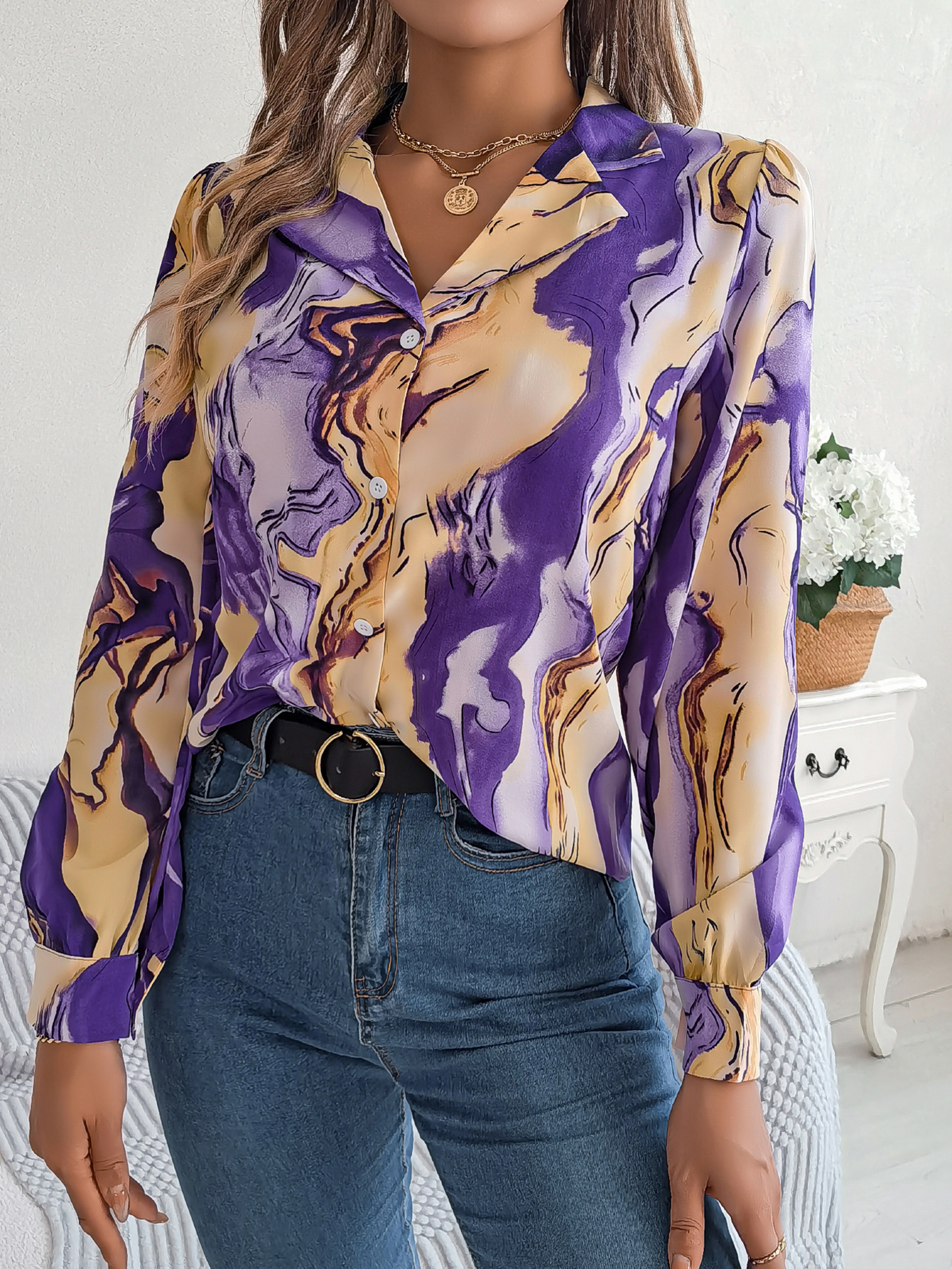 Women's Casual Color Block Stripe Notched Lapel Long Sleeve Shirt