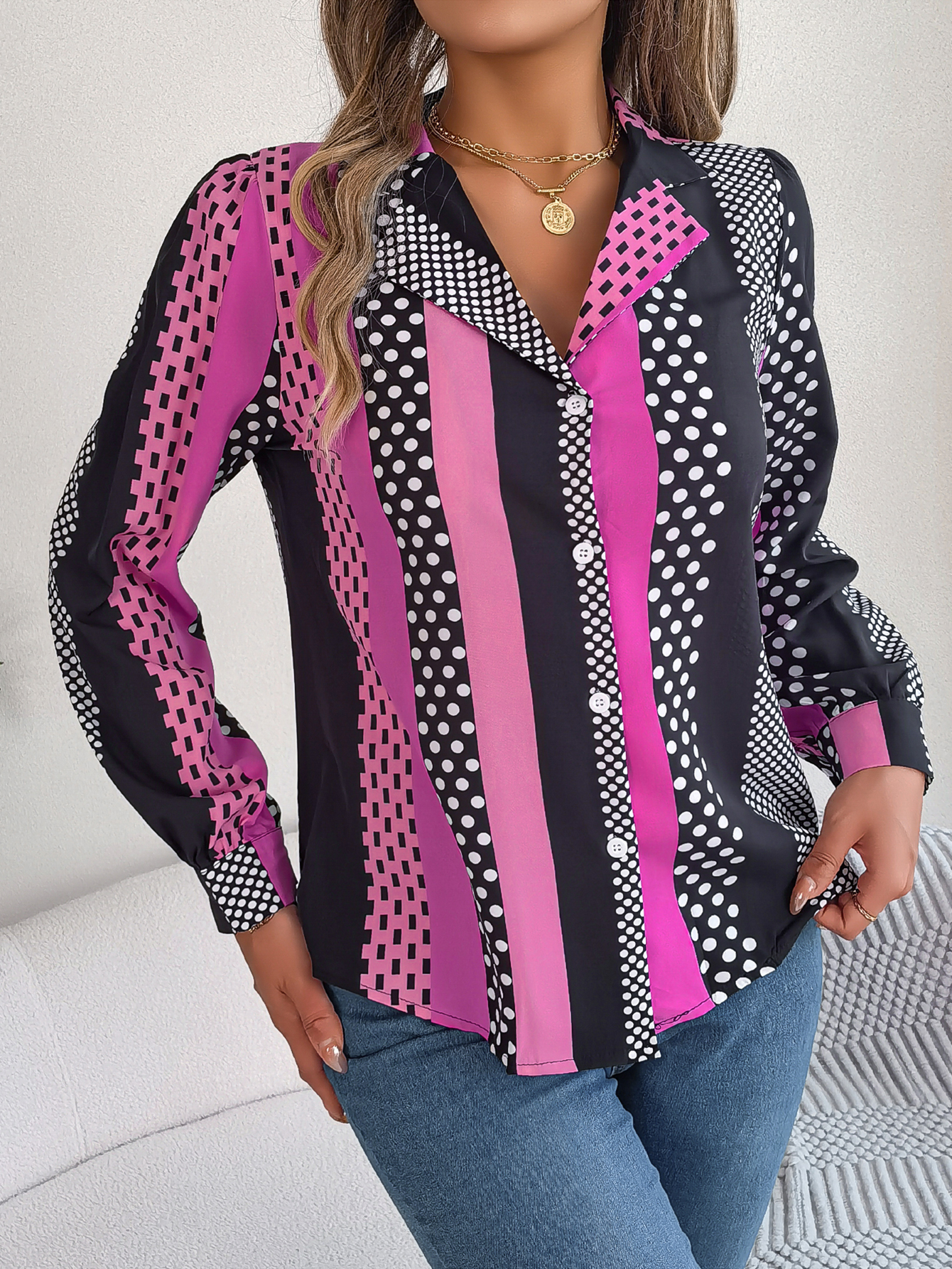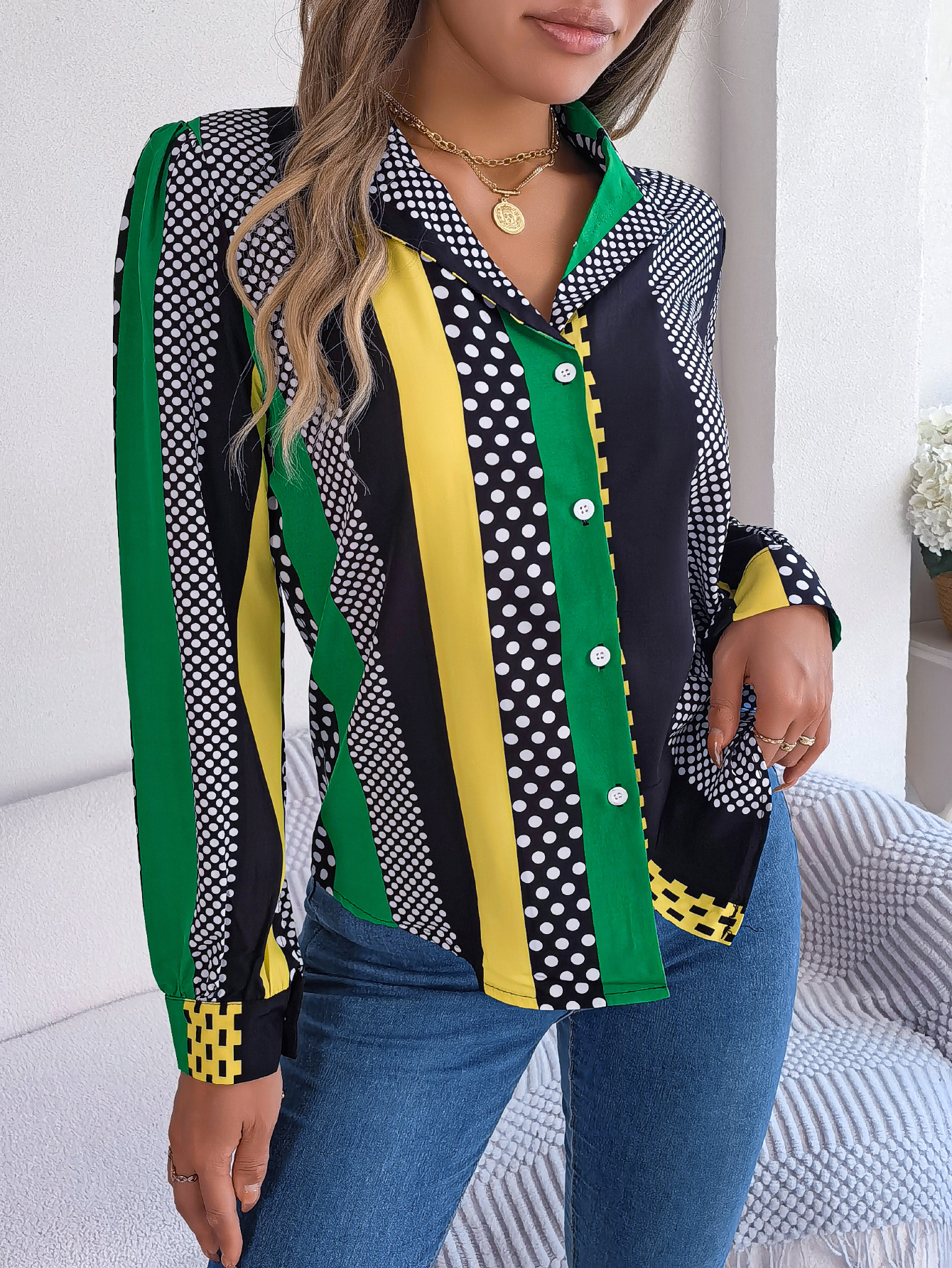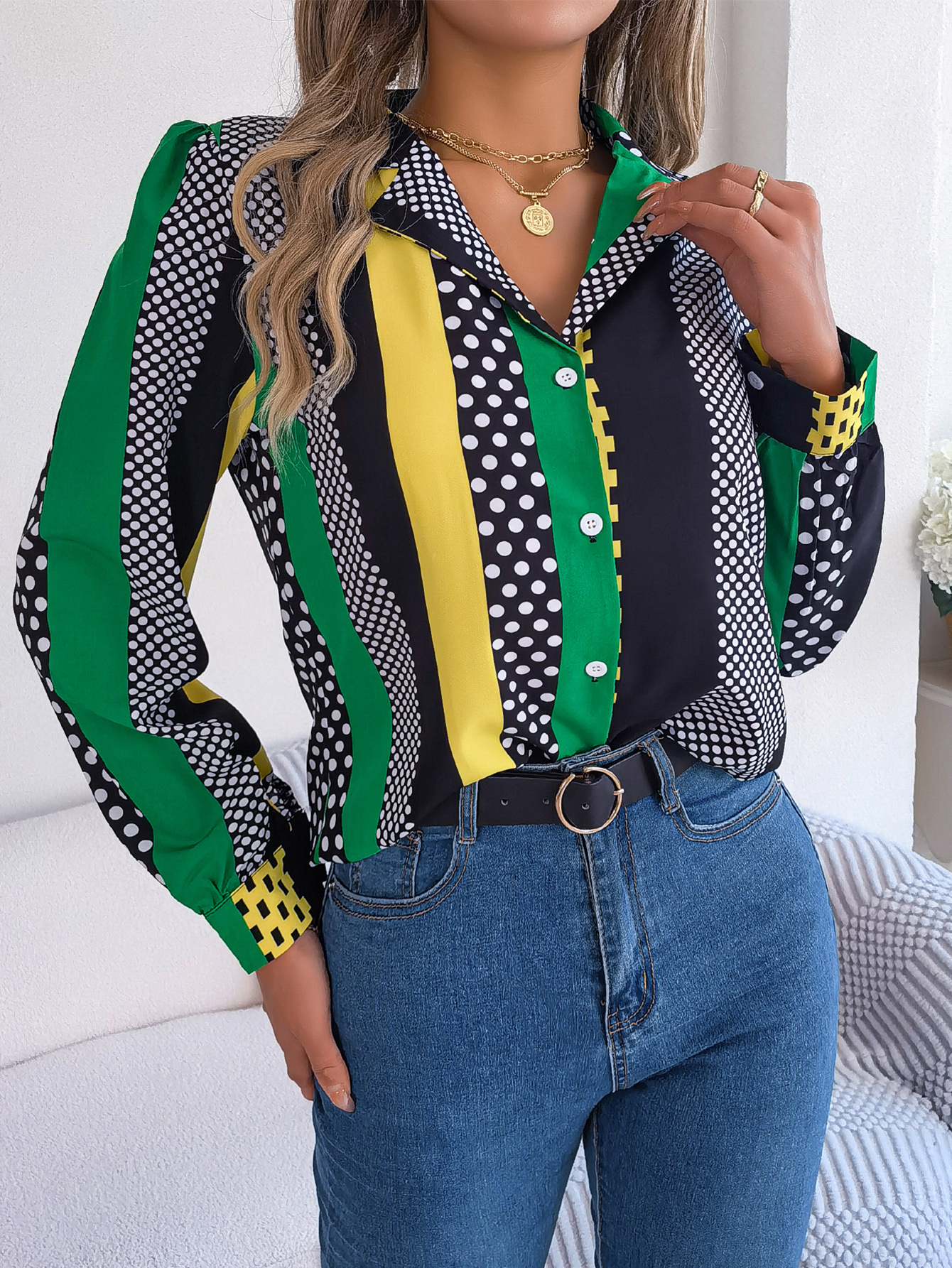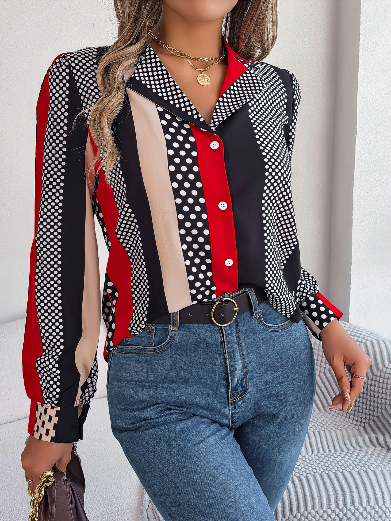 Women's Office Elegant Color Block Polka Dot Notched Lapel Long Sleeve Shirt