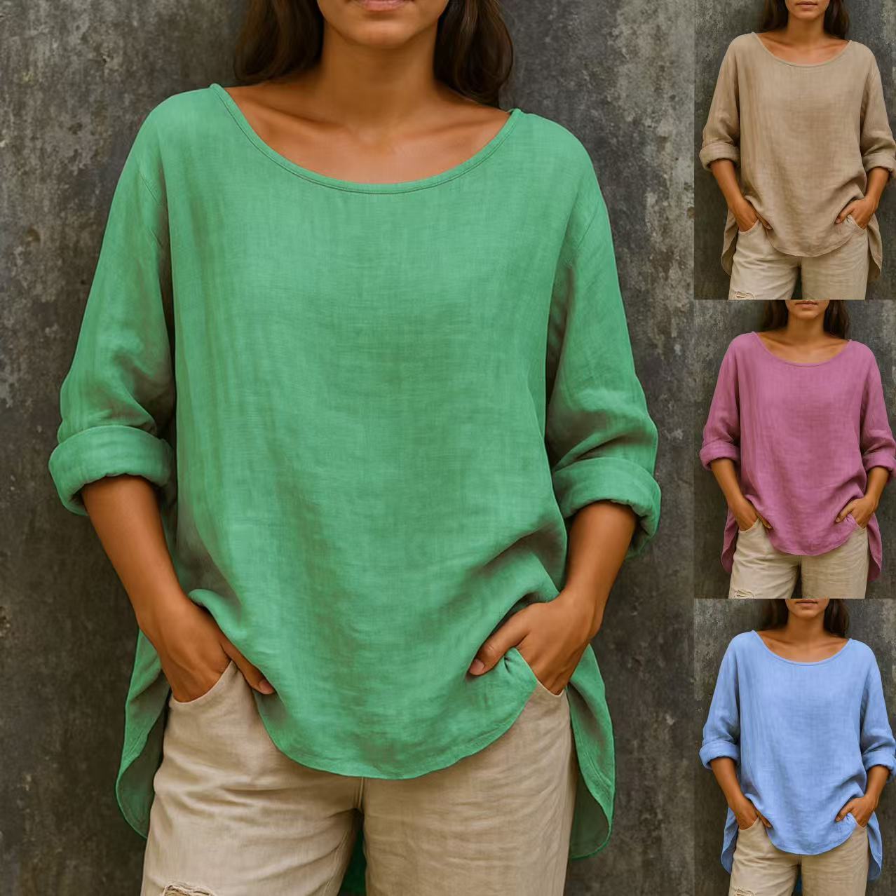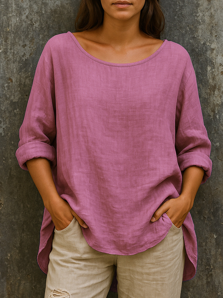Casual Loose-fit Fashionable Cotton-linen Retro Crew-neck Plus-size T-shirt