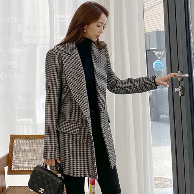 Double Breasted Loose Thin Thousand Bird Check Thickened Coat