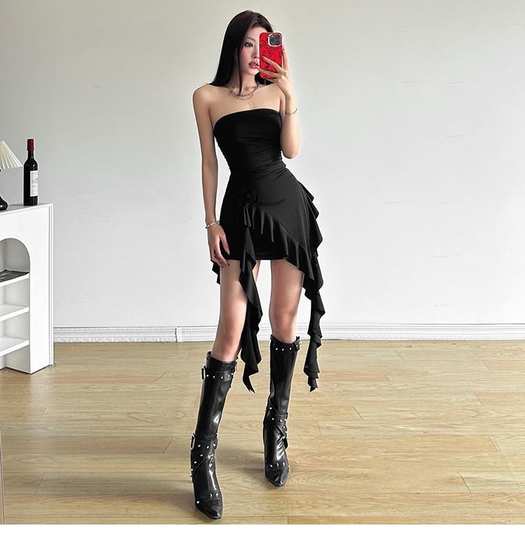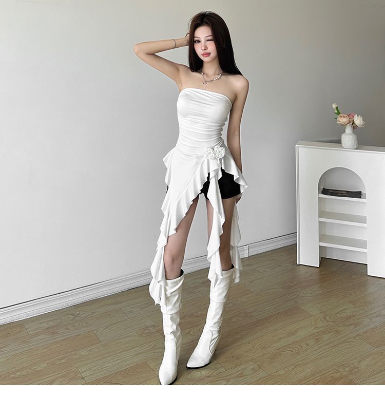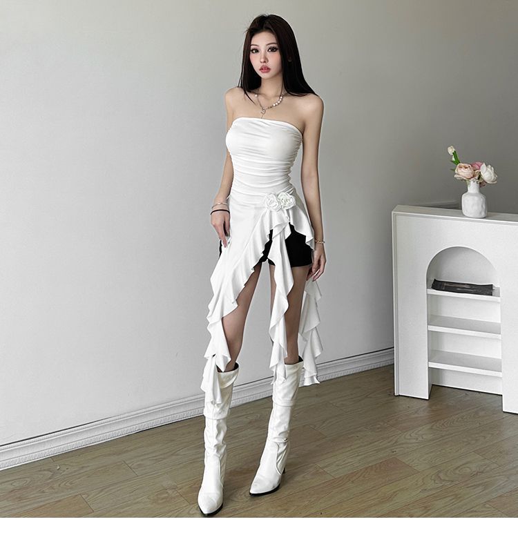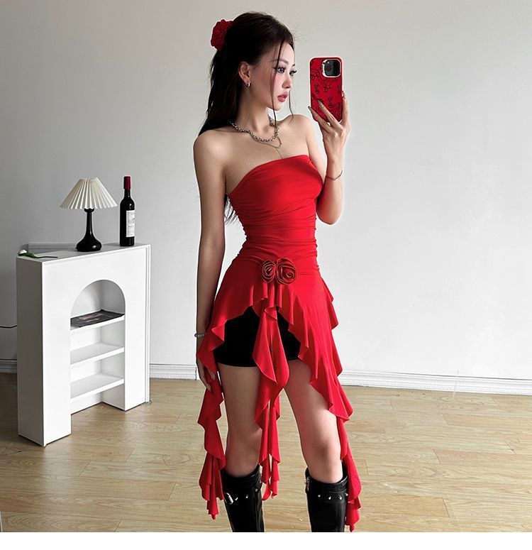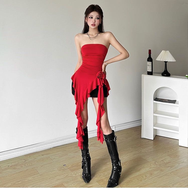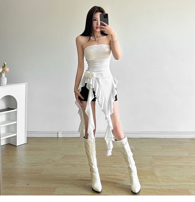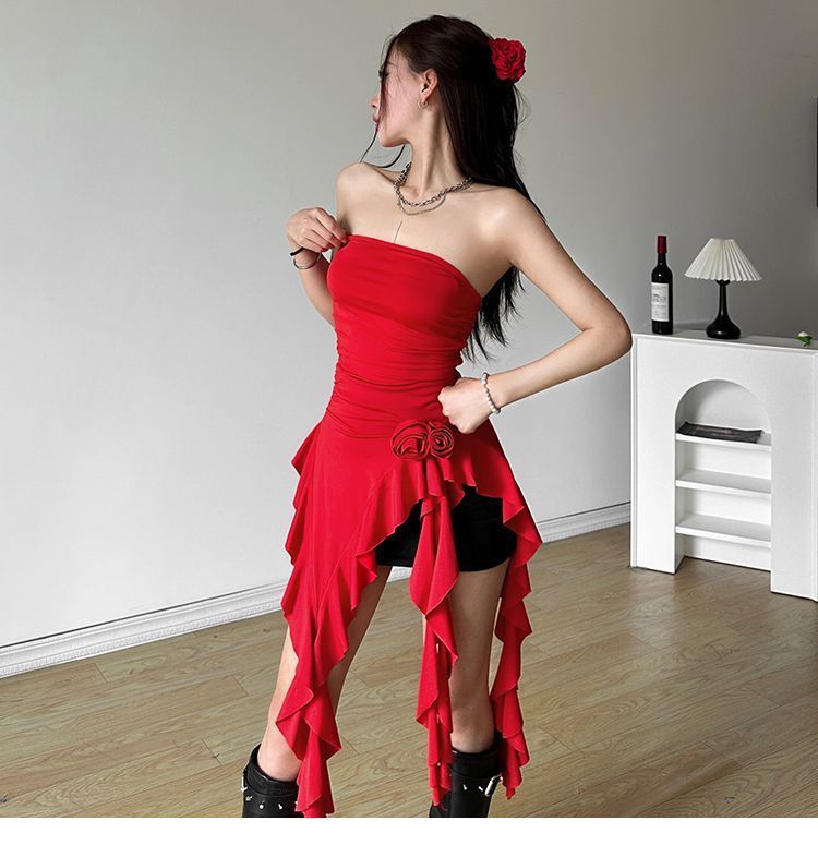 Floral And Lotus-leaf-trimmed Patchwork Tube Top For Women RuchedFigure-flattering Asymmetrically Designed Spicy-girl Top