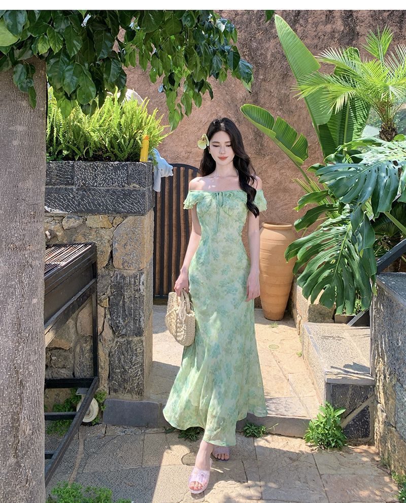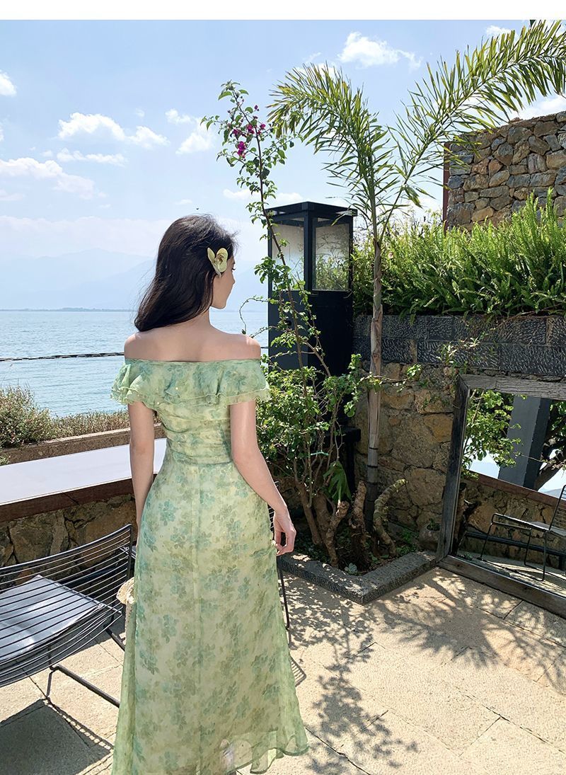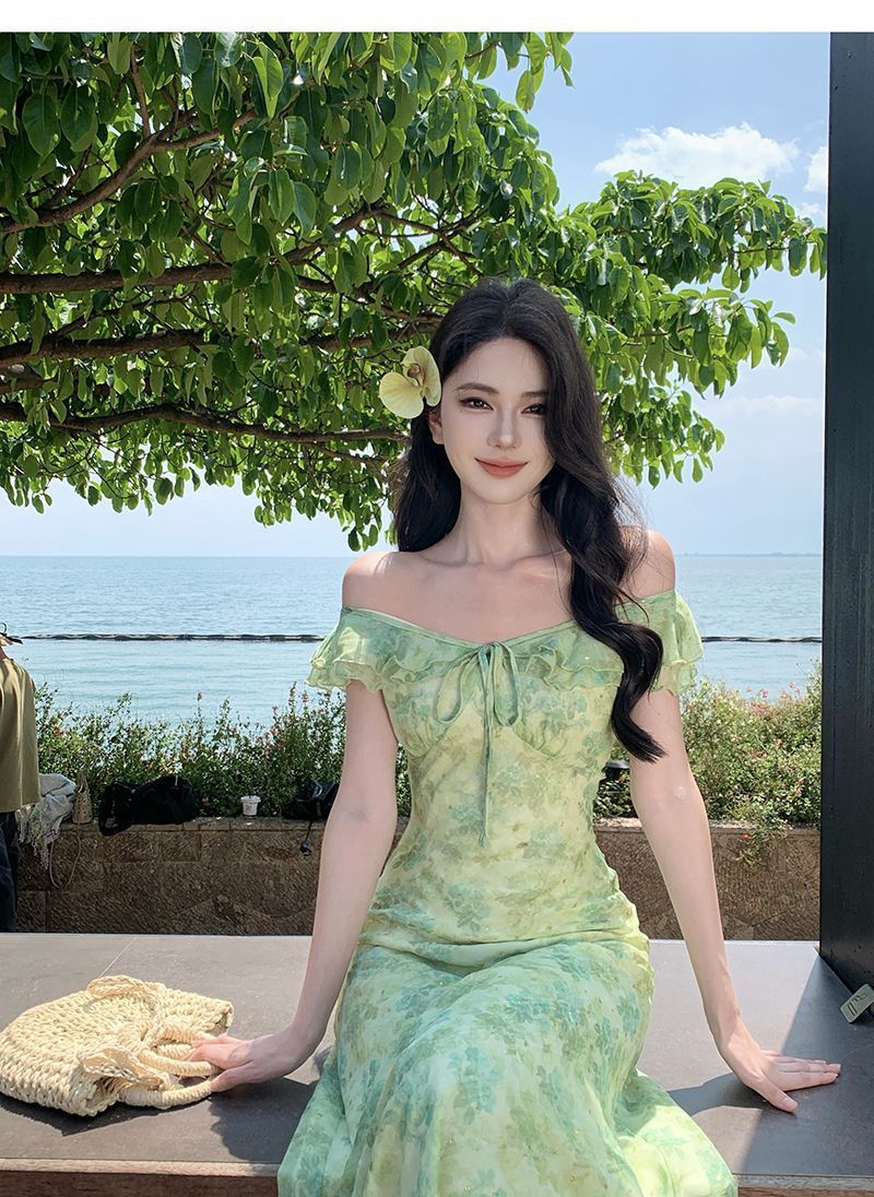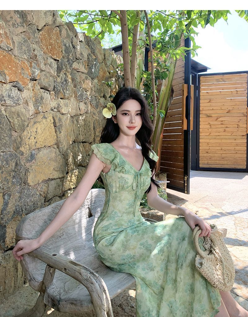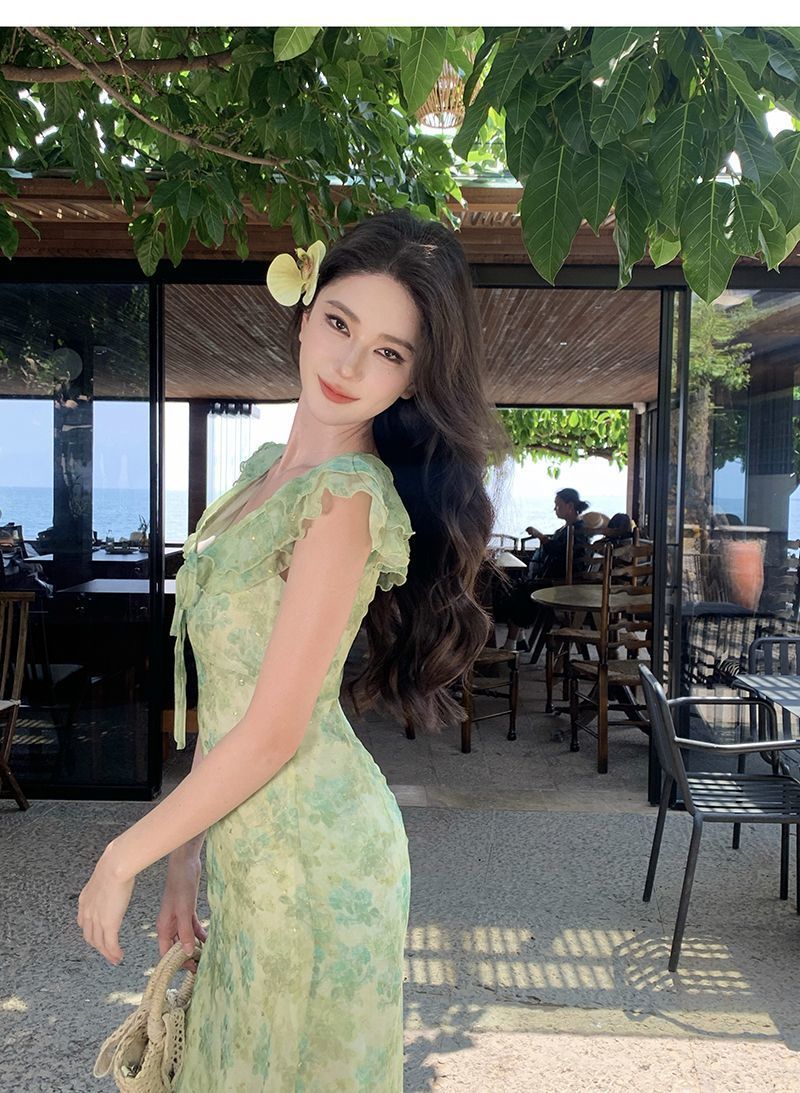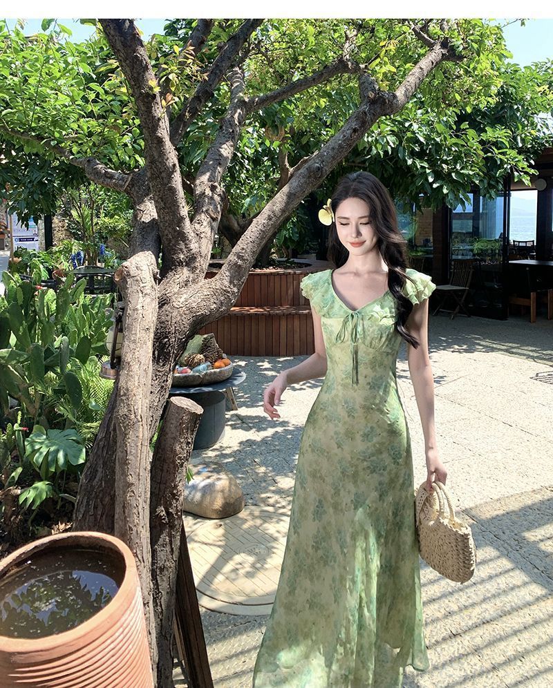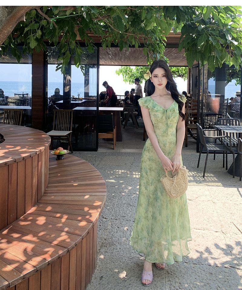 Fresh Beachy Getaway Dress In Green With A Dainty Floral Print And Cap Sleeves