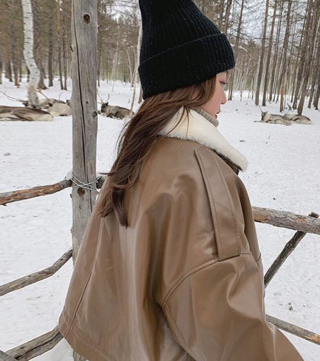 Light Brown Lapel Small Rabbit Fur Thick Loose Short Leather Jacket