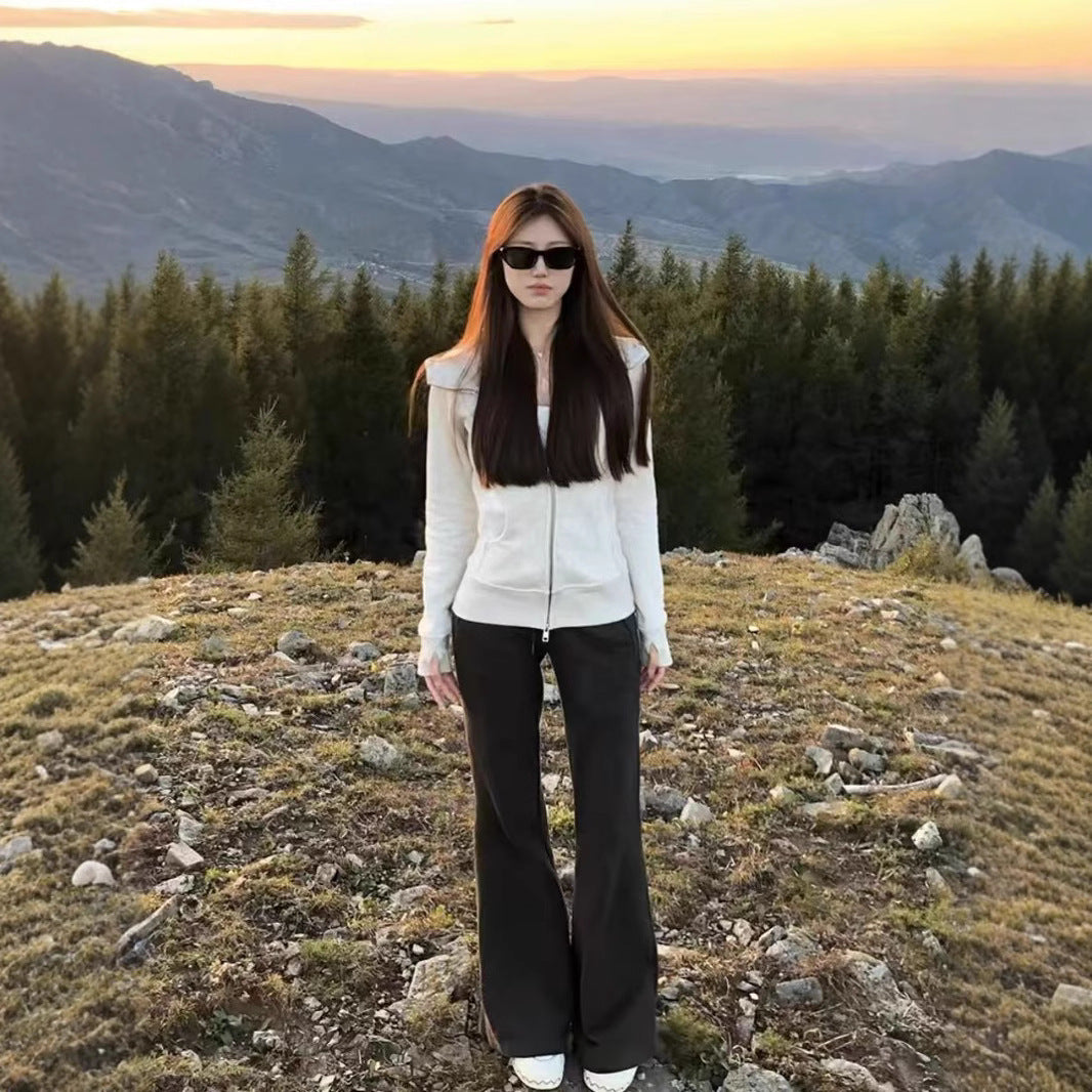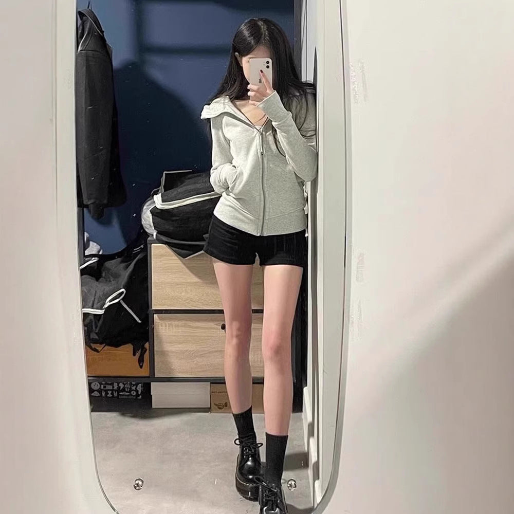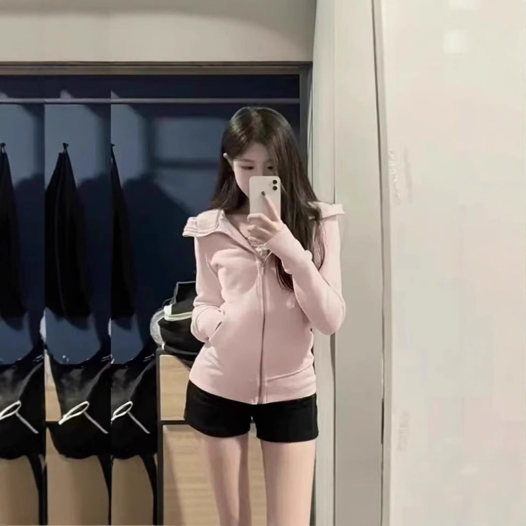 With Finger Buckle Hooded Slim Fit Waist Trimming Coat Zipper Cardigan Sweater