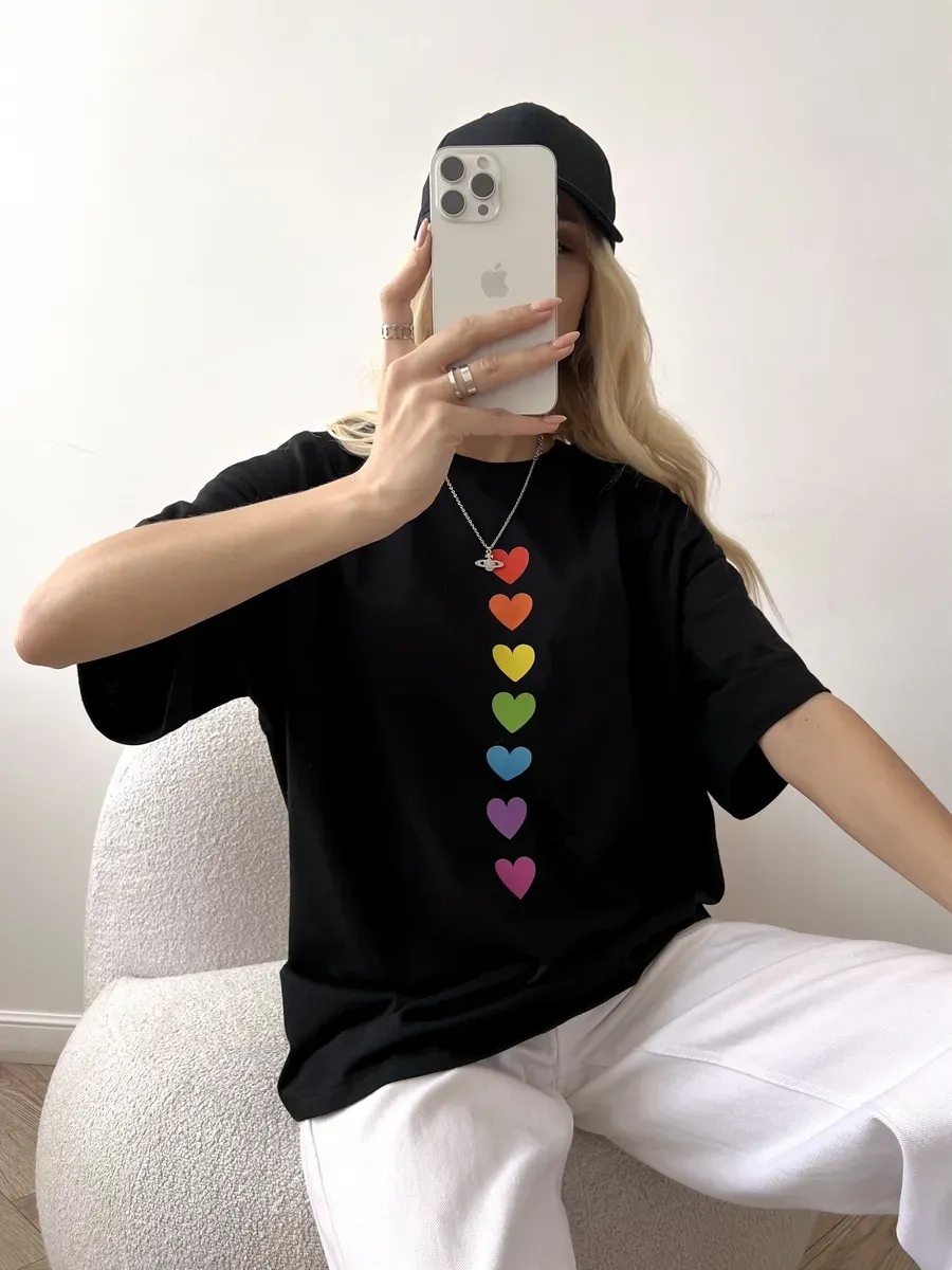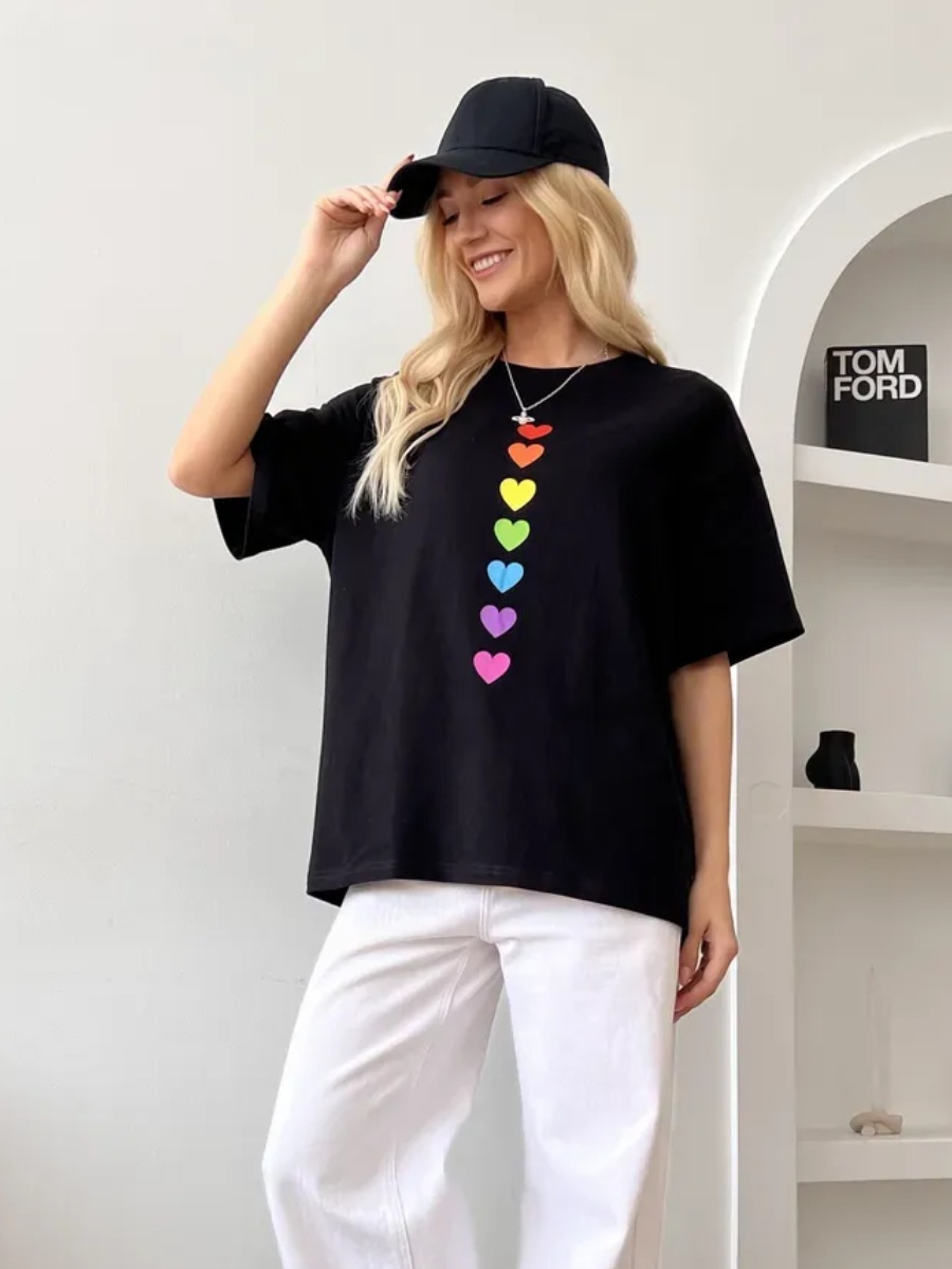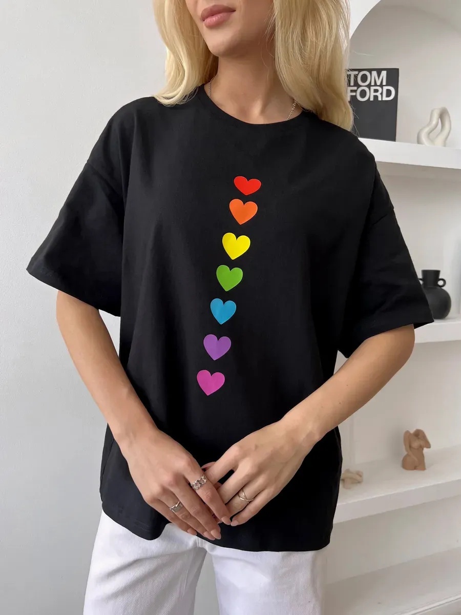 Colorful Dopamine Style Heart Print Short-Sleeve T Shirt With A Designer Touch