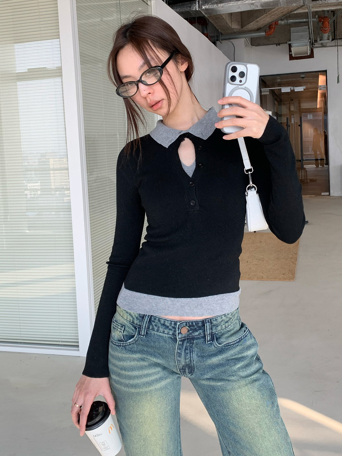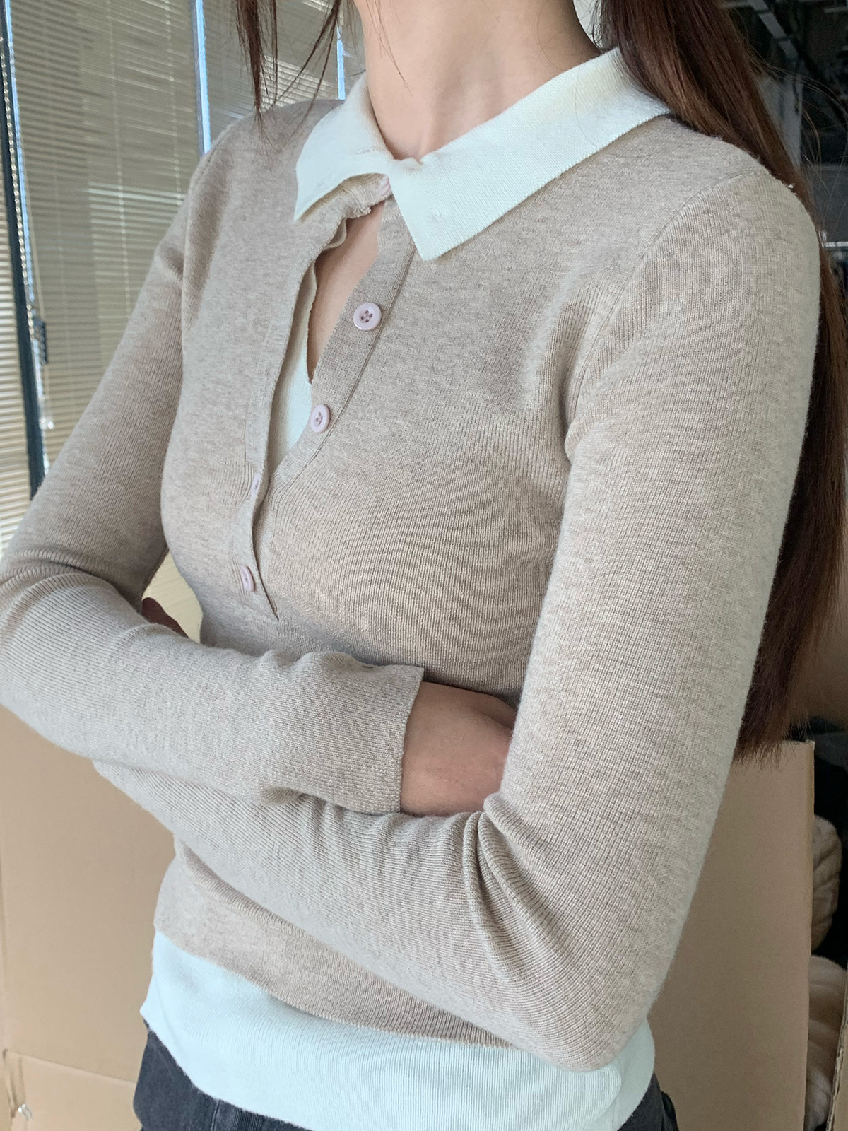 Korean Spring Stacked-Look Fake Two-Piece Color-Block Knit Sweater