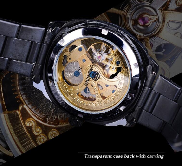 Special function decoration Display type pointer for the crowd male style fashion Waterproof, waterproof, 10m Movement type Machinery Movement origin China Bottom type Through the bottom Mirror material Mineral tempered glass mirror Buckle style Butterfly double button Buckle material Stainless steel Strap material stainless steel dial shape round case material stainless steel Color black shell gold face