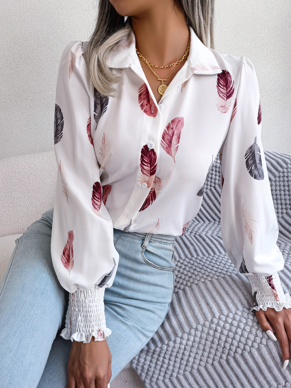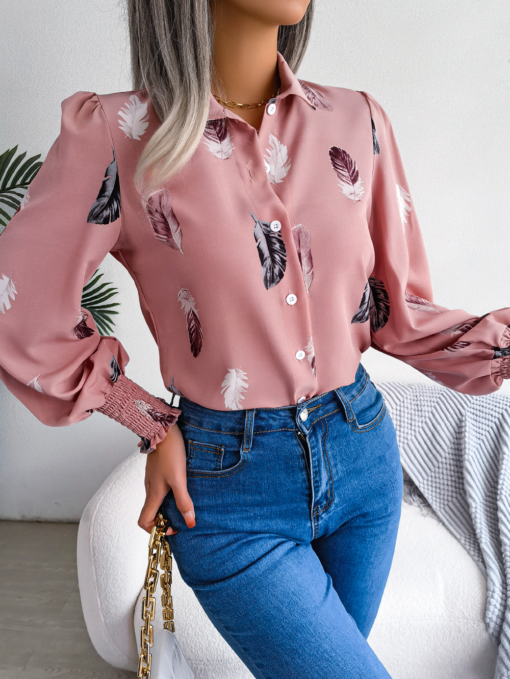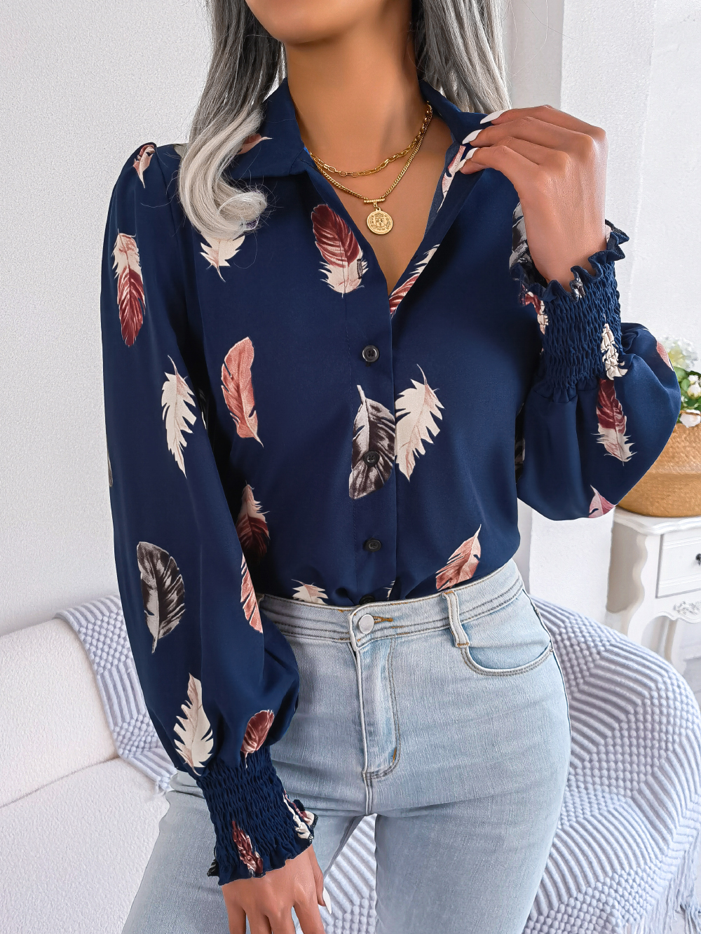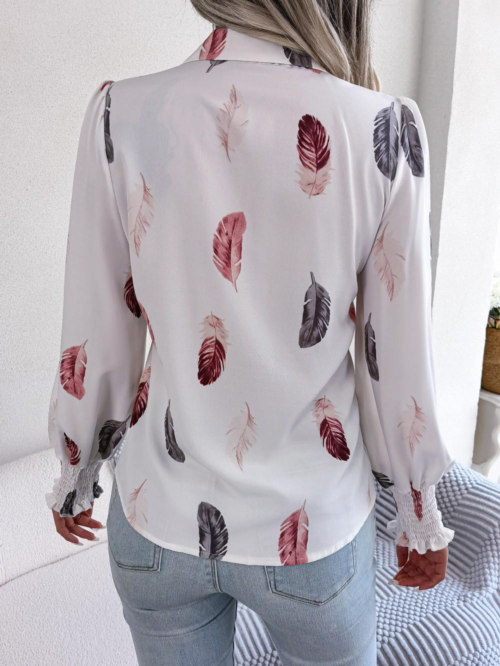 Women's Elegant Feather Lantern Sleeve Lapel Shirt