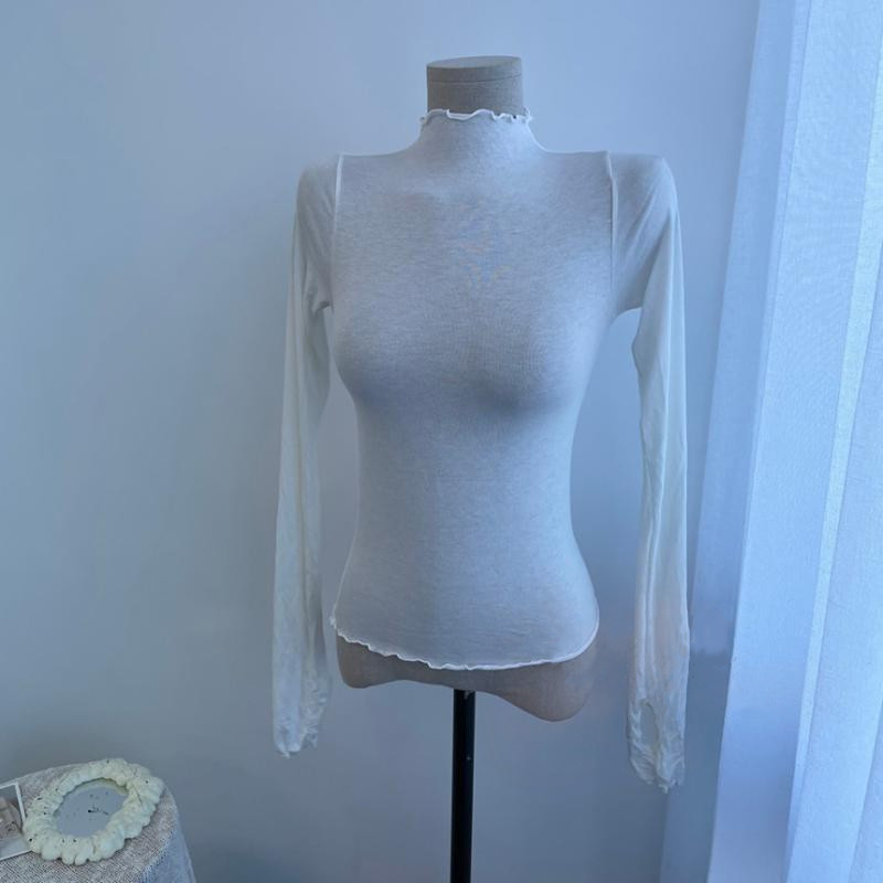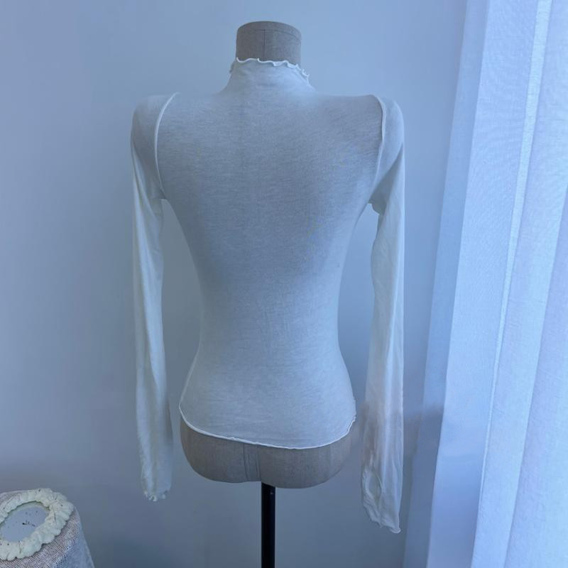 Women's Solid-Color Casual Sheer High-Neck Long-Sleeve Top