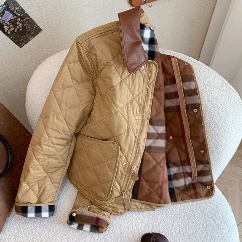 Retro Plaid Stitching Leather Lapel Cotton Coat Jacket Women