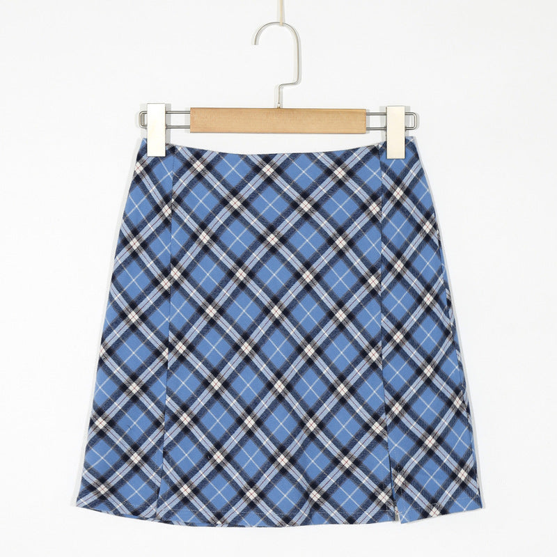Blue Diagonal Plaid High Waist Bag Hip Slit Short Skirt