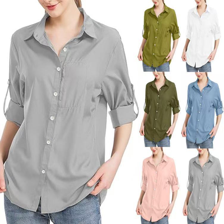 Women's Solid Color Business Lapel Zipper Pocket Long Sleeve Shirt