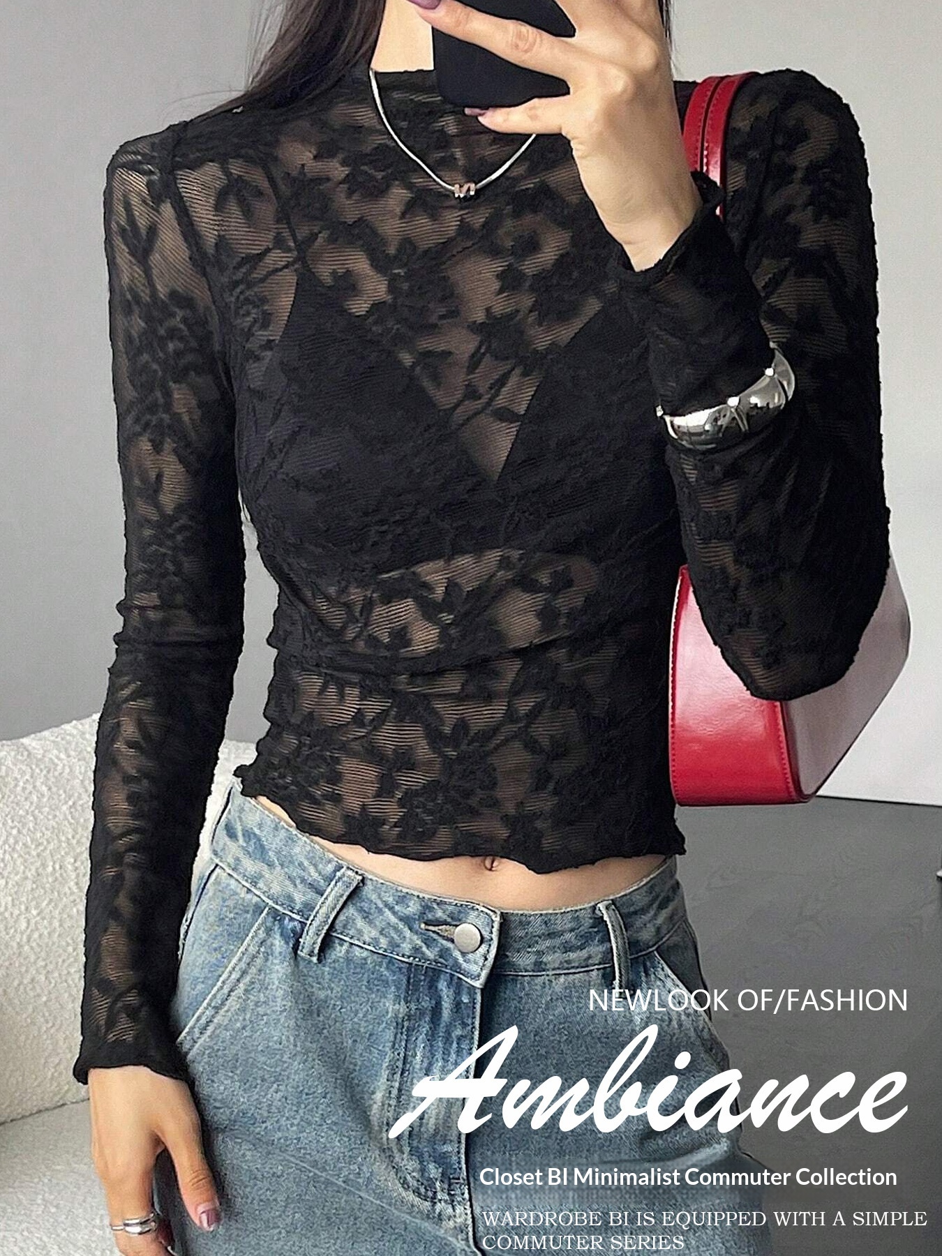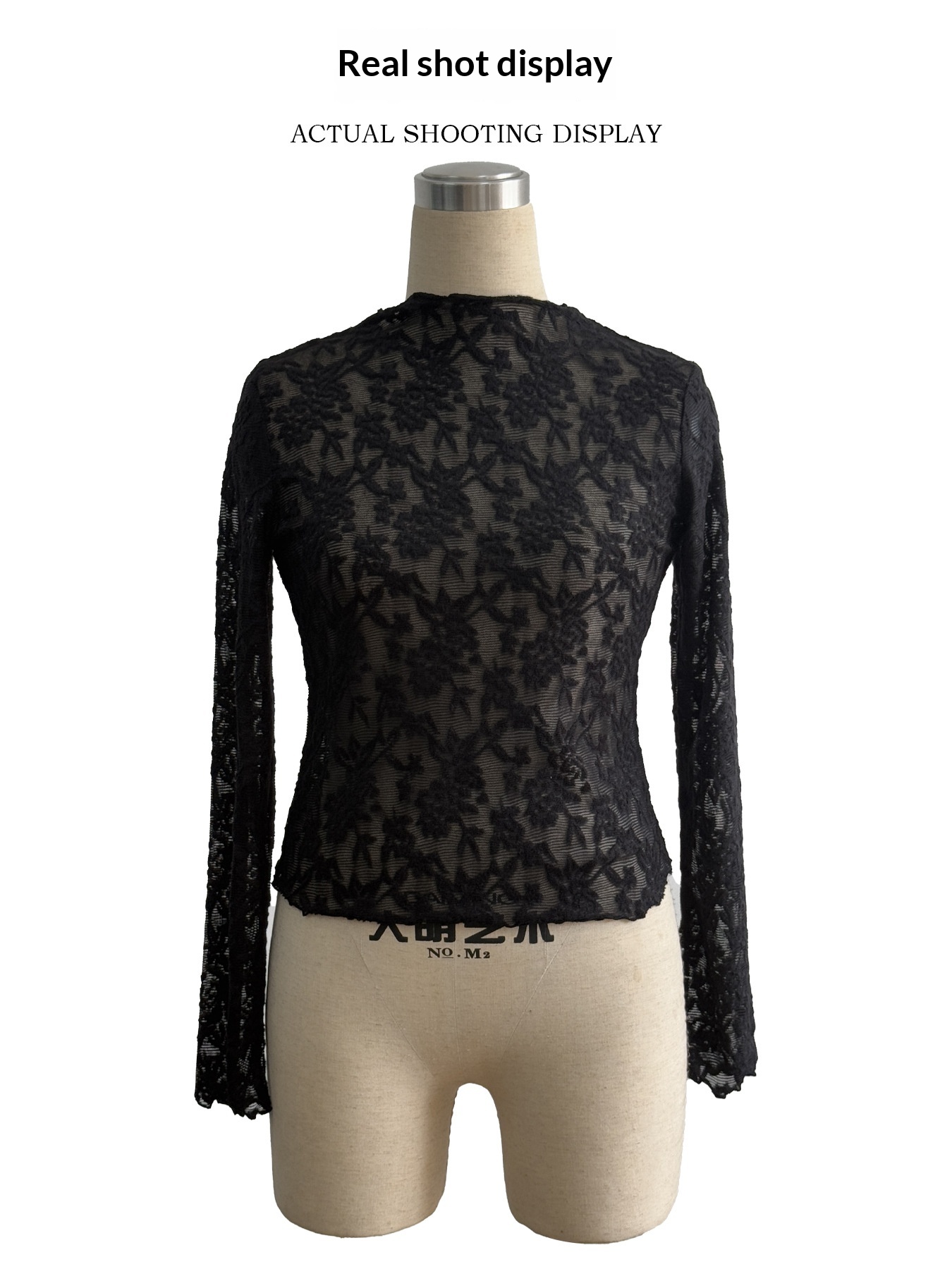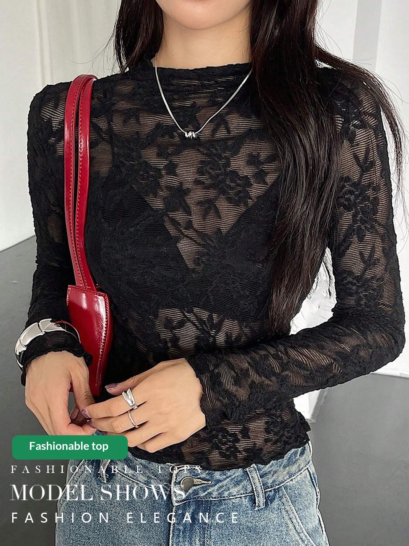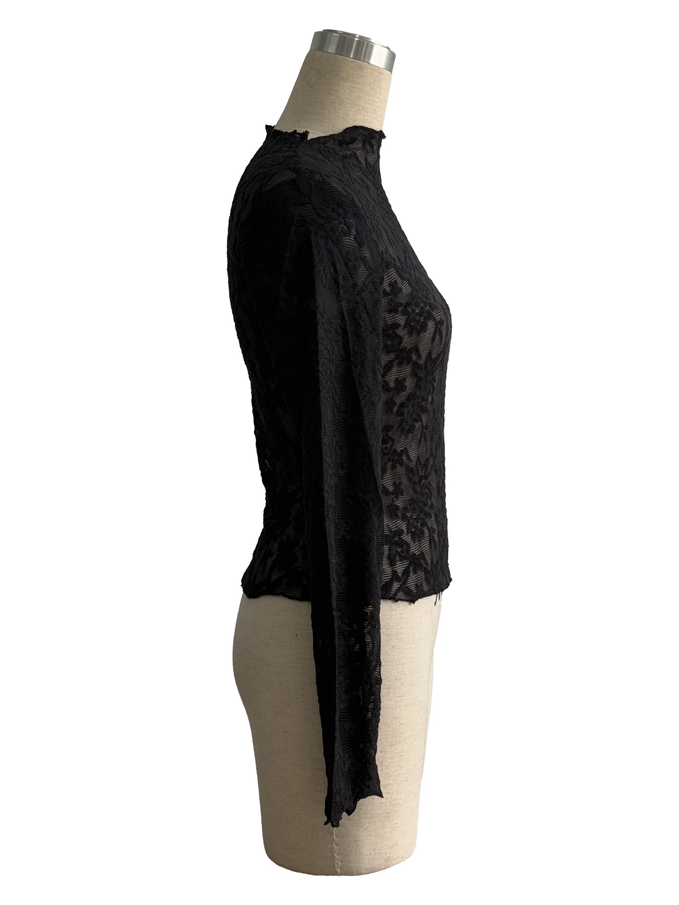 Womens Stand-Up Collar Sheer Lace Bodycon Long-Sleeve T-Shirt
