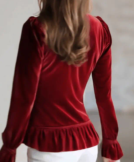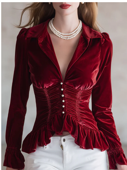 Fashionable And Retro Red Velvet Pleated Long-sleeved Shirt
