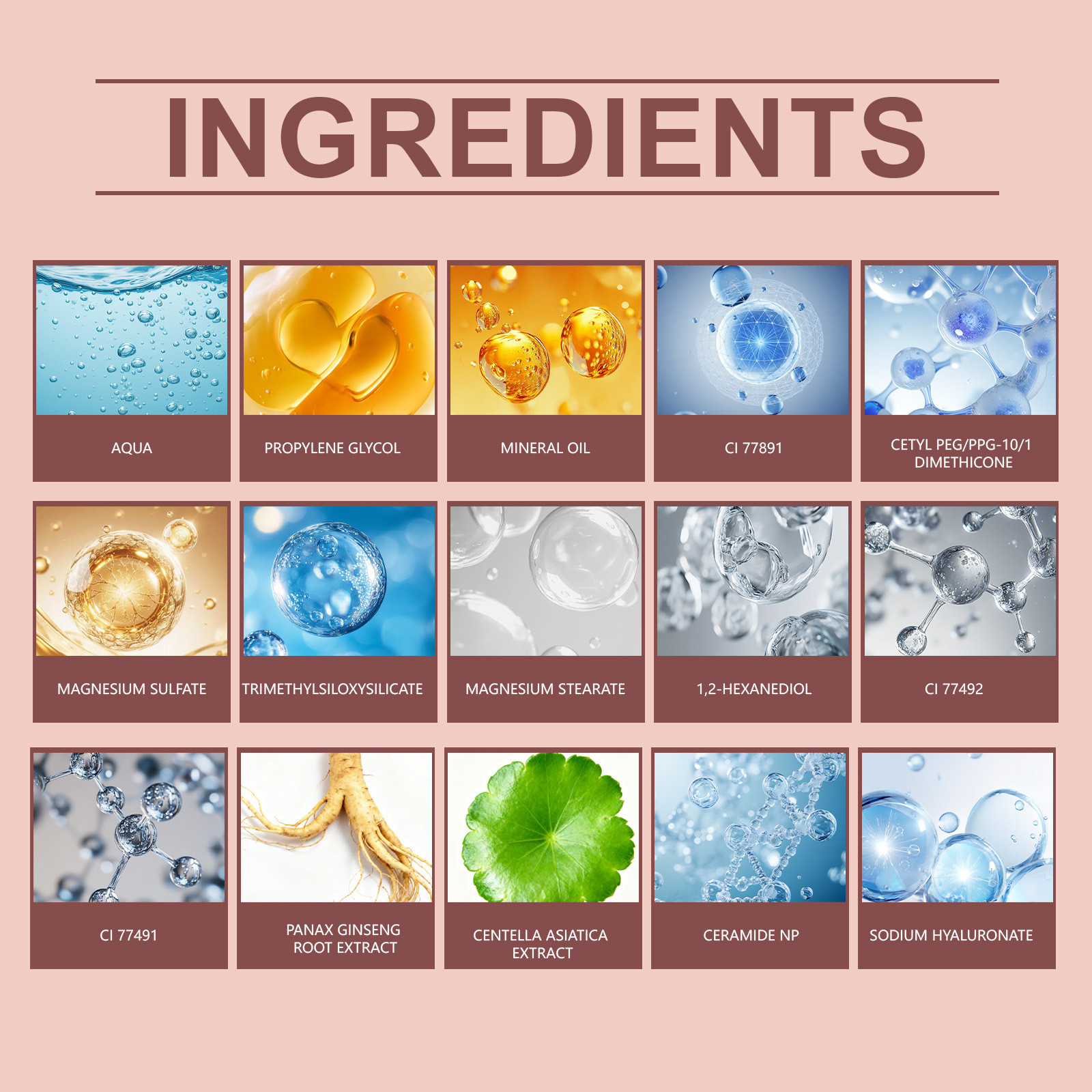 Ingredients: water, propylene glycol, mineral oil, CI 77891, cetyl PEG/PPG-10/1 polydimethylsiloxane, magnesium sulfate, trimethylsiloxy silicate, magnesium stearate, 1,2-hexanediol, CI 77492, CI 77491, ginseng root extract, Centella asiatica extract, ceramide NP, sodium hyaluronate.